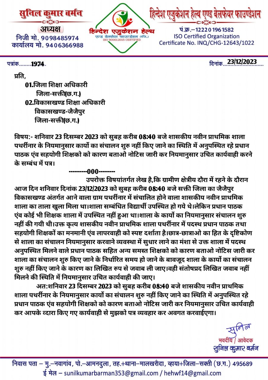 उक्त विद्यालय में प्रधान पाठक सहित सहयोगी शिक्षक अनुपस्थित मिले।छात्र-छात्राओं का हित के दृष्टिकोण से व्यवस्था में सुधार लाने नियमानुसार विद्यालय के कार्यो का संचालन जारी रखने के समय पर उपस्थित नहीं मिलने नदारद रहने वाले विद्यालय के प्रधान पाठक एंव सहयोगी शिक्षको को कारण बताओ नोटिस जारी कर नियमानुसार उचित कार्यवाही करने डीईओ सक्ती एंव बीईओ जैजैपुर को हिन्देश एजुकेशन हेल्थ एण्ड वेलफेयर फाउण्डेशन (रजिस्टर्ड) के अध्यक्ष सुनिल कुमार बर्मन ने पत्र लिखा है।