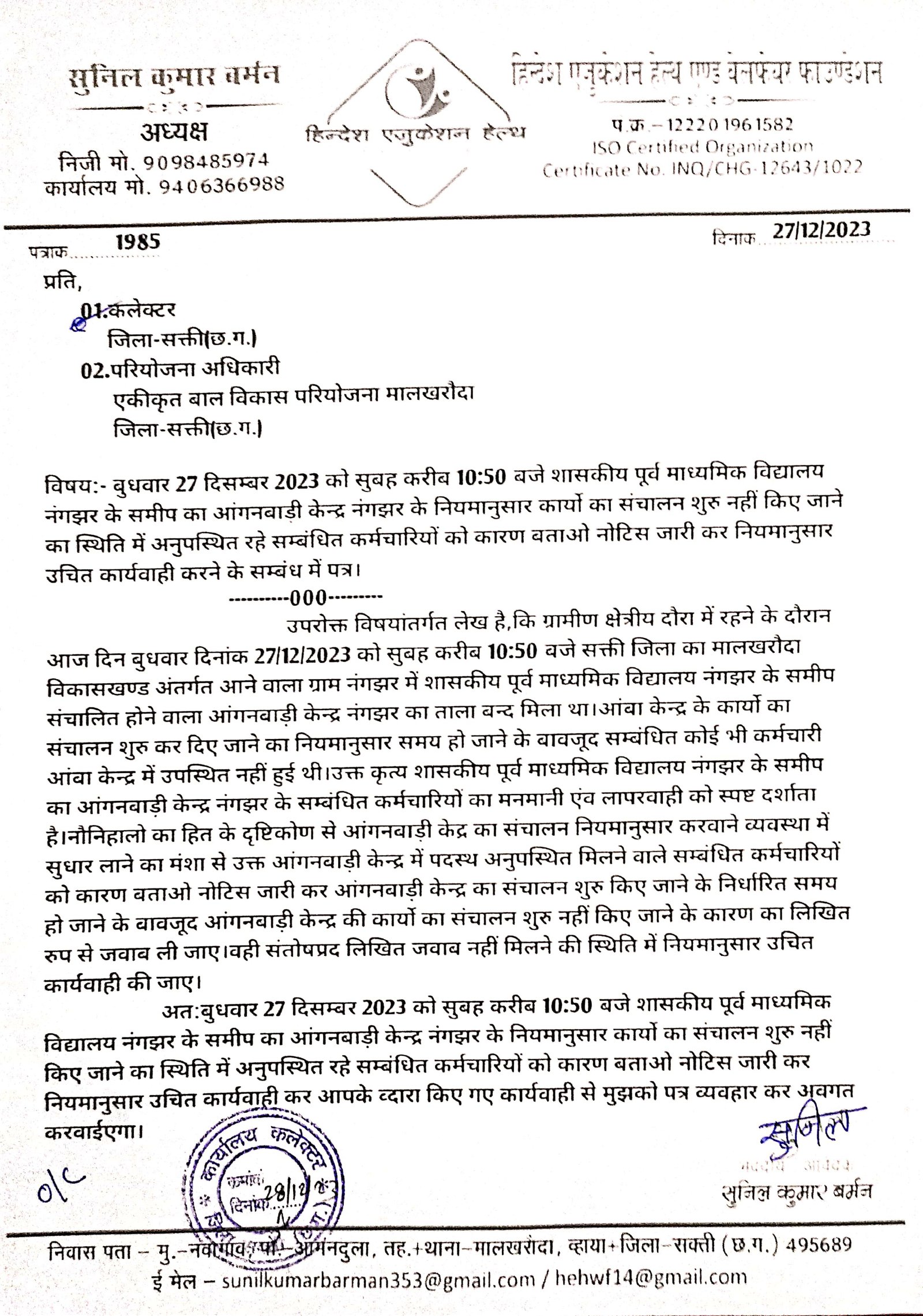 आंगनबाड़ी केन्द्र में ताला लटके मिला।सम्बंधित कर्मचारी अनुपस्थित मिले।नौनिहालों का हित के दृष्टिकोण से व्यवस्था में सुधार लाने नियमानुसार आंगनबाड़ी केन्द्र के कार्यो का संचालक जारी रखने के समय पर ताला बंद मिलने नदारद रहने वाले आंगनबाड़ी केन्द्र के सम्बंधित कर्मचारियों को कारण बताओ नोटिस जारी कर नियमानुसार उचित कार्यवाही करने के लिए हिन्देश एजुकेशन हेल्थ एण्ड वेलफेयर फाउण्डेशन (रजिस्टर्ड) के अध्यक्ष सुनिल कुमार बर्मन ने कलेक्टर सक्ती एंव परियोजना अधिकारी मालखरौदा को पत्र लिखा है।