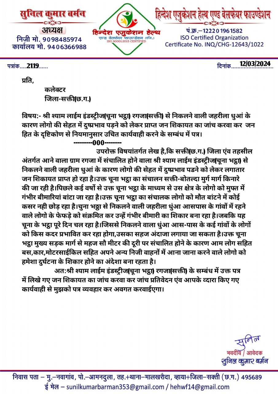 सक्ती(एचकेपी 24 न्यूज)।मुख्य सड़क मार्ग से महज 100 मीटर की दूरी पर संचालित होने वाला श्री श्याम लाईम इंडस्ट्रीज(चूना भट्ठा) रगजा(सक्ती) से निकलने वाली जहरीली धुंआ से आम जनता परेशान हैं।चूना भट्ठी सम्बंधित आम जनता के समस्या का संज्ञान में आने के पश्चात् हिन्देश एजुकेशन हेल्थ एण्ड वेलफेयर फाउण्डेशन (रजिस्टर्ड) के अध्यक्ष सुनिल कुमार बर्मन ने कलेक्टर को पत्र लिख कर जन समस्या का निराकरण करवाने उचित कार्यवाही करने का मांग किया है।