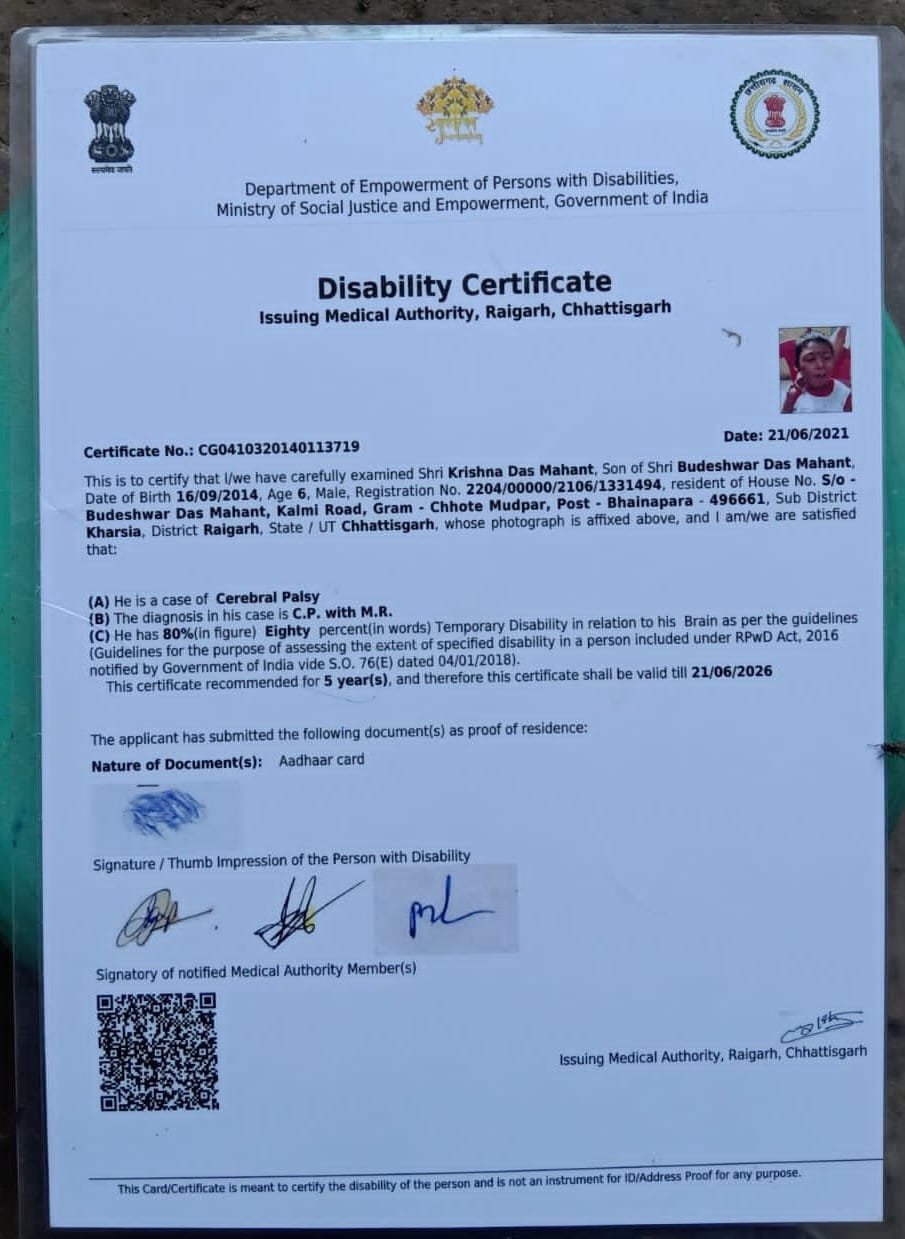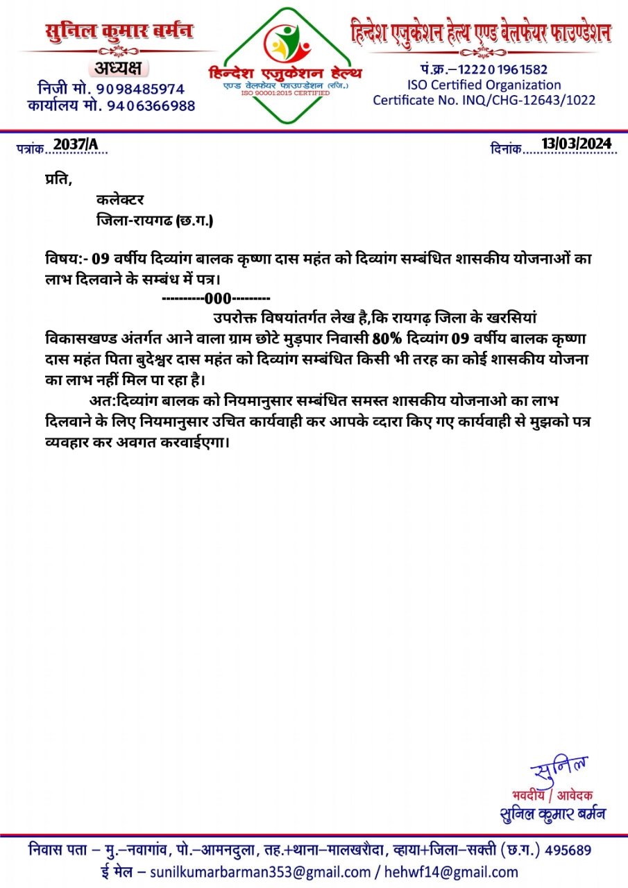 खरसियां-रायगढ(एचकेपी 24 न्यूज)।छोटे मुड़पार निवासी 80 प्रतिशत 09 वर्षीय दिव्यांग बालक कृष्णा दास महंत को किसी भी तरह का कोई भी दिव्यांग सम्बंधित शासकीय योजनाओं का लाभ नहीं मिलने का उपाध्यक्ष मोहन दास महंत के माध्यम से संज्ञान में आने पर हिन्देश एजुकेशन हेल्थ एण्ड वेलफेयर फाउण्डेशन (रजिस्टर्ड) के चीफ हिन्देश कुमार यादव के निर्देशानुसार अध्यक्ष सुनिल कुमार बर्मन ने कलेक्टर रायगढ़ को पत्र लिख कर दिव्यांग बालक कृष्णा दास महंत को दिव्यांग सम्बंधित समस्त शासकीय योजनाओं का लाभ दिलवाने नियमानुसार उचित कार्यवाही करने का मांग किया है।