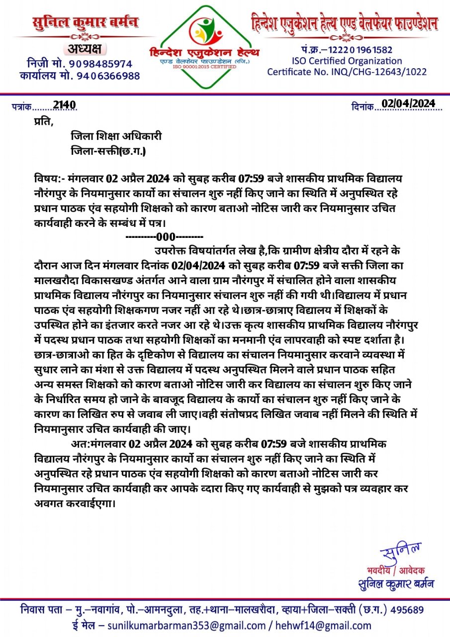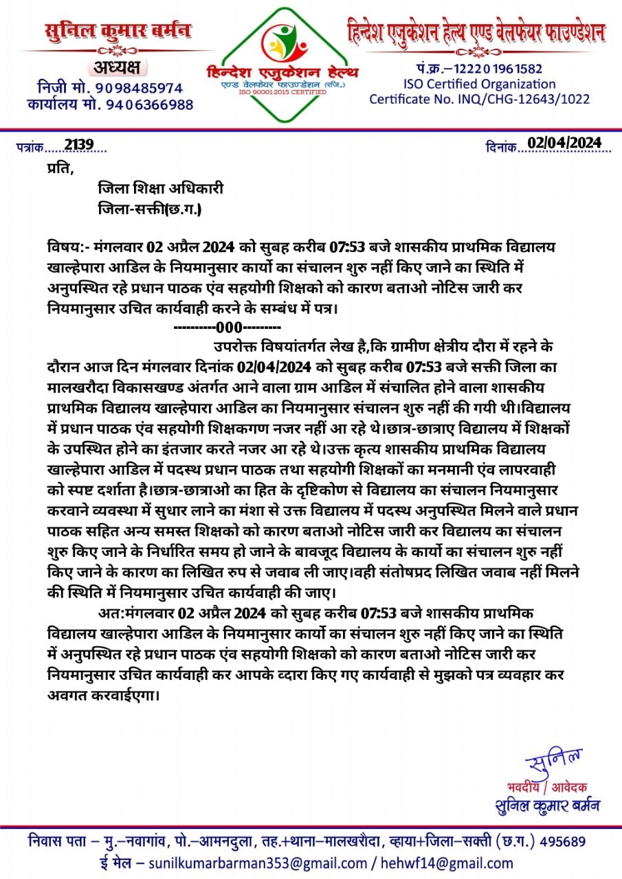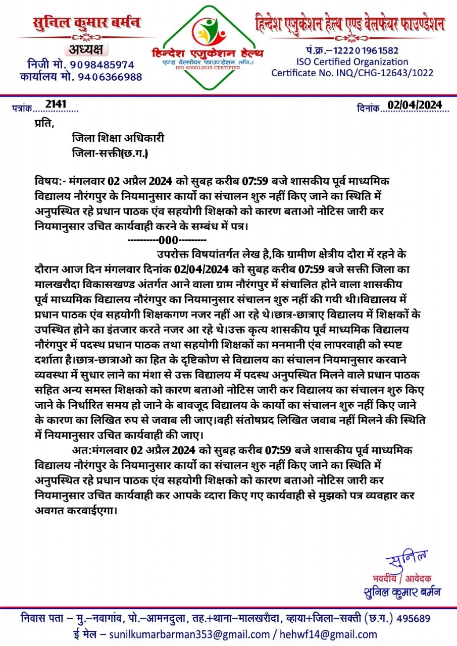 मालखरौदा-सक्ती(एचकेपी 24 न्यूज)।हिन्देश एजुकेशन हेल्थ एण्ड वेलफेयर फाउण्डेशन (रजिस्टर्ड) के अध्यक्ष सुनिल कुमार बर्मन के व्दारा मंगलवार 02 अप्रैल 2024 को सुबह 07:48 बजे शाप्रावि आवास प्लाट आडिल,सुबह 07:53 बजे शाप्रावि खाल्हेपारा आडिल,सुबह 07:59 बजे एक ही परिसर में संचालित होने वाला शाप्रावि नौरंगपुर एंव शापूमावि नौरंगपुर का औचक दौरा करने के दौरान प्रधान पाठक सहित समस्त शिक्षकगण का अनुपस्थित मिलने पर अनुपस्थित मिलने वाले प्रधान पाठक एंव सहयोगी शिक्षको को कारण बताओ नोटिस जारी कर नियमानुसार उचित कार्यवाही करने डीईओ सक्ती को पत्र लिखा है।