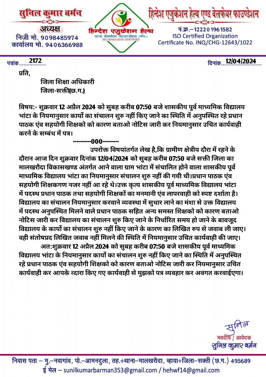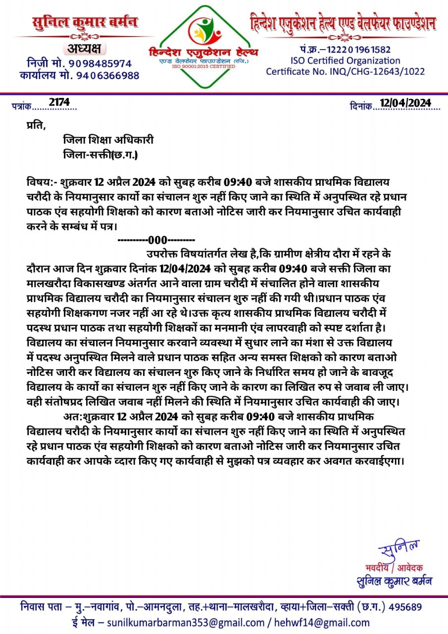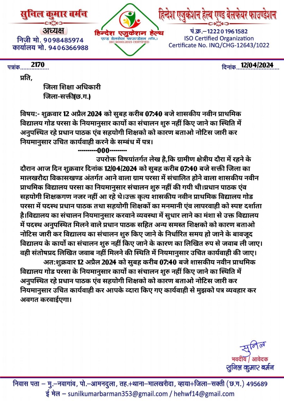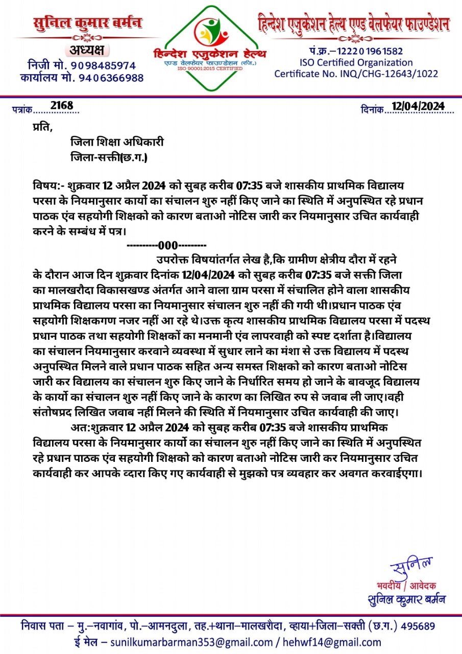 मालखरौदा-सक्ती(एचकेपी 24 न्यूज)।हिन्देश एजुकेशन हेल्थ एण्ड वेलफेयर फाउण्डेशन (रजिस्टर्ड) के अध्यक्ष सुनिल कुमार बर्मन के व्दारा शुक्रवार 12 अप्रैल 2024 को सुबह 07:35 बजे एक ही परिसर में संचालित होने वाला शाप्राशा एंव शापूमावि परसा,सुबह 07:40 बजे शानप्राशा गोड परसा,सुबह 07:50 बजे एक ही परिसर में संचालित होने वाला शाप्राशा एंव शापूमावि भांटा,09:30 बजे शापूमावि अंडा एंव 09:40 बजे शाप्राशा चरौदी का औचक दौरा करने के दौरान ताला लटके मिला।अनुपस्थित मिलने वाले प्रधान पाठक सहित समस्त शिक्षकगण को कारण बताओ नोटिस जारी कर नियमानुसार उचित कार्यवाही करने डीईओ सक्ती को पत्र लिखा गया है।