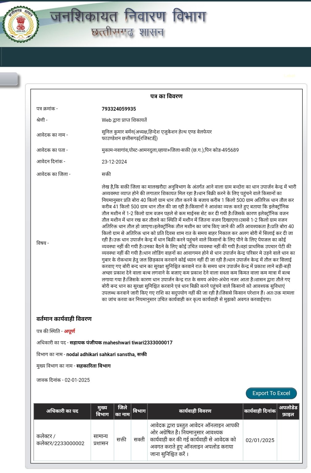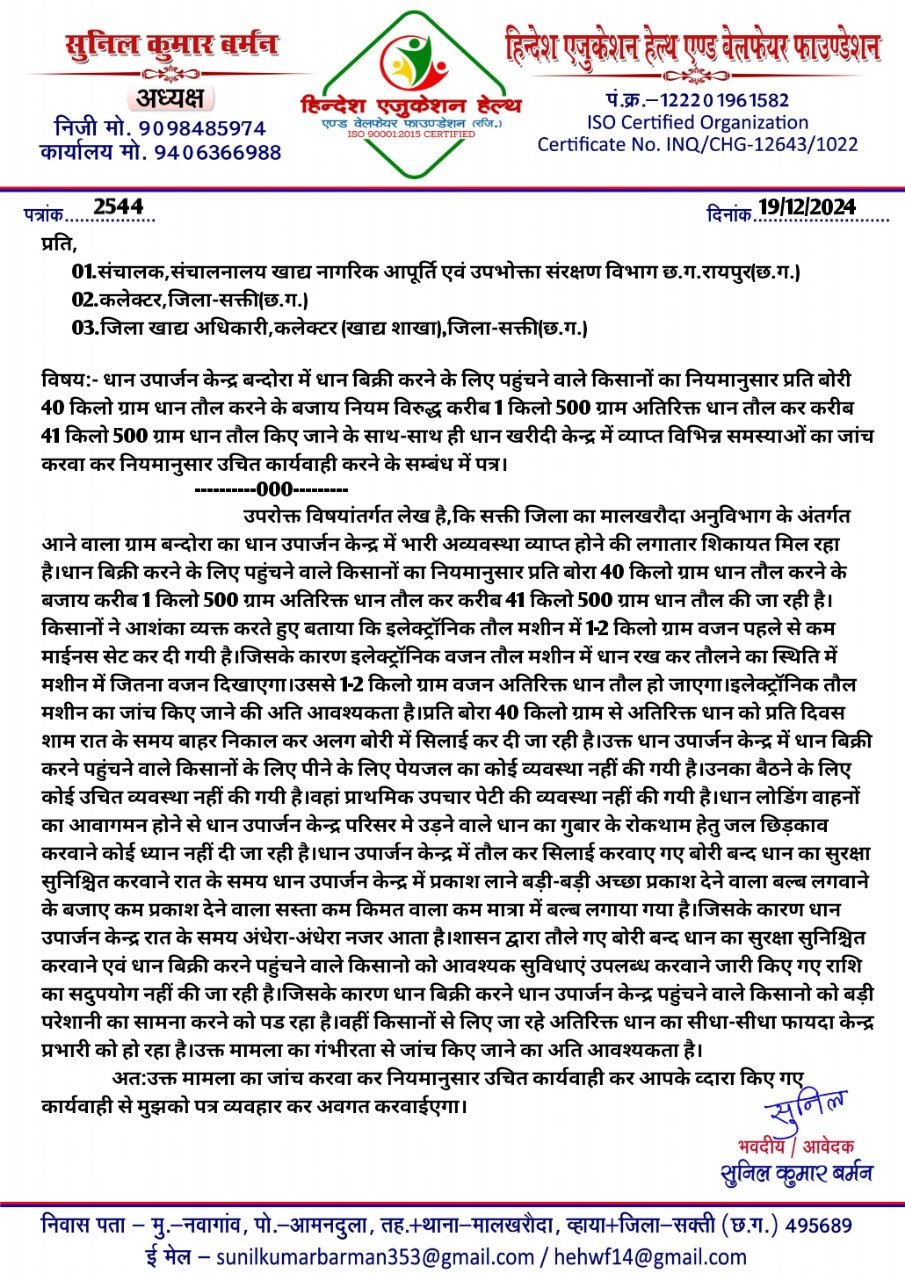 मालखरौदा-सक्ती(एचकेपी 24 न्यूज)।बन्दोरा धान उपार्जन केन्द्र में नियम विरुद्ध प्रति बोरा 41 किलो 500 ग्राम की जा रही तौल,इलेक्ट्रॉनिक वजन तौल मशीन में गड़बड़ी किए जाने की आशंका व्यक्त कर रहे किसान,अतिरिक्त धान को निकालने के पश्चात् विलम्ब से की जा रही बोरा की सिलाई,केन्द्र में सुविधा के नाम पर किसानों के लिए कुछ भी सुविधा नहीं,बन्दोरा धान उपार्जन केन्द्र में व्याप्त भारी अव्यवस्था को दूर करवाने नियमानुसार उचित कार्यवाही करने हिन्देश एजुकेशन हेल्थ एण्ड वेलफेयर फाउण्डेशन(रजिस्टर्ड) के अध्यक्ष सुनिल कुमार बर्मन ने जन शिकायत निवारण विभाग छ.ग.शासन,संचालक खाद्य नागरिक आपूर्ति एवं उपभोक्ता संरक्षण विभाग तथा कलेक्टर को पत्र लिखने के पश्चात् कलेक्टर ने सहायक पंजीयक सहकारी संस्थाएं को नियमानुसार उचित कार्यवाही करने का निर्देश दिया है।