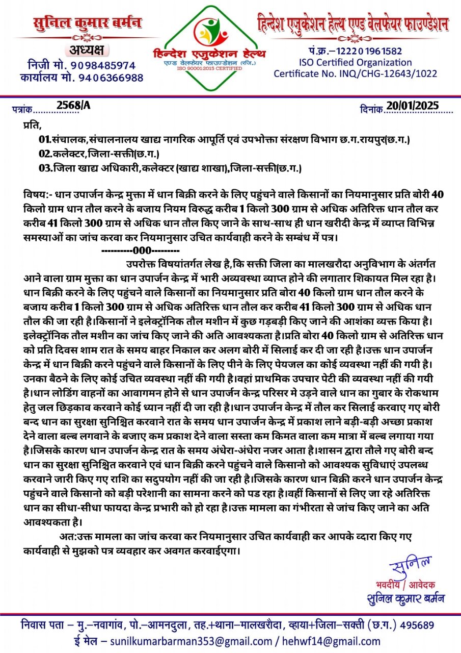 मालखरौदा-सक्ती(एचकेपी 24 न्यूज)।मुक्ता धान उपार्जन केन्द्र में नियम विरुद्ध प्रति बोरा 41 किलो 300 ग्राम से अधिक वजन की जा रही तौल,इलेक्ट्रॉनिक वजन तौल मशीन में गड़बड़ी किए जाने की आशंका व्यक्त कर रहे किसान,अतिरिक्त धान को निकालने के पश्चात् विलम्ब से की जा रही बोरा की सिलाई,केन्द्र में सुविधा के नाम पर किसानों के लिए कुछ भी सुविधा नहीं,मुक्ता धान उपार्जन केन्द्र में व्याप्त भारी अव्यवस्था को दूर करवाने नियमानुसार उचित कार्यवाही करने हिन्देश एजुकेशन हेल्थ एण्ड वेलफेयर फाउण्डेशन(रजिस्टर्ड) के अध्यक्ष सुनिल कुमार बर्मन ने जन शिकायत निवारण विभाग छ.ग.शासन,संचालक खाद्य नागरिक आपूर्ति एवं उपभोक्ता संरक्षण विभाग तथा कलेक्टर को पत्र लिखा है।