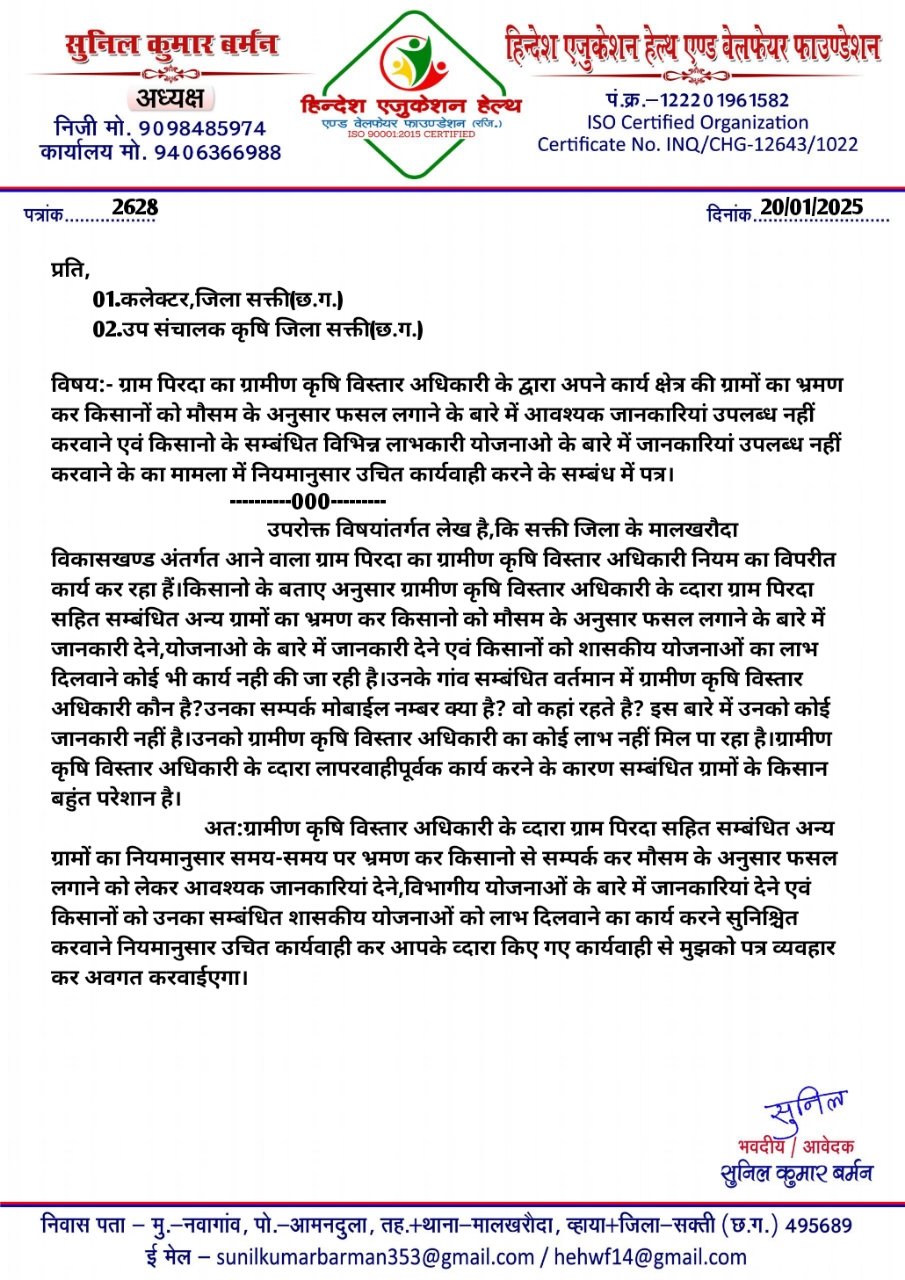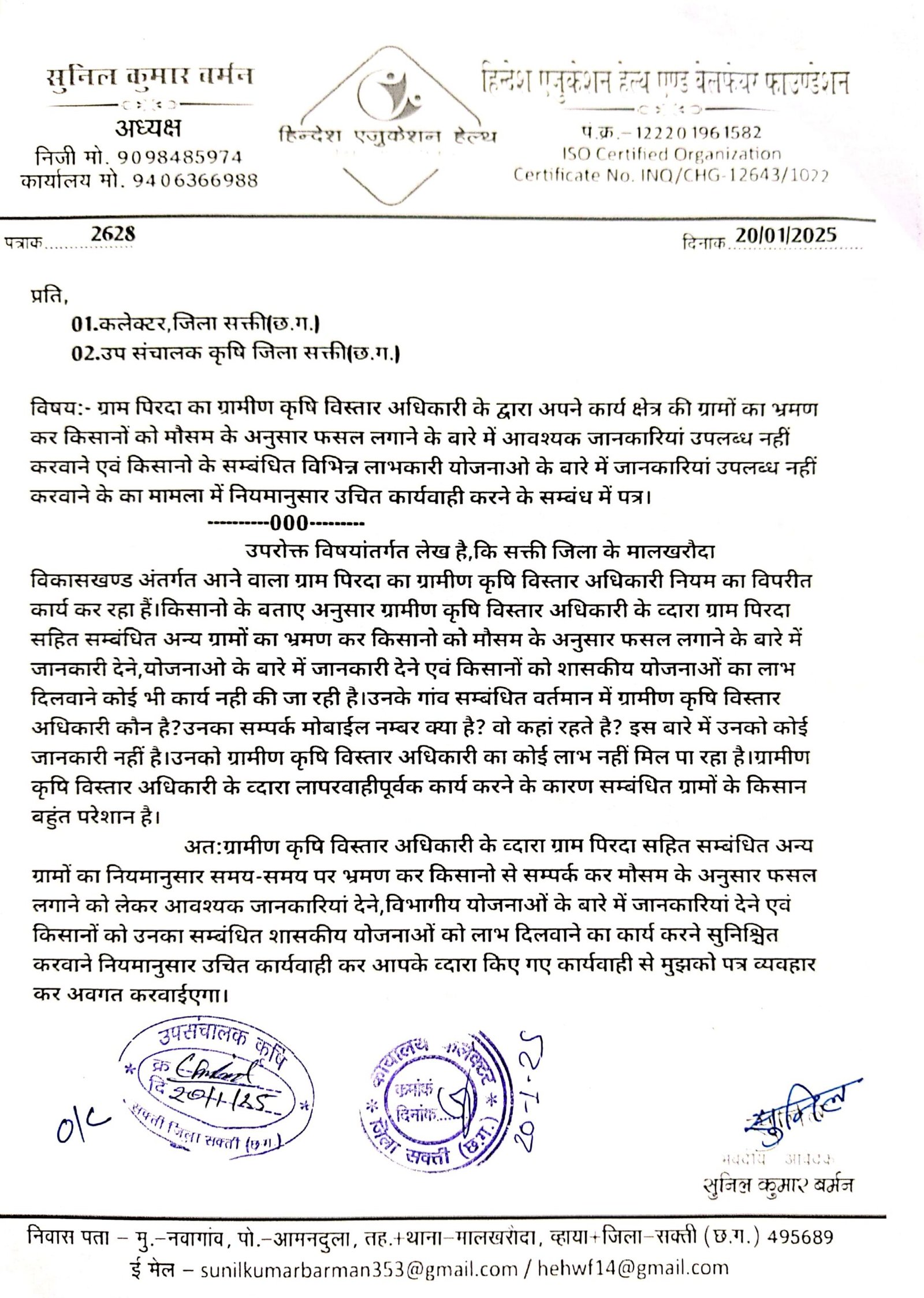 मालखरौदा-सक्ती(एचकेपी)।पिरदा ग्रामीण कृषि विस्तार अधिकारी का मुख्यालय में निवास नहीं करने,किसानों को शासकीय योजनाओं के बारे मे जानकारियां उपलब्ध नहीं करवाने,मुख्यालय का ग्राम पिरदा सहित सम्बंधित ग्रामो का भ्रमण कर किसानों को मौसम के अनुसार फसल लगाने के लिए आवश्यक महत्वपूर्ण जानकारियां उपलब्ध नहीं करवाने का लगातार शिकायत प्राप्त होने पर हिन्देश एजुकेशन हेल्थ एण्ड वेलफेयर फाउण्डेशन (रजिस्टर्ड) के अध्यक्ष सुनिल कुमार बर्मन ने कलेक्टर,उप संचालक कृषि एवं जन शिकायत निवारण विभाग छत्तीसगढ़ शासन को पिरदा ग्रामीण कृषि विस्तार अधिकारी को कारण बताओ नोटिस जारी कर नियमानुसार उचित कार्यवाही करने पत्र लिखा है।