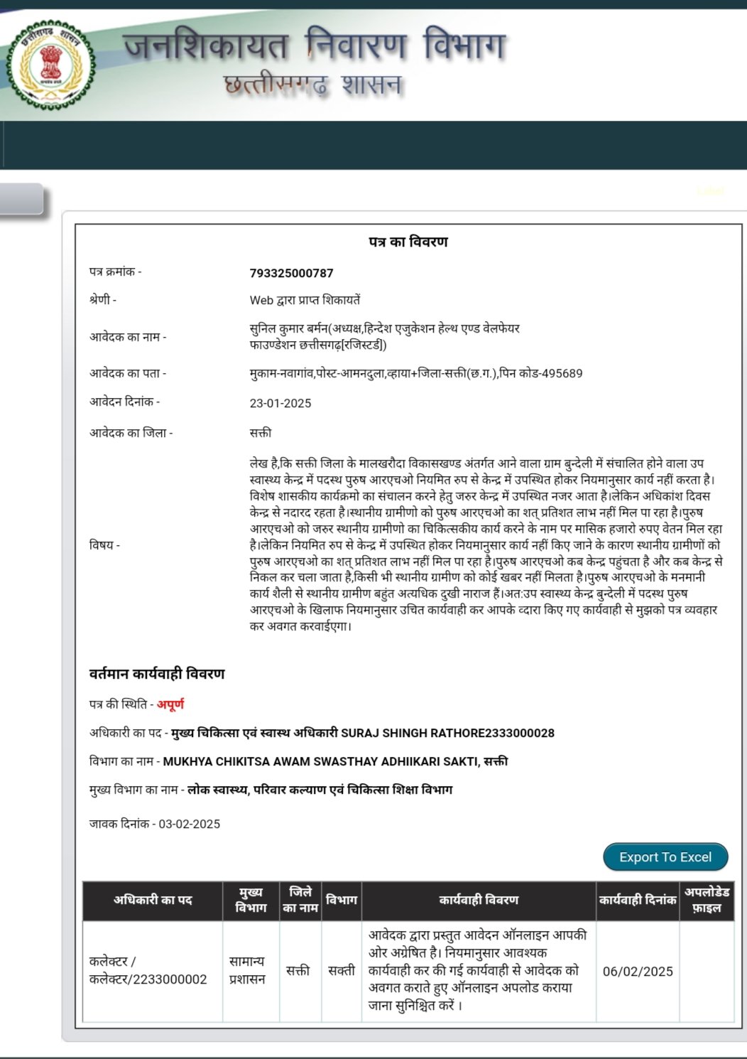 मालखरौदा(एचकेपी 24 न्यूज)।उप स्वास्थ्य केन्द्र बुन्देली में पदस्थ पुरुष आरएचओ नहीं कर रहा नियमानुसार कार्यो का संचालन,विभागीय शासकीय कार्यक्रमो को छोड़ कर अन्य दिवस उप स्वास्थ्य केन्द्र में नहीं आता नजर,जन हित का दृष्टिकोण से हिन्देश एजुकेशन हेल्थ एण्ड वेलफेयर फाउण्डेशन (रजिस्टर्ड) के अध्यक्ष सुनिल कुमार बर्मन के व्दारा जन शिकायत निवारण विभाग छत्तीसगढ़ शासन से शिकायत करने के उपरान्त कलेक्टर ने मुख्य चिकित्सा एवं स्वास्थ्य अधिकारी को शिकायत पर नियमानुसार उचित कार्यवाही करने का निर्देश दिया है।