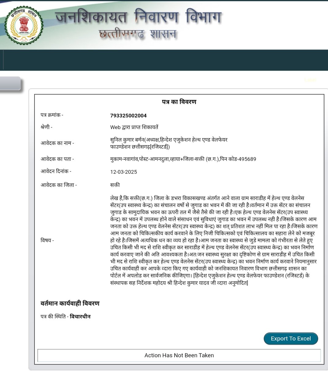 डभरा(एचकेपी 24 न्यूज)।जिले के अंतिम क्षोर महानदी तट पर स्थित ग्राम साराडीह में हेल्थ एण्ड वेलनेस सेंटर(उप स्वास्थ्य केन्द्र) का वर्षो से जुगाड का भवन में हो रहा संचालन..जुगाड के सामुदायिक भवन का ऊपरी तल में हेल्थ एण्ड वेलनेस सेंटर(उप स्वास्थ्य केन्द्र) का संचालन किए जाने से आम जनता को शत् प्रतिशत हेल्थ एण्ड वेलनेस सेंटर(उप स्वास्थ्य केन्द्र) का नहीं मिल रहा लाभ.. अतिरिक्त धन व्यय कर निजी चिकित्सक एवं चिकित्सालय का सहारा लेने को मजबूर हो रहे आम जनता..उचित किसी मद से राशि स्वीकृत कर साराडीह में हेल्थ एण्ड वेलनेस सेंटर(उप स्वास्थ्य केन्द्र) का भवन निर्माण कार्य करवाने नियमानुसार उचित कार्यवाही करने के लिए हिन्देश एजुकेशन हेल्थ एण्ड वेलफेयर फाउण्डेशन(रजिस्टर्ड) के अध्यक्ष सुनिल कुमार बर्मन ने जनशिकायत निवारण विभाग छत्तीसगढ़ शासन को पत्र लिखा है।