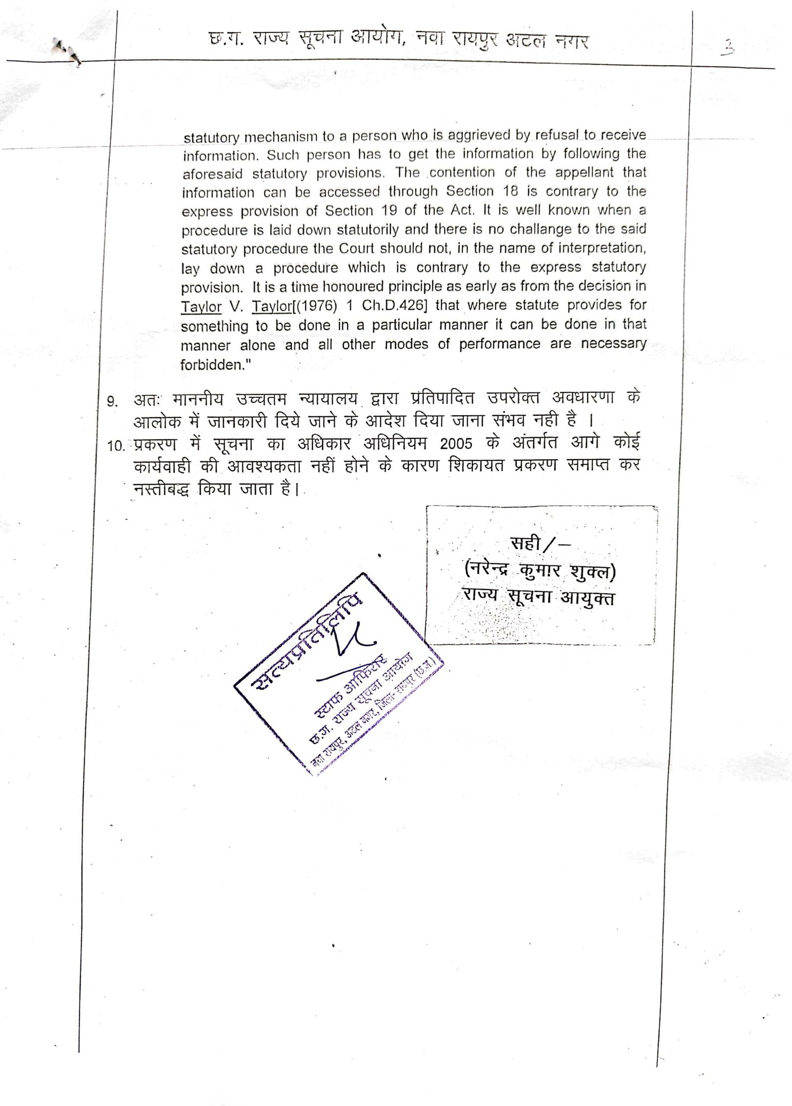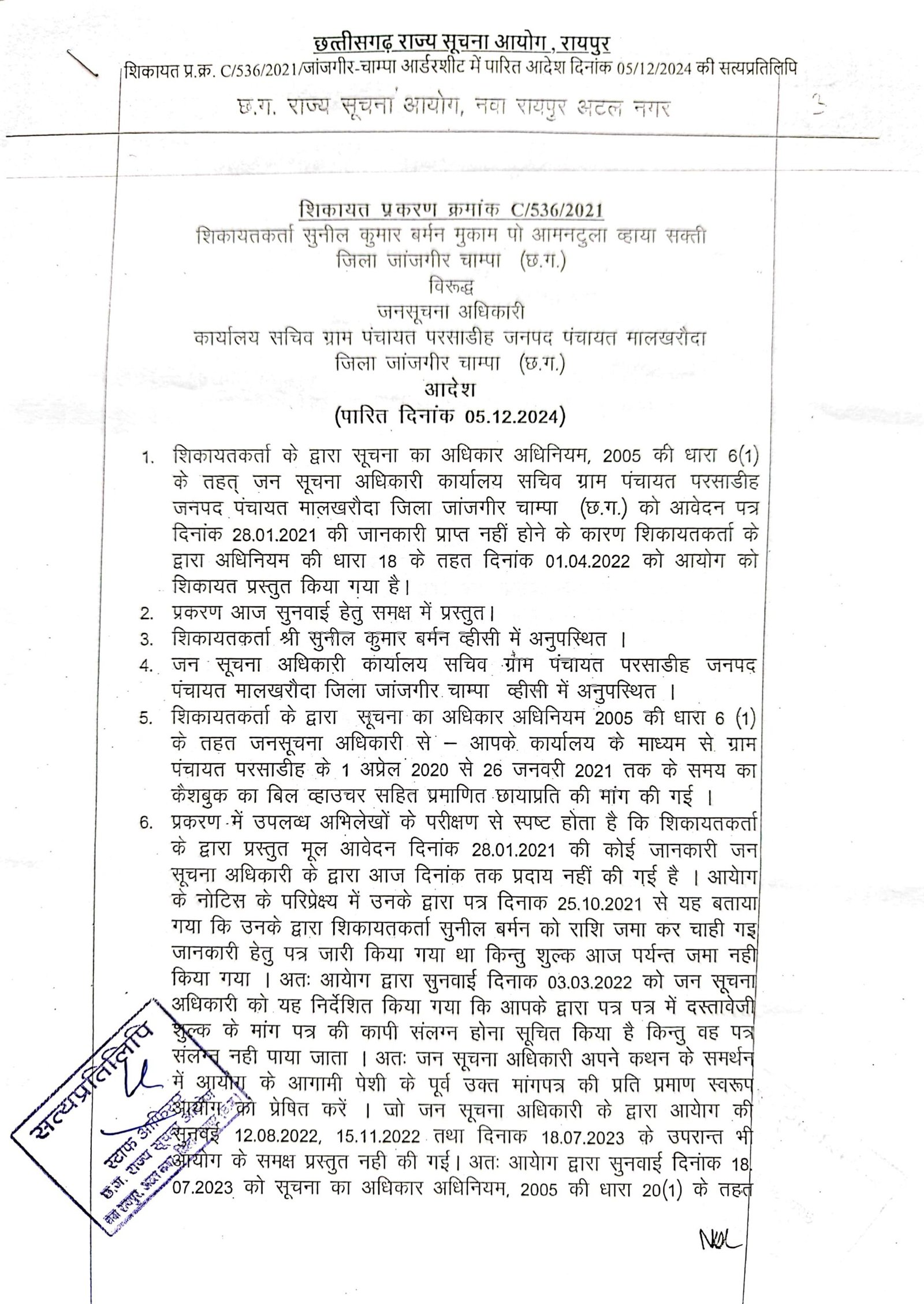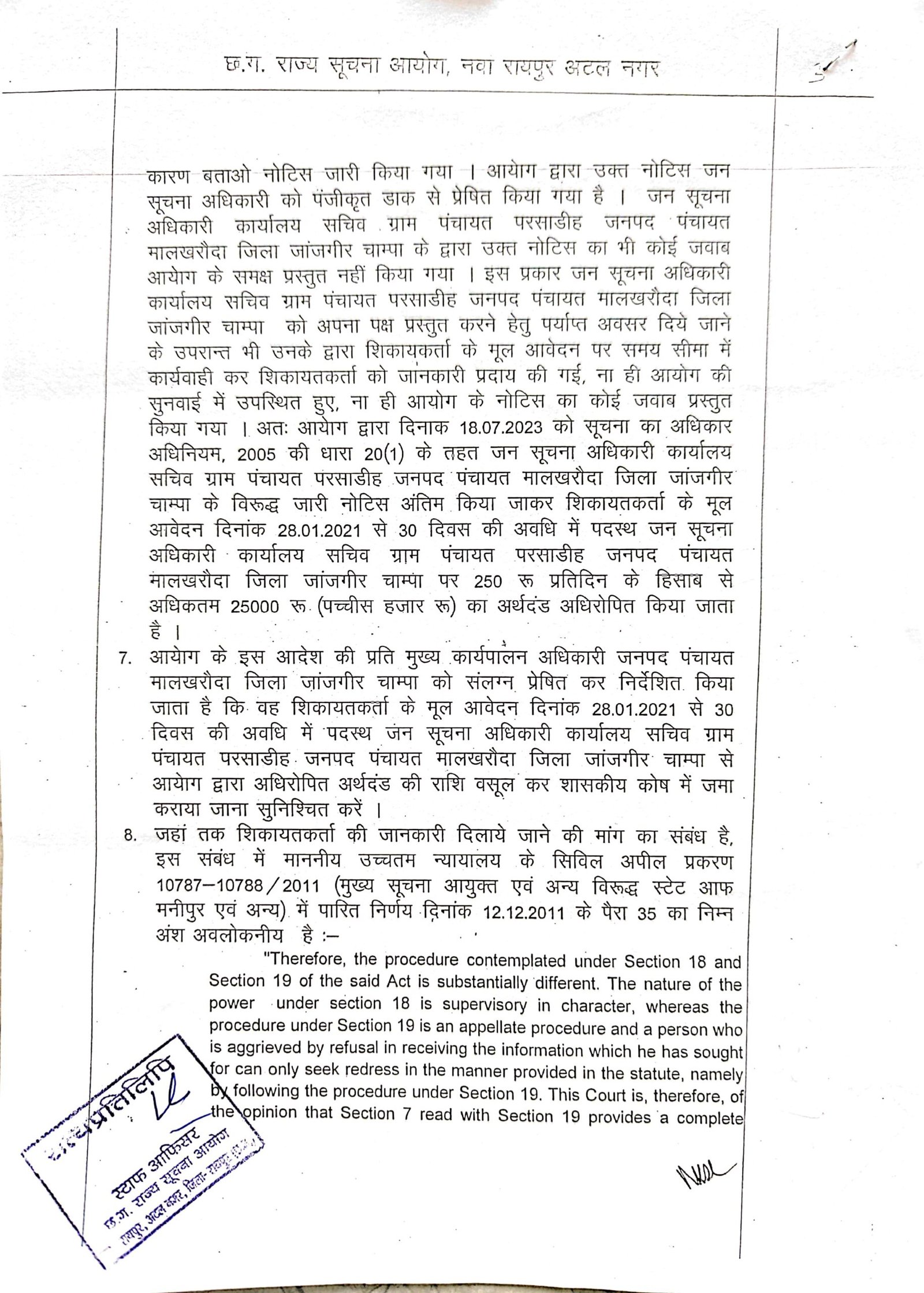 मालखरौदा(एचकेपी 24 न्यूज)।आरटीआई कार्यकर्ता सुनिल कुमार बर्मन को निर्धारित समय पर मांगी गई जानकारी निर्धारित समय में उपलब्ध नही करवाया गया।तब राज्य सूचना आयुक्त ने लापरवाही बरतने वाला तत्कालीन जन सूचना अधिकारी सचिव ग्राम पंचायत परसाडीह पर 25000 रुपए का जुर्माना लगाया है।