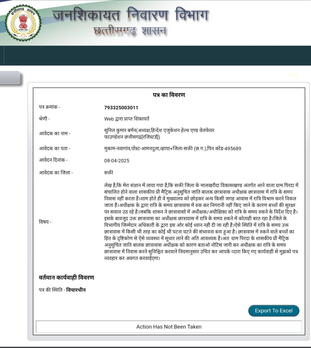 मालखरौदा(एचकेपी 24 न्यूज)।शासकीय प्री मैट्रिक अनुसुचित जाति बालक छात्रावास पिरदा का अधीक्षक छात्रावास में रात्रि के समय निवास नहीं कर रहा है।शाम होते ही मुख्यालय छोड़ कर रात्रि विश्राम करने किसी अन्य जगह में स्थित आवास के लिए रवाना हो जाते हैं।छात्रावास में रात्रि के समय रुकने वाले बच्चों का सुरक्षा भगवान भरोसे है।बच्चो का सुरक्षा का दृष्टिकोण से छात्रावास अधीक्षक को कारण बताओ नोटिस जारी करने के साथ-साथ ही छात्रावास अधीक्षक का रात्रि के समय पर छात्रावास में निवास करने सुनिश्चित करने नियमानुसार उचित कार्यवाही करने हिन्देश एजुकेशन हेल्थ एण्ड वेलफेयर फाउण्डेशन(रजिस्टर्ड) के अध्यक्ष सुनिल कुमार बर्मन ने जनशिकायत निवारण विभाग छत्तीसगढ़ शासन,आयुक्त आदिम जाति तथा अनुसूचित जाति विकास,कलेक्टर एवं सहायक आयुक्त आदिवासी विकास को पत्र लिखा है।