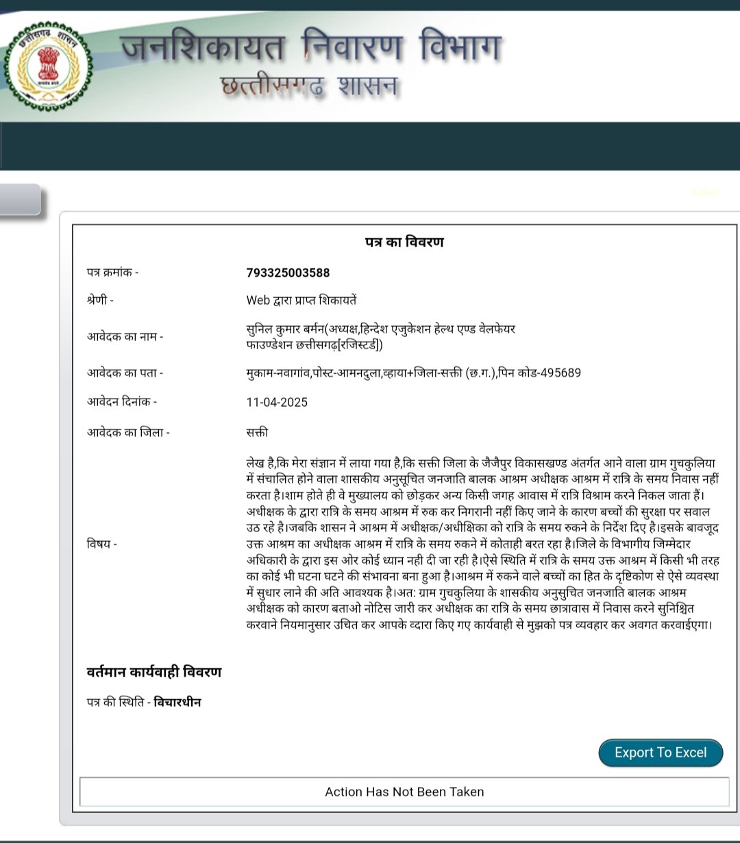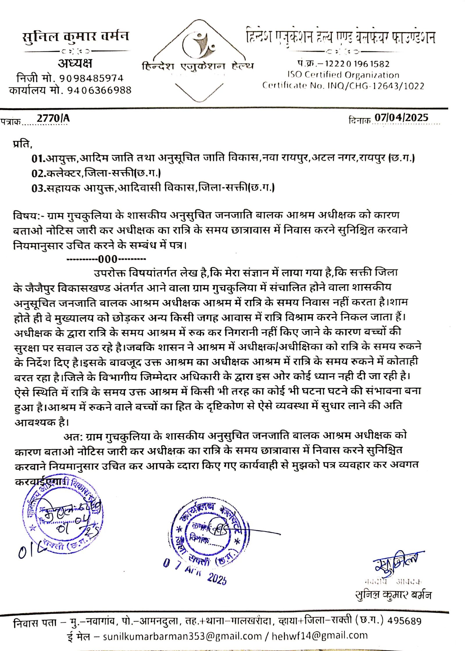 जैजैपुर (एचकेपी 24 न्यूज)।शासकीय अनुसुचित जनजाति बालक आश्रम गुचकुलिया का अधीक्षक आश्रम में रात्रि के समय निवास नहीं कर रहा है।शाम होते ही मुख्यालय छोड़ कर रात्रि विश्राम करने किसी अन्य जगह में स्थित आवास के लिए रवाना हो जाते हैं।अधिकांश समय आश्रम से नदारद रहता है। व्यवस्था में सुधार लाने आश्रम अधीक्षक को कारण बताओ नोटिस जारी करने के साथ-साथ ही आश्रम अधीक्षक का रात्रि के समय पर आश्रम में निवास करने सुनिश्चित करने नियमानुसार उचित कार्यवाही करने हिन्देश एजुकेशन हेल्थ एण्ड वेलफेयर फाउण्डेशन(रजिस्टर्ड) के अध्यक्ष सुनिल कुमार बर्मन ने जनशिकायत निवारण विभाग छत्तीसगढ़ शासन,आयुक्त आदिम जाति तथा अनुसूचित जाति विकास,कलेक्टर एवं सहायक आयुक्त आदिवासी विकास को पत्र लिखा है।