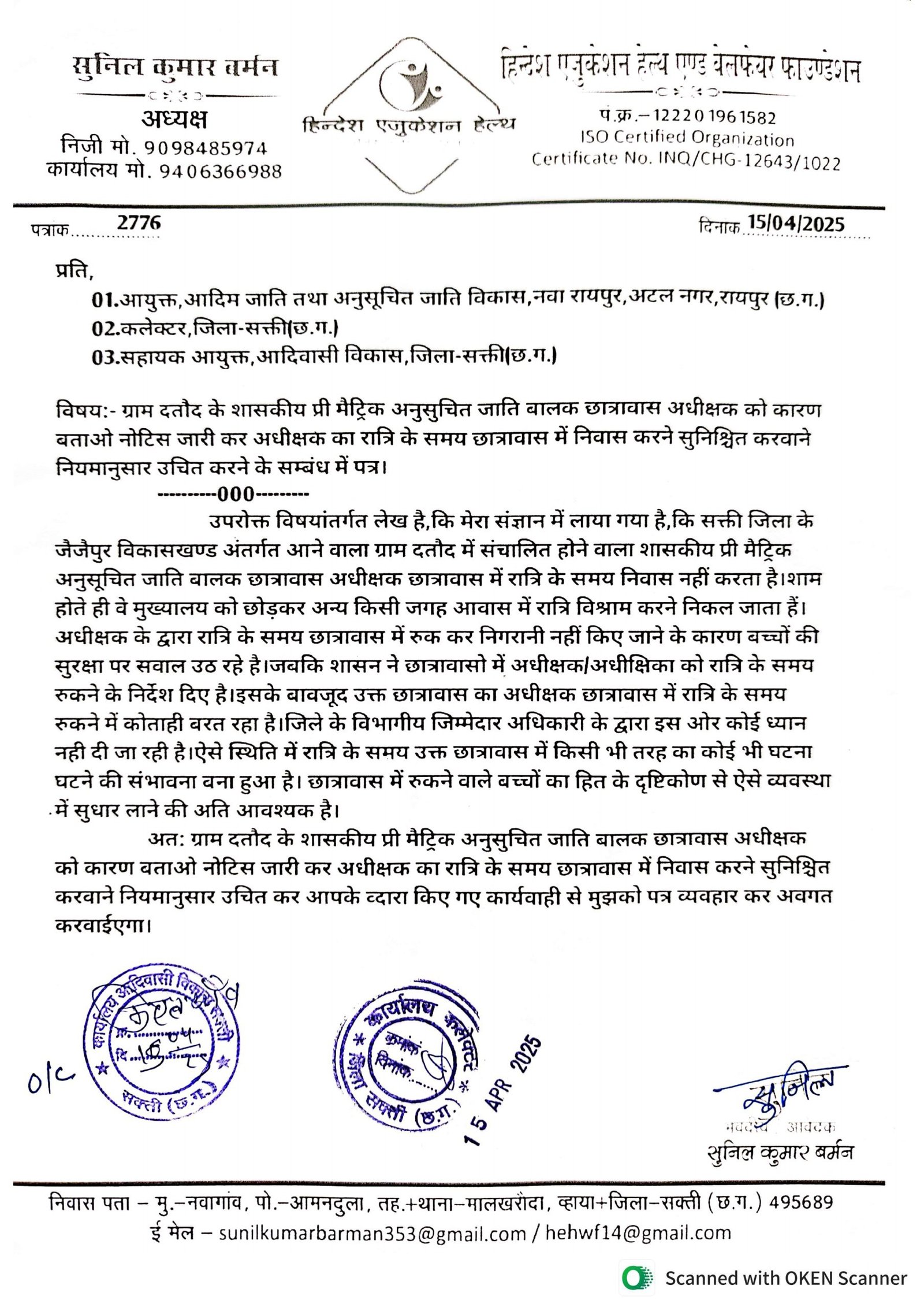 जैजैपुर(एचकेपी 24 न्यूज)।शासकीय प्री.मैट्रिक अनुसूचित जाति बालक छात्रावास दतौद का अधीक्षक छात्रावास में रात्रि के समय निवास नहीं कर रहा है।अनुपस्थित बच्चो का उपस्थिति दर्ज कर राशि के गड़बड़ी किए जाने की आशंका जताया जा रहा है।छात्रावास अधीक्षक का छात्रावास में रात्रि के समय निवास करने सुनिश्चित करवाने एवं बच्चो के उपस्थिति पंजी का सत्यापन करवा कर उपस्थिति पंजी में उपस्थित दर्ज किए गए बच्चो से जानकारी लेकर सत्यापन कर नियमानुसार उचित कार्यवाही करने हिन्देश एजुकेशन हेल्थ एण्ड वेलफेयर फाउण्डेशन(रजिस्टर्ड) के अध्यक्ष सुनिल कुमार बर्मन ने जनशिकायत निवारण विभाग छत्तीसगढ़ शासन,आयुक्त आदिम जाति तथा अनुसूचित जाति विकास,कलेक्टर एवं सहायक आयुक्त आदिवासी विकास को पत्र लिखा है।