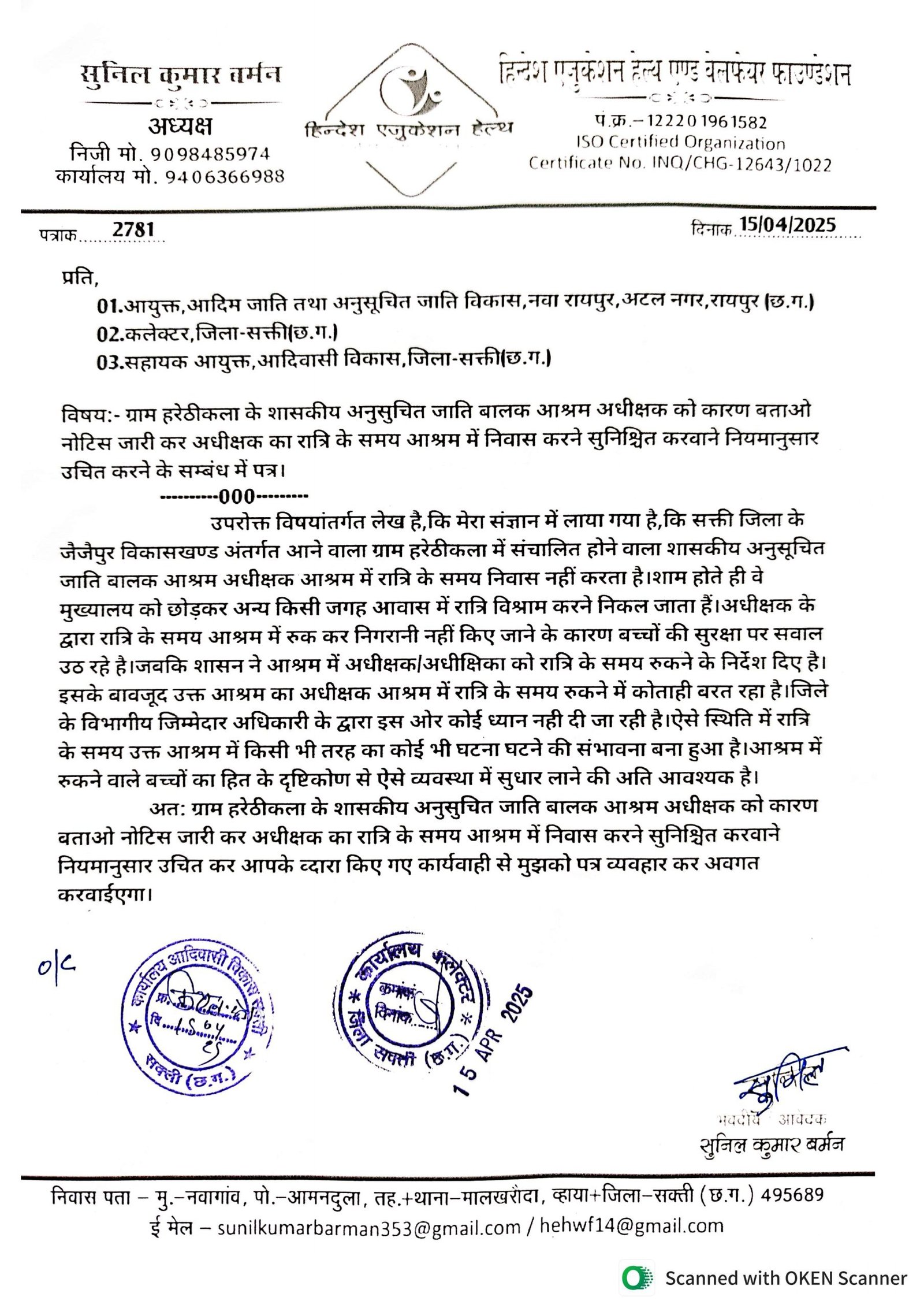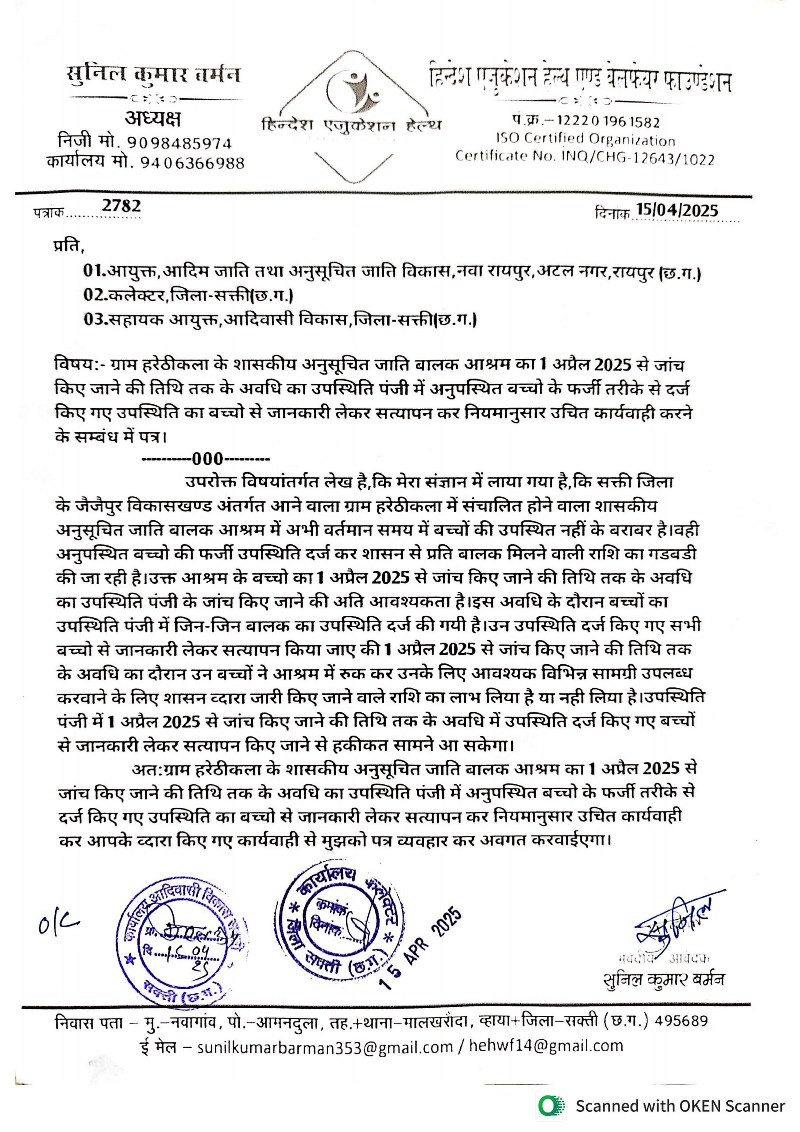 जैजैपुर(एचकेपी 24 न्यूज)।शासकीय अनुसूचित जाति बालक आश्रम हरेठीकला के माह अप्रैल 2025 में अनुपस्थित बच्चो का उपस्थिति दर्ज कर चावल एवं शिष्यावृत्ति के पैसों का हेराफेरी की जा रही है।माह अप्रैल 2025 का बच्चो के उपस्थिति पंजी में उपस्थिति दर्ज किए गए बच्चों से जानकारी लेकर बच्चो के उपस्थिति पंजी का सत्यापन करवा कर नियमानुसार उचित कार्यवाही करने हिन्देश एजुकेशन हेल्थ एण्ड वेलफेयर फाउण्डेशन(रजिस्टर्ड) के अध्यक्ष सुनिल कुमार बर्मन ने जनशिकायत निवारण विभाग छत्तीसगढ़ शासन,आयुक्त आदिम जाति तथा अनुसूचित जाति विकास,कलेक्टर एवं सहायक आयुक्त आदिवासी विकास को पत्र लिखा है।