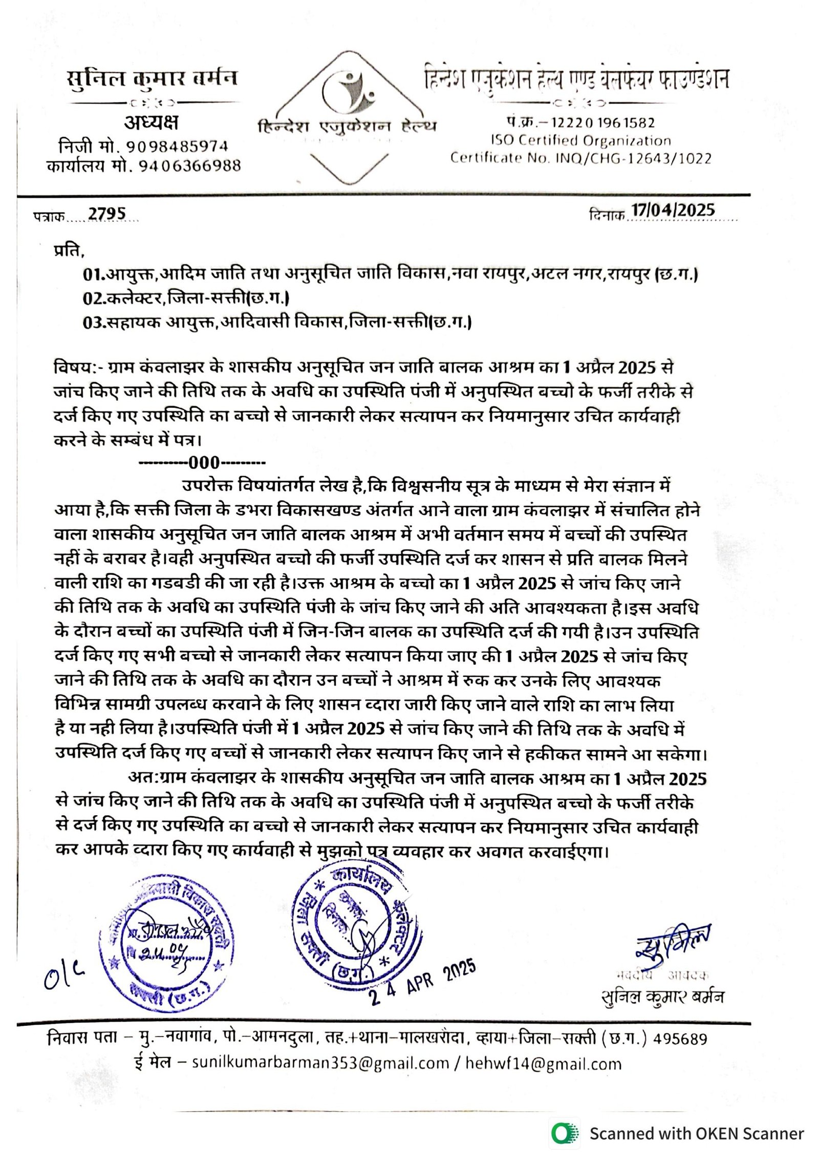 डभरा(एचकेपी 24 न्यूज)।कंवलाझर का शासकीय अनुसूचित जन जाति बालक आश्रम बदहाली का आंसू बहा रहा है।वित्तीय अनियमितता किए जाने का आशंका जताया जा रहा है।माह अप्रैल 2025 में अनुपस्थित बच्चो का उपस्थिति दर्ज कर चावल एवं शिष्यावृत्ति के पैसों का गबन करने का तैयारी चल रहा है।माह अप्रैल 2025 का बच्चो के उपस्थिति पंजी में उपस्थिति दर्ज किए गए बच्चों से जानकारी लेकर उपस्थिति पंजी का सत्यापन करवा कर एवं विगत पांच वित्तीय वर्ष में शासन व्दारा जारी किए गए राशि से खरीदी किए गए सामग्रियो तथा करवाए गए कार्यो का भौतिक सत्यापन करवा कर नियमानुसार उचित कार्यवाही करने हिन्देश एजुकेशन हेल्थ एण्ड वेलफेयर फाउण्डेशन(रजिस्टर्ड) के अध्यक्ष सुनिल कुमार बर्मन ने जनशिकायत निवारण विभाग छत्तीसगढ़ शासन,आयुक्त आदिम जाति तथा अनुसूचित जाति विकास,कलेक्टर एवं सहायक आयुक्त आदिवासी विकास को पत्र लिखा है।