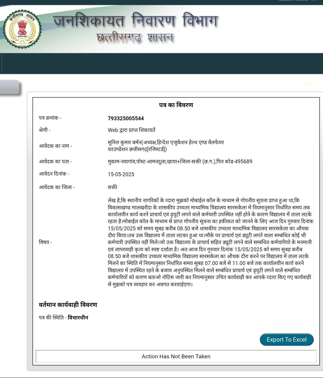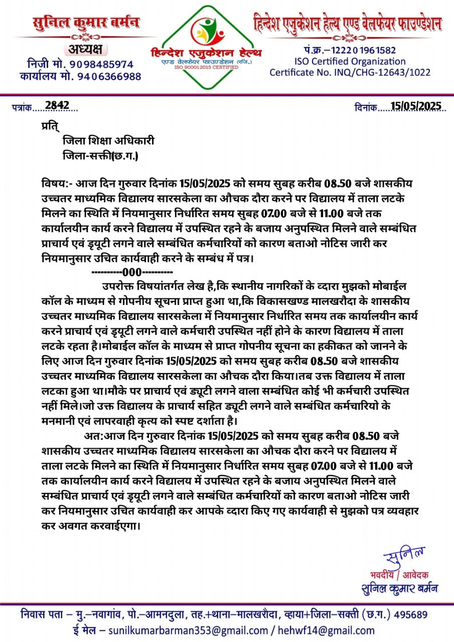 मालखरौदा(एचकेपी 24 न्यूज)।हिन्देश एजुकेशन हेल्थ एण्ड वेलफेयर फाउण्डेशन (रजिस्टर्ड) के द्वारा आज दिन गुरुवार दिनांक 15/05/2025 को समय सुबह करीब 08.50 बजे शासकीय उच्चतर माध्यमिक विद्यालय सारसकेला का औचक दौरा करने पर विद्यालय में ताला लटके मिलने का स्थिति में नियमानुसार निर्धारित समय सुबह 07.00 बजे से 11.00 बजे तक कार्यालयीन कार्य करने विद्यालय में उपस्थित रहने के बजाय अनुपस्थित मिलने वाले सम्बंधित प्राचार्य एवं डृयूटी लगने वाले सम्बंधित कर्मचारियों को कारण बताओ नोटिस जारी कर नियमानुसार उचित कार्यवाही करने के लिए जनशिकायत निवारण विभाग छत्तीसगढ़ शासन एवं जिला शिक्षा अधिकारी को पत्र लिखा है।