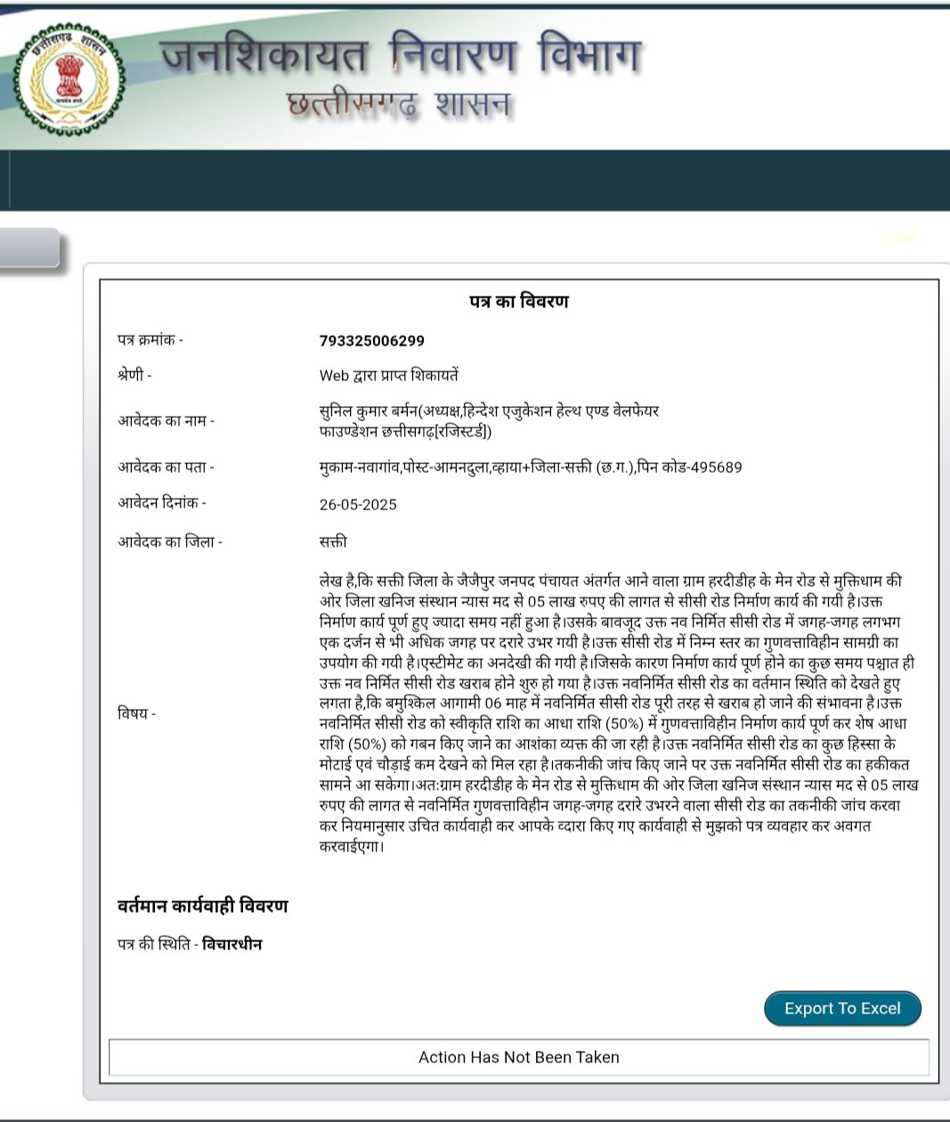 जैजैपुर(एचकेपी 24 न्यूज)।ग्राम हरदीडीह के मेन रोड से मुक्तिधाम की ओर जिला खनिज संस्थान न्यास मद से 05 लाख रुपए की लागत से निर्मित सीसी रोड में निर्माण कार्य पूर्ण होने का कुछ ही दिवस पश्चात् गुणवत्ता का अनदेखी कर निर्माण कार्य किए जाने के कारण जगह-जगह दरारे उभरने लगी है।नवनिर्मित सीसी रोड का तकनीकी जांच करवा कर नियमानुसार उचित कार्यवाही करने हिन्देश एजुकेशन हेल्थ एण्ड वेलफेयर फाउण्डेशन (रजिस्टर्ड) के अध्यक्ष सुनिल कुमार बर्मन ने जनशिकायत निवारण विभाग छत्तीसगढ़ शासन को पत्र लिखा है।