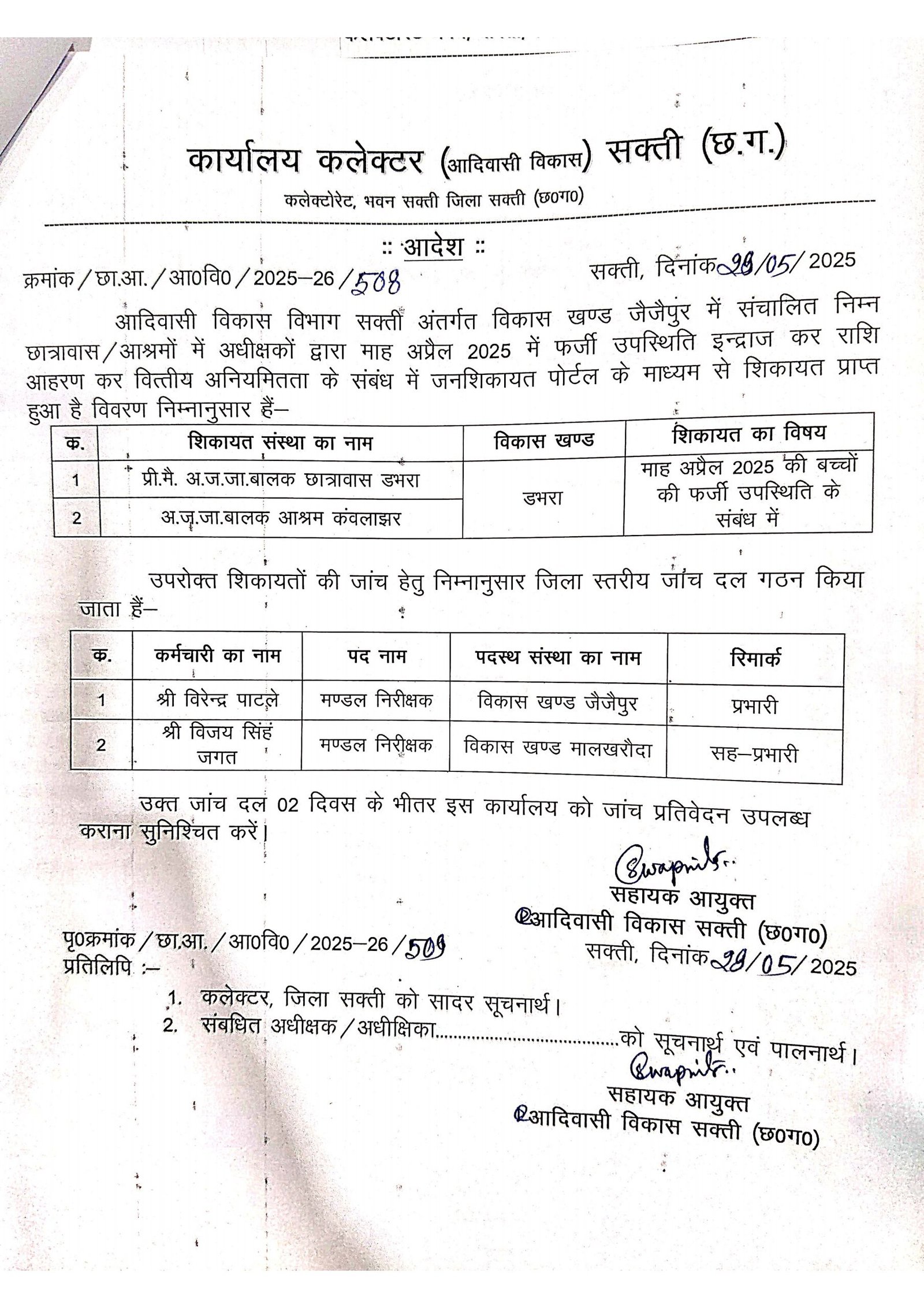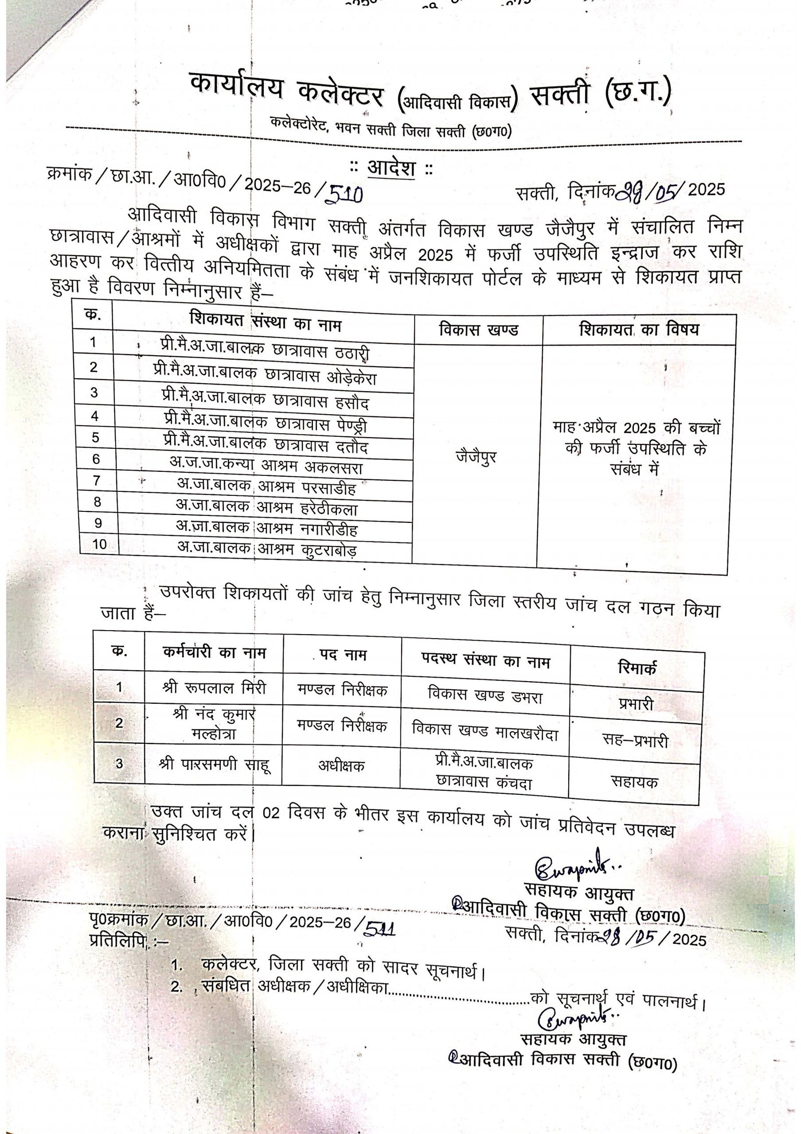 सक्ती(एचकेपी 24 न्यूज)।डभरा एवं जैजैपुर विकासखण्ड के एक दर्जन शासकीय आश्रम एवं शासकीय छात्रावास में वित्तीय अनियमित किए जाने का हिन्देश एजुकेशन हेल्थ एण्ड वेलफेयर फाउण्डेशन(रजिस्टर्ड) के अध्यक्ष सुनिल कुमार बर्मन के द्वारा लिखित रुप से शिकायत किए जाने के पश्चात् सहायक आयुक्त आदिवासी विकास सक्ती(छ.ग.) ने लिखित शिकायत का जांच कर नियमानुसार उचित कार्यवाही करने जिला स्तरीय जांच दल गठित किया है।