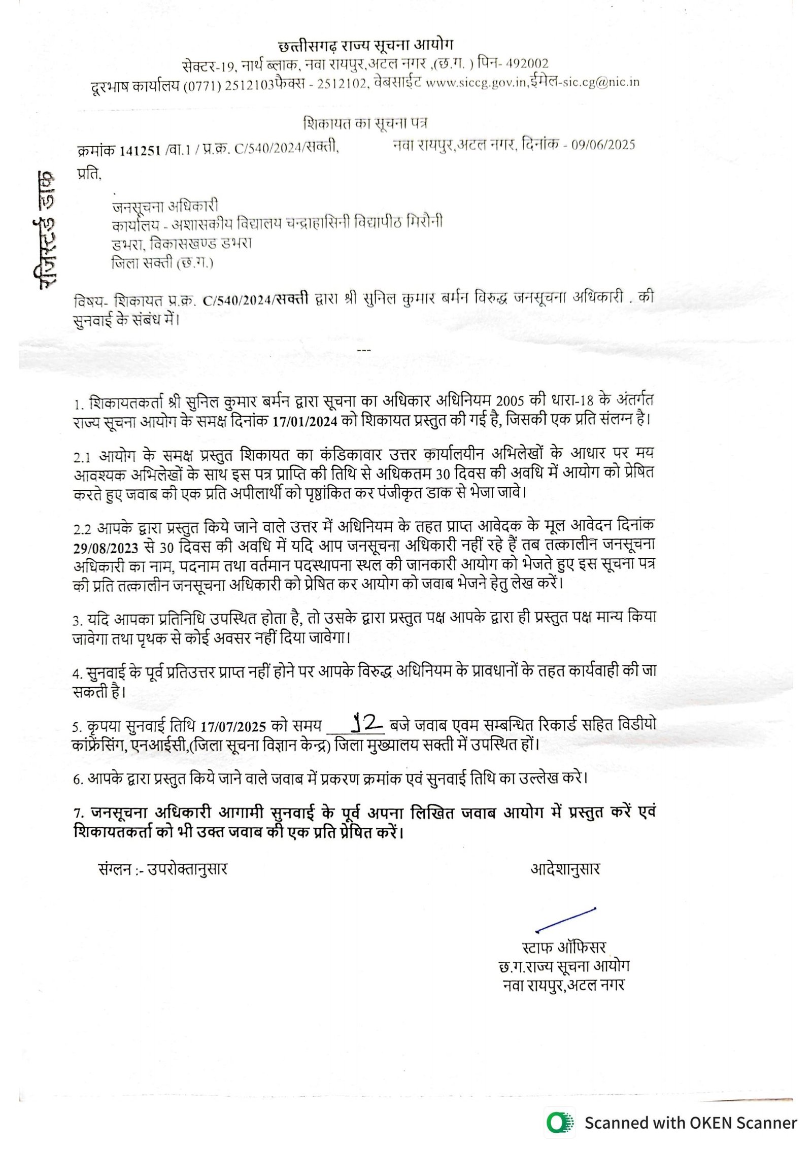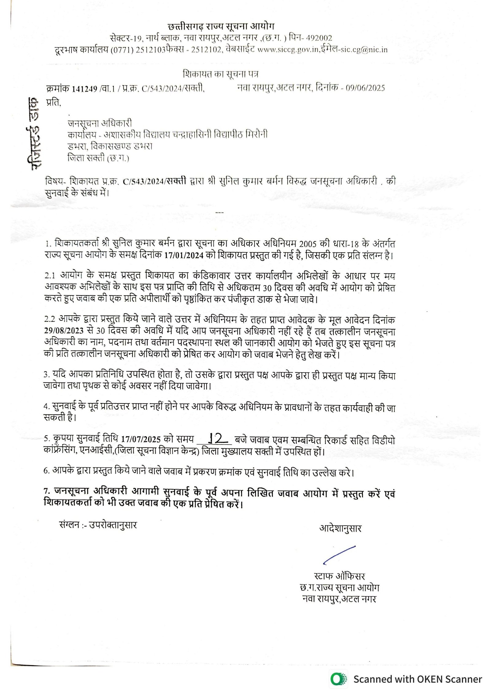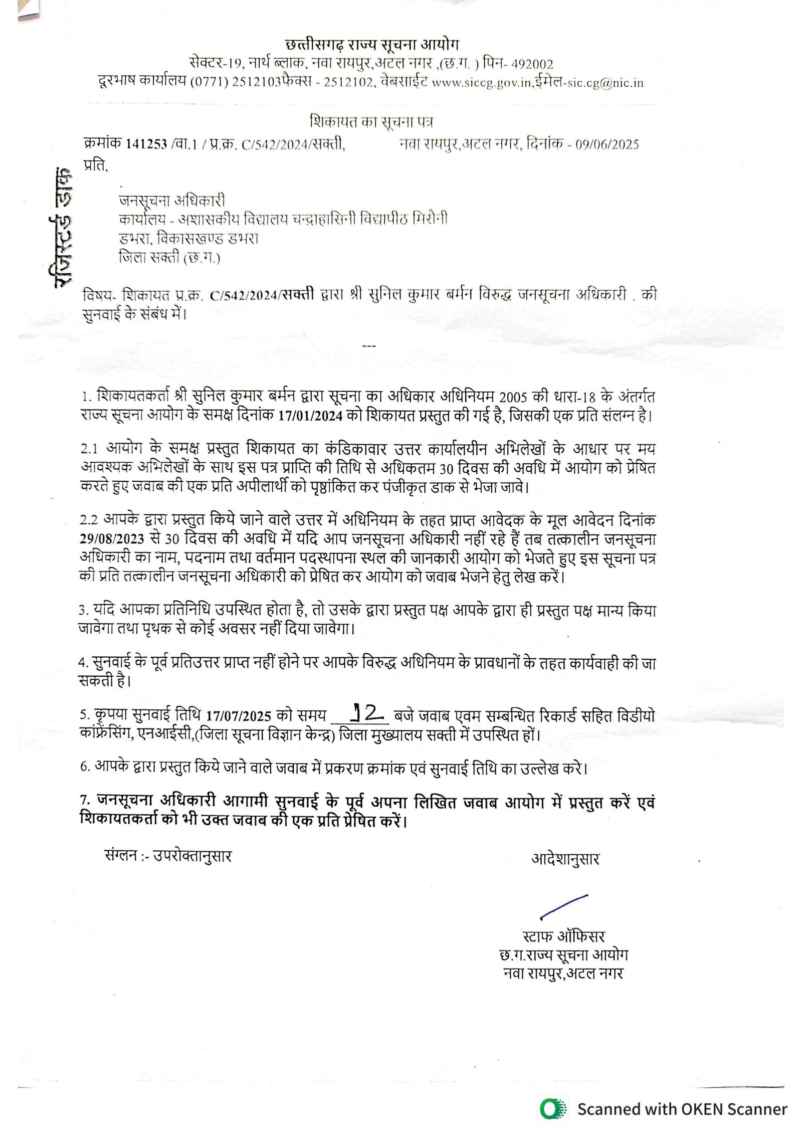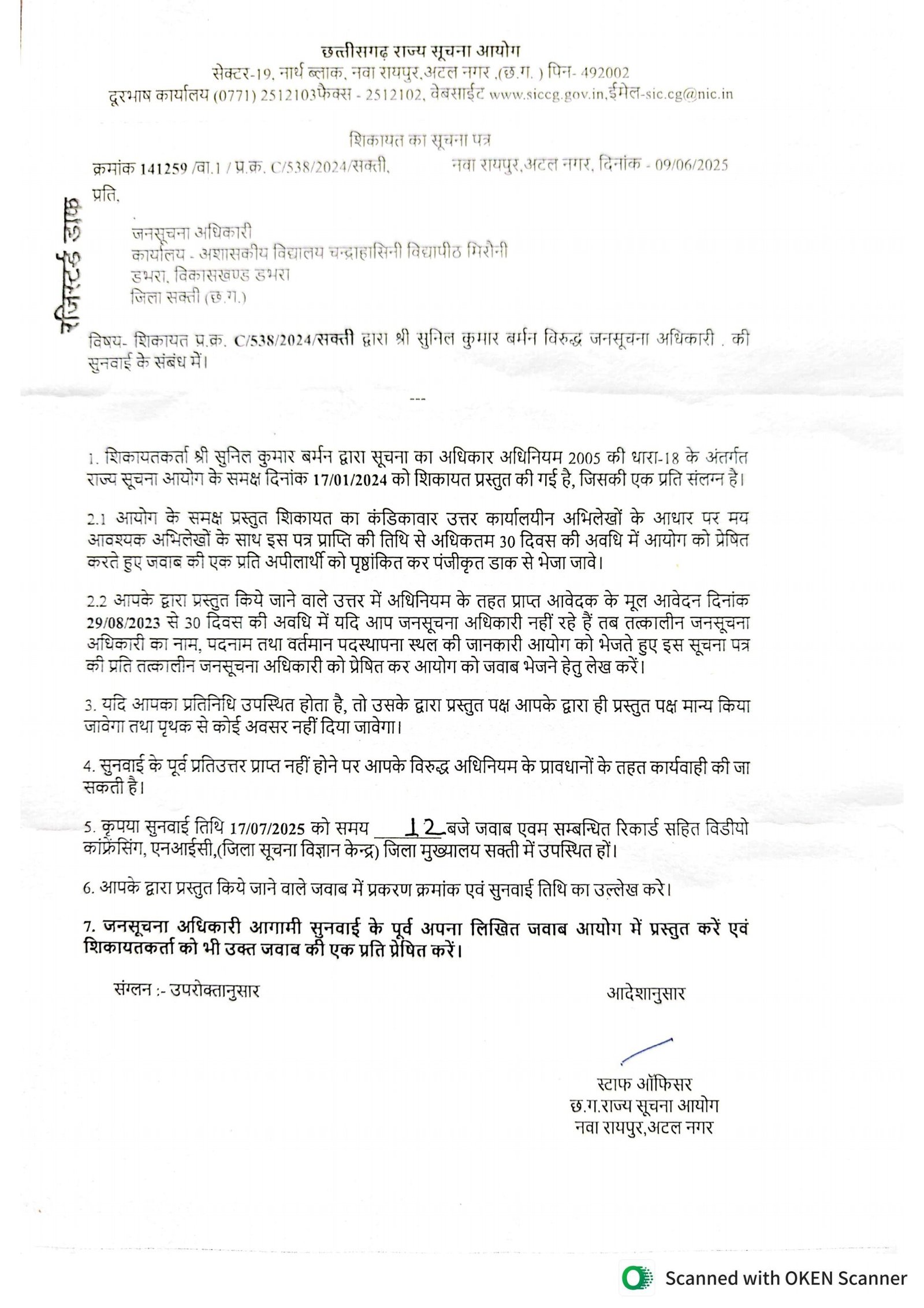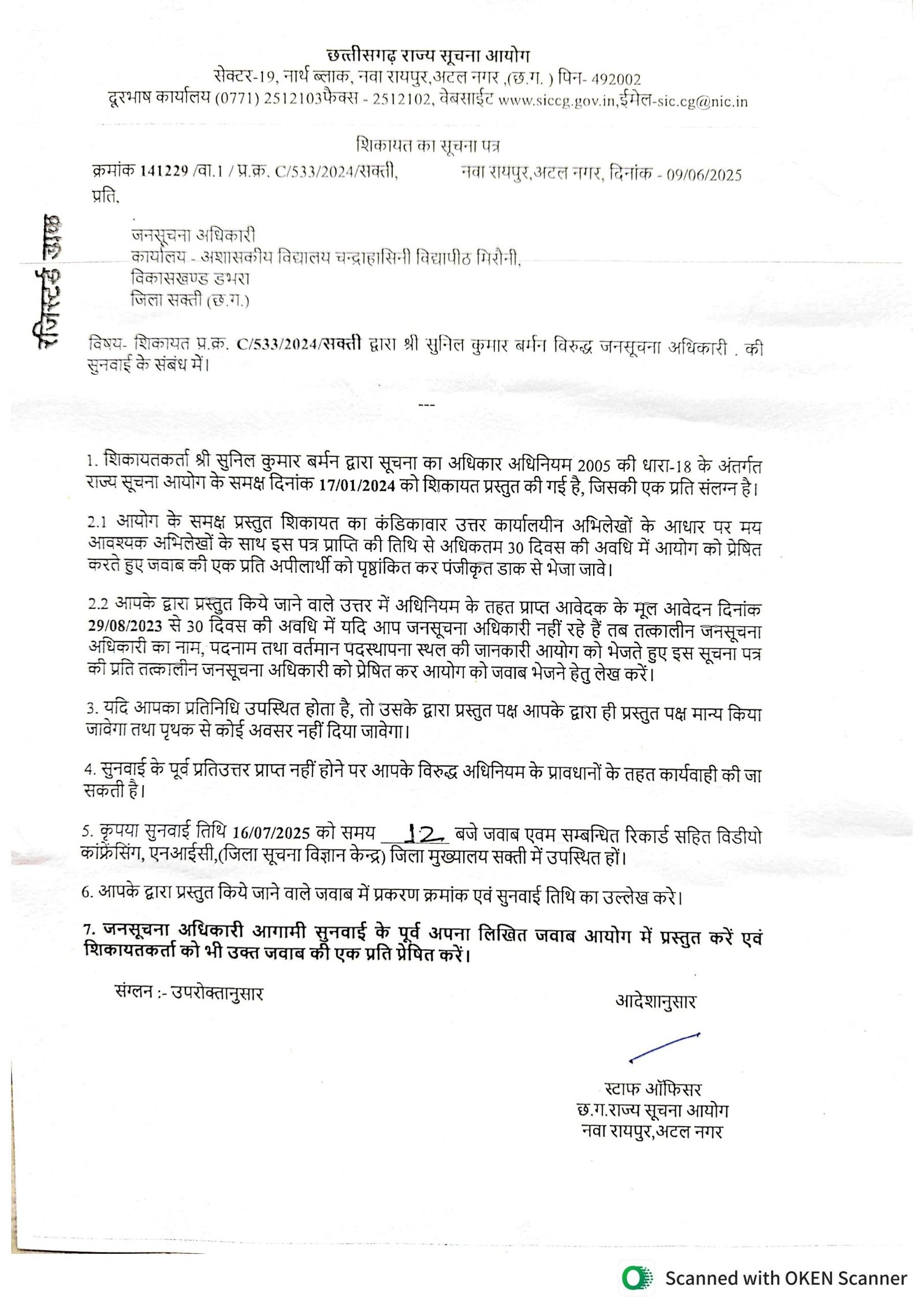 डभरा-सक्ती(एचकेपी 24 न्यूज)।सूचना का अधिकार 2005 के तहत् अलग-अलग विषय उल्लेखित 21 आवेदन पत्र प्रेषित कर मांगी गई सार्वजनिक करने योग्य सामान्य जानकारी को अशासकीय विद्यालय चन्द्रहासिनी विद्यापीठ मिरौनी प्रबंधन ने धारा 8(1)(डी) (ह)(जे) का हवाला देकर मांगी गई जानकारी को उपलब्ध करवाने अस्मर्थता व्यक्त करने पर आपत्ति जताते हुए हिन्देश एजुकेशन हेल्थ एण्ड वेलफेयर फाउण्डेशन(रजिस्टर्ड)के अध्यक्ष सुनिल कुमार बर्मन के द्वारा लिखित शिकायत किए जाने पर छत्तीसगढ़ राज्य सूचना आयोग ने सम्बंधित जन सूचना अधिकारी को 21 नोटिस पत्र जारी कर 17/07/2025 को जवाब एवं सम्बंधित रिकार्ड सहित विडियो कांफ्रेंसिंग एनआईसी जिला मुख्यालय सक्ती में उपस्थित होने आदेश जारी किया है।