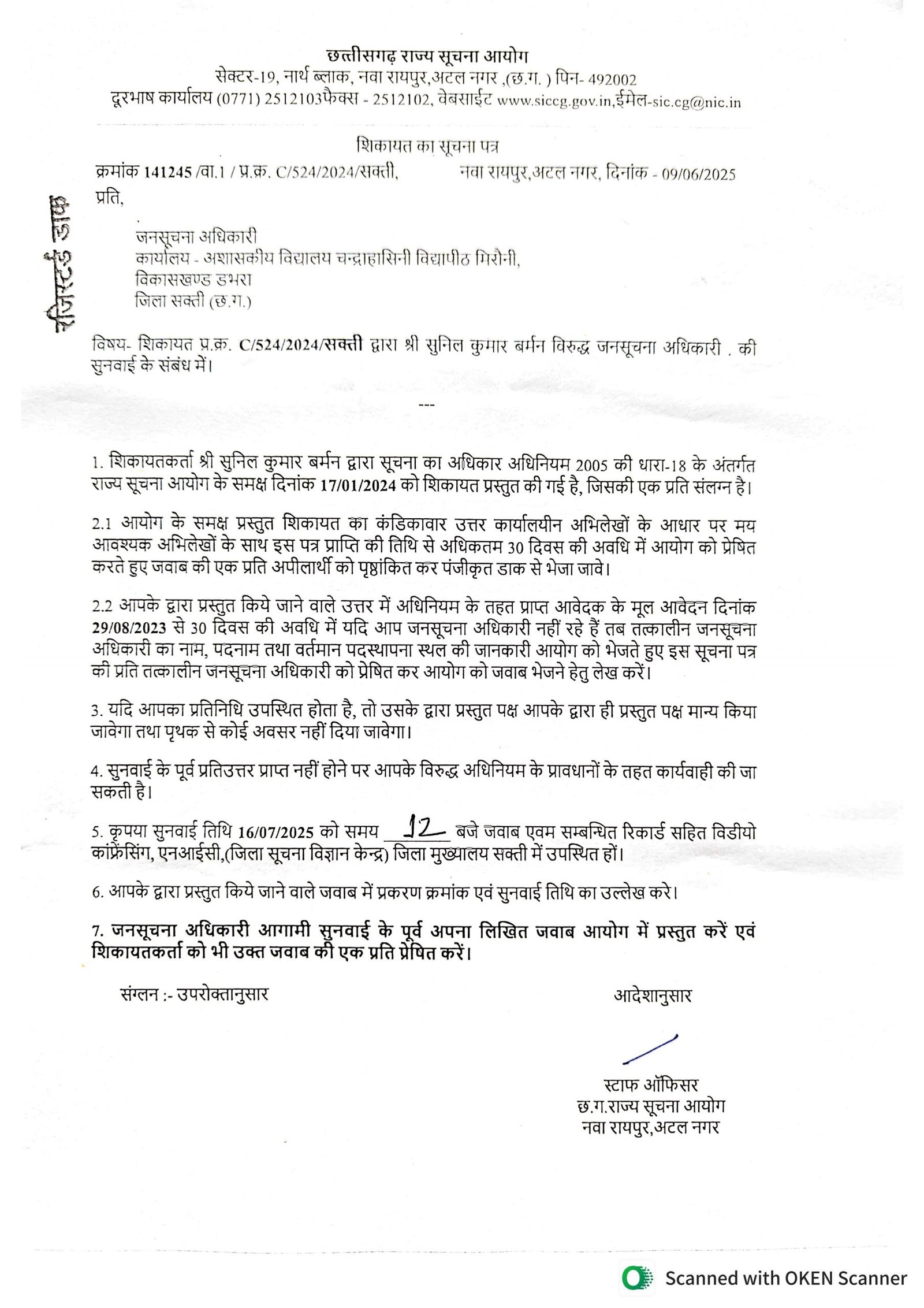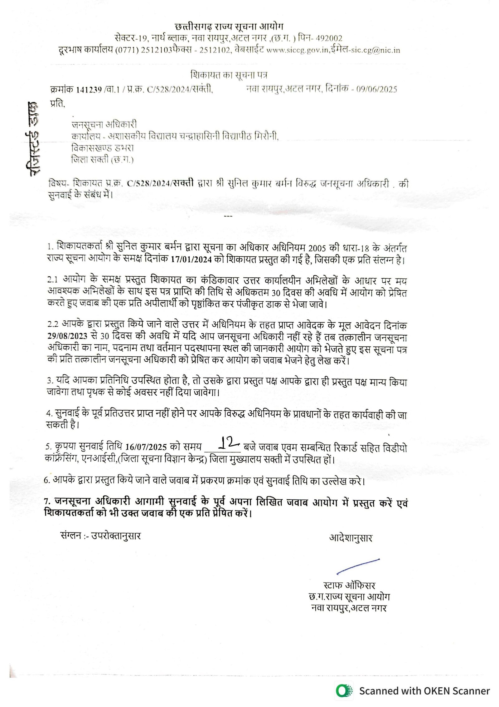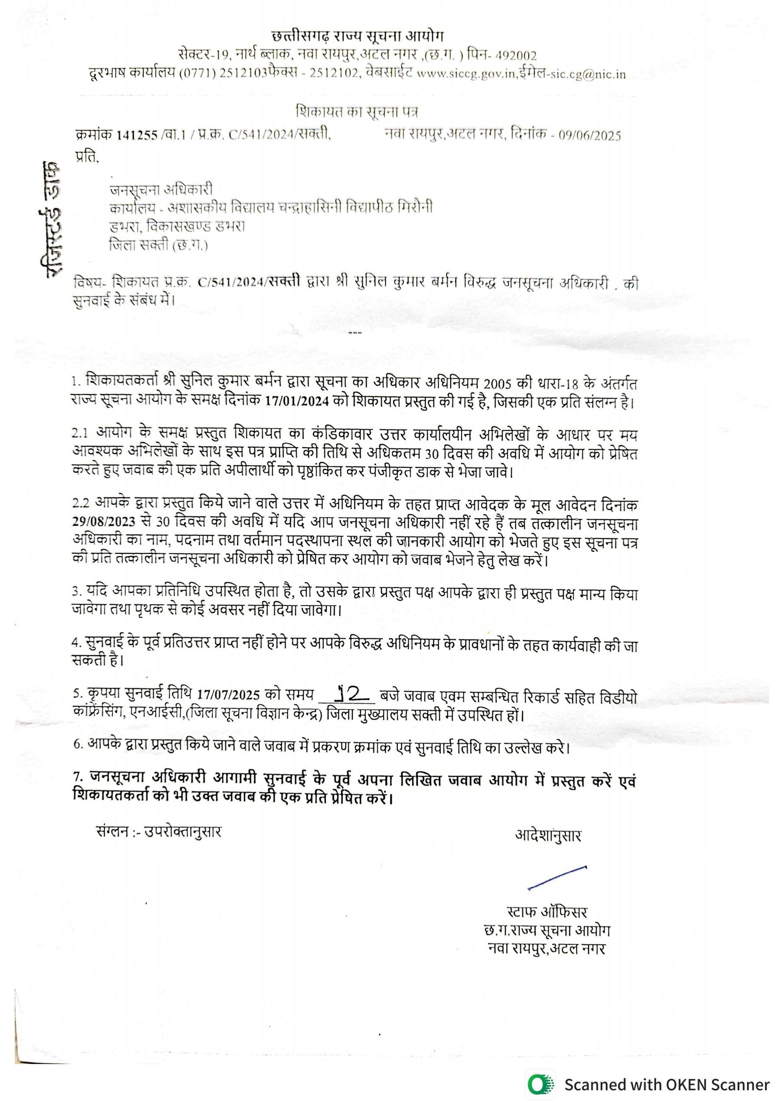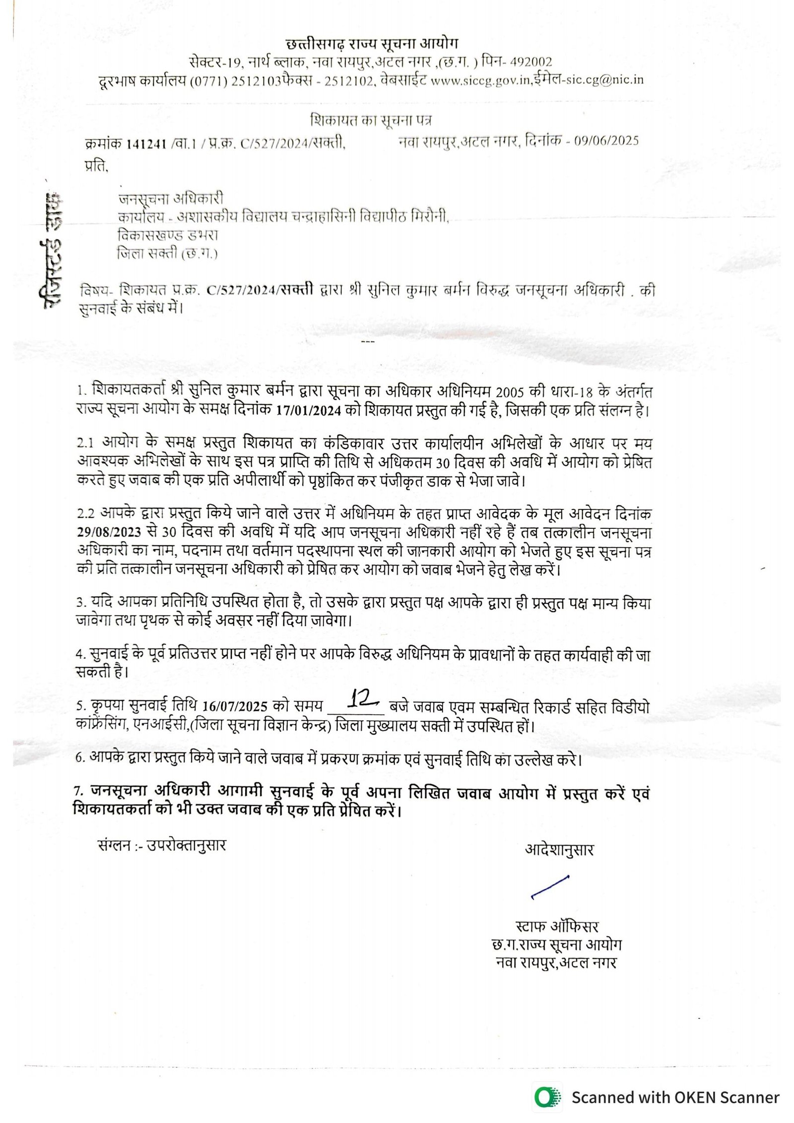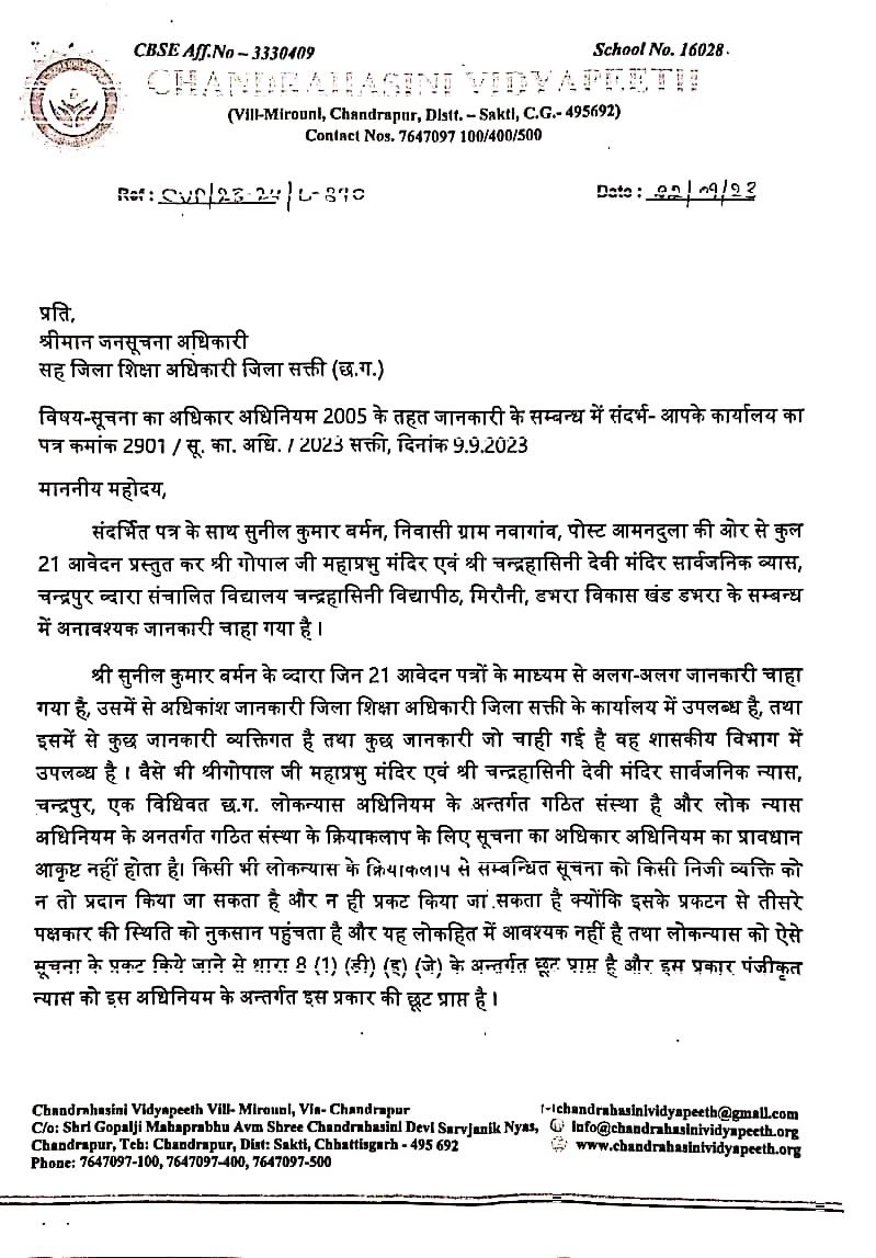 डभरा-सक्ती(एचकेपी 24 न्यूज)।सूचना का अधिकार 2005 के तहत् अलग-अलग विषय उल्लेखित 21 आवेदन पत्र प्रेषित कर मांगी गई सार्वजनिक करने योग्य सामान्य जानकारी को अशासकीय विद्यालय चन्द्रहासिनी विद्यापीठ मिरौनी प्रबंधन ने धारा 8(1)(डी) (ह)(जे) का हवाला देकर मांगी गई जानकारी को उपलब्ध करवाने अस्मर्थता व्यक्त करने पर आपत्ति जताते हुए हिन्देश एजुकेशन हेल्थ एण्ड वेलफेयर फाउण्डेशन(रजिस्टर्ड)के अध्यक्ष सुनिल कुमार बर्मन के द्वारा लिखित शिकायत किए जाने पर छत्तीसगढ़ राज्य सूचना आयोग ने सम्बंधित जन सूचना अधिकारी को 21 नोटिस पत्र जारी कर 17/07/2025 को जवाब एवं सम्बंधित रिकार्ड सहित विडियो कांफ्रेंसिंग एनआईसी जिला मुख्यालय सक्ती में उपस्थित होने आदेश जारी किया है।