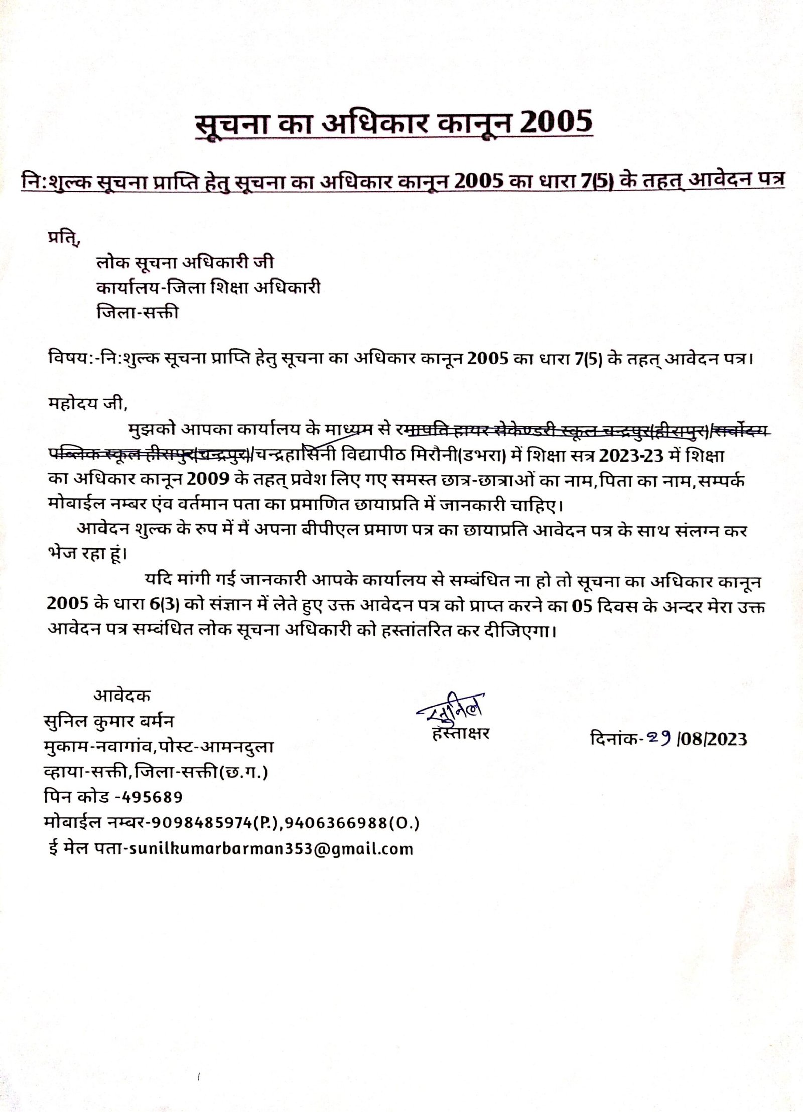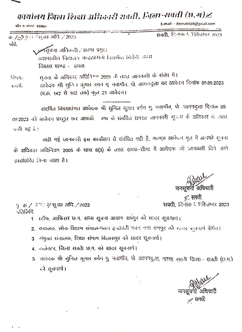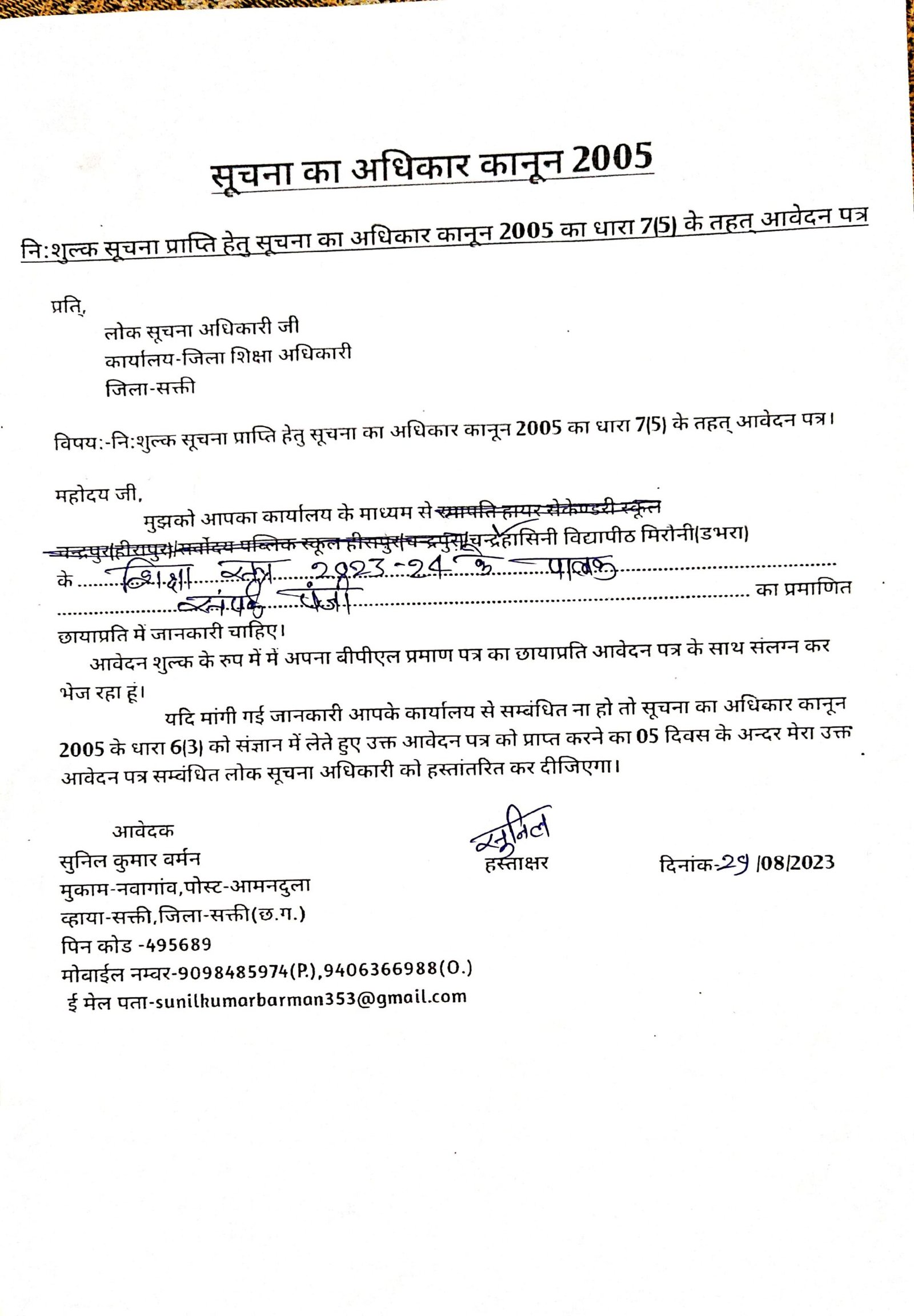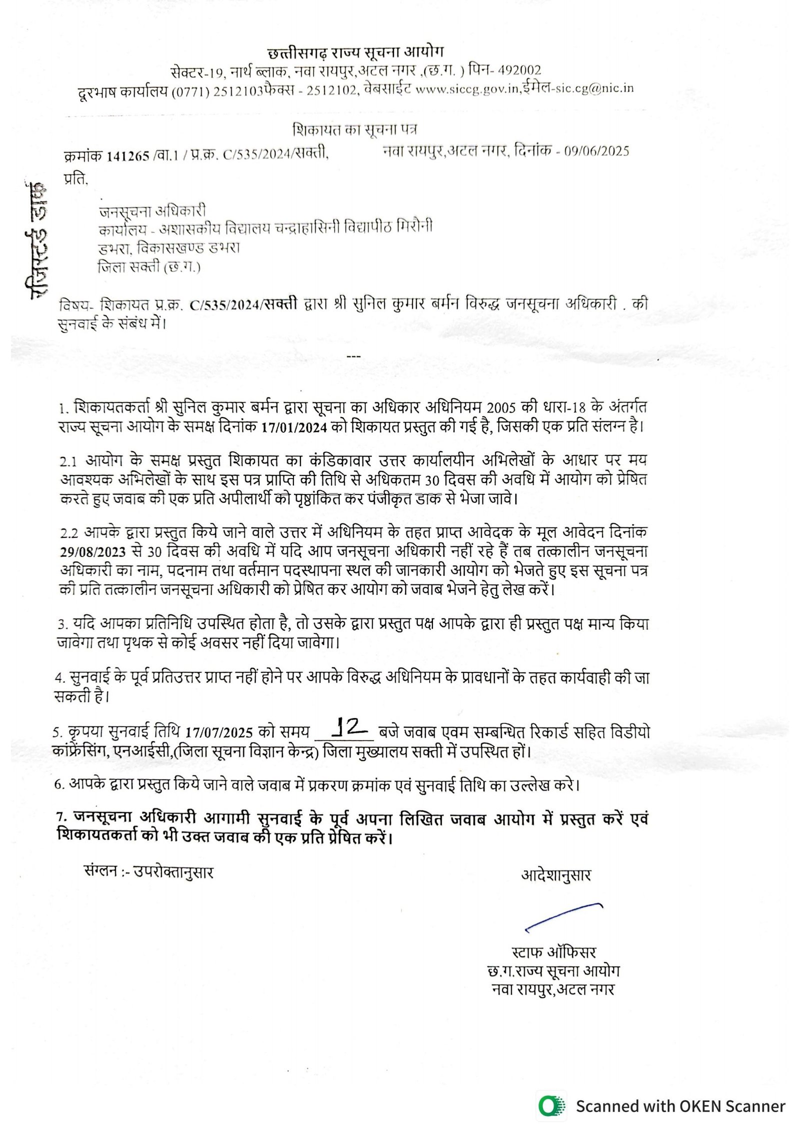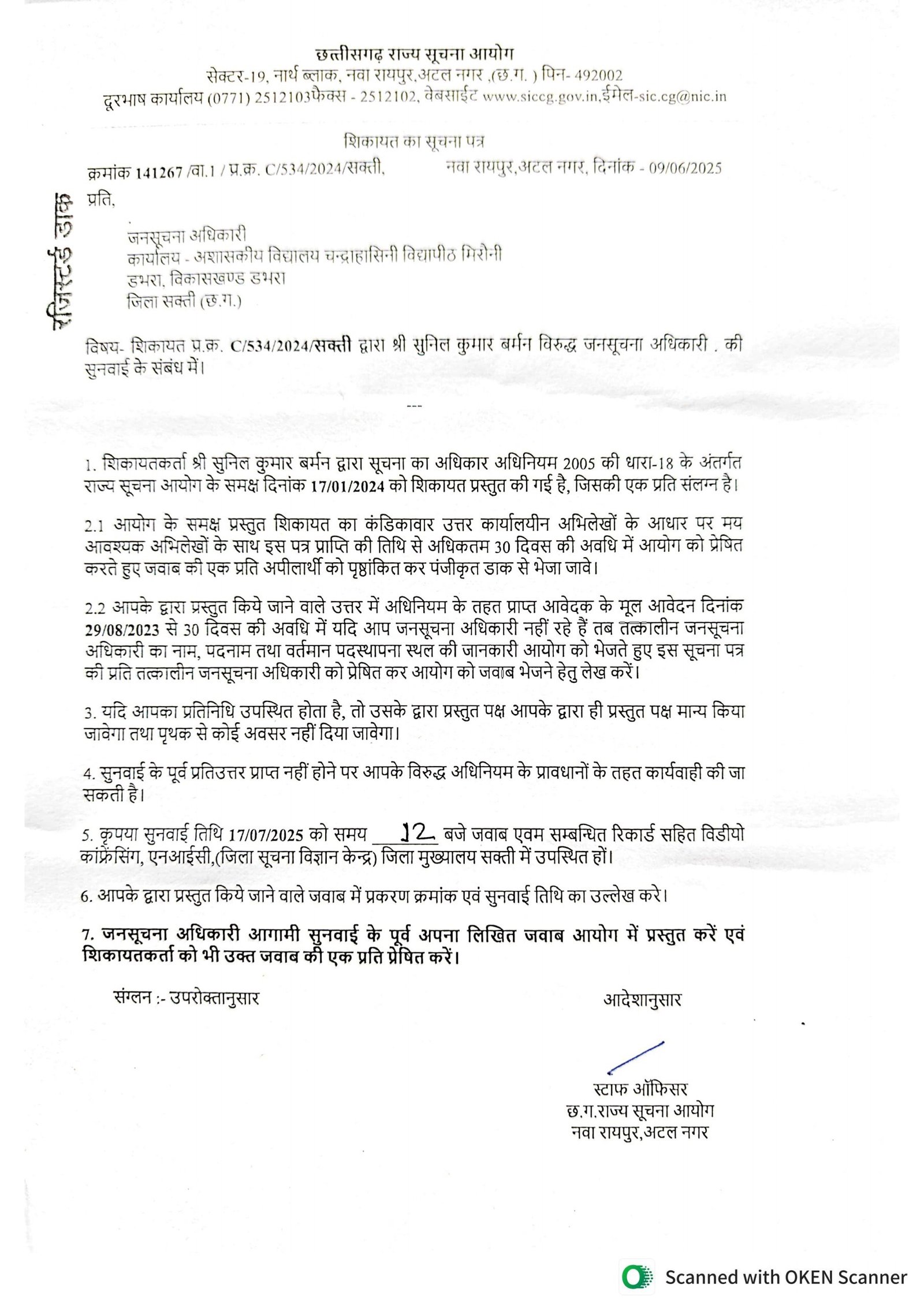 डभरा-सक्ती(एचकेपी 24 न्यूज)।सूचना का अधिकार 2005 के तहत् अलग-अलग विषय उल्लेखित 21 आवेदन पत्र प्रेषित कर मांगी गई सार्वजनिक करने योग्य सामान्य जानकारी को अशासकीय विद्यालय चन्द्रहासिनी विद्यापीठ मिरौनी प्रबंधन ने धारा 8(1)(डी) (ह)(जे) का हवाला देकर मांगी गई जानकारी को उपलब्ध करवाने अस्मर्थता व्यक्त करने पर आपत्ति जताते हुए हिन्देश एजुकेशन हेल्थ एण्ड वेलफेयर फाउण्डेशन(रजिस्टर्ड)के अध्यक्ष सुनिल कुमार बर्मन के द्वारा लिखित शिकायत किए जाने पर छत्तीसगढ़ राज्य सूचना आयोग ने सम्बंधित जन सूचना अधिकारी को 21 नोटिस पत्र जारी कर 17/07/2025 को जवाब एवं सम्बंधित रिकार्ड सहित विडियो कांफ्रेंसिंग एनआईसी जिला मुख्यालय सक्ती में उपस्थित होने आदेश जारी किया है।