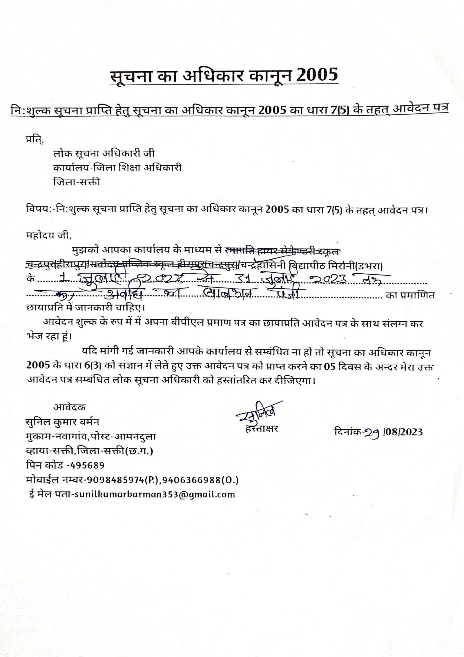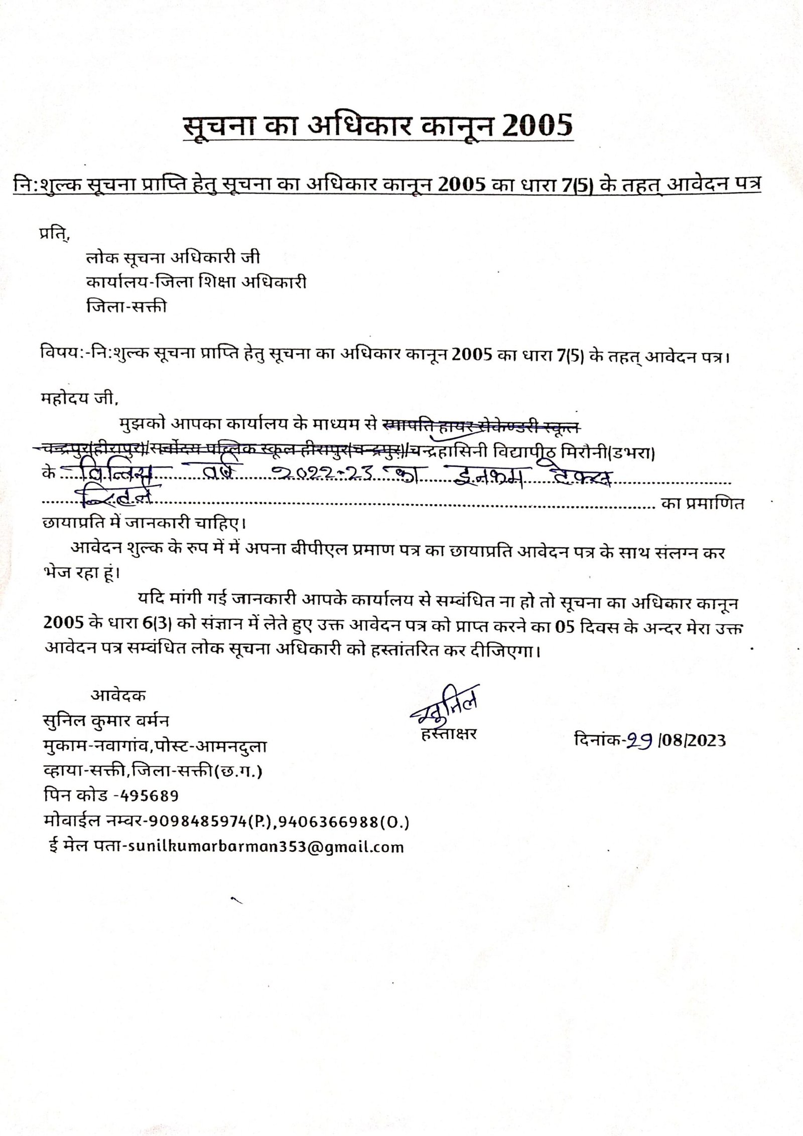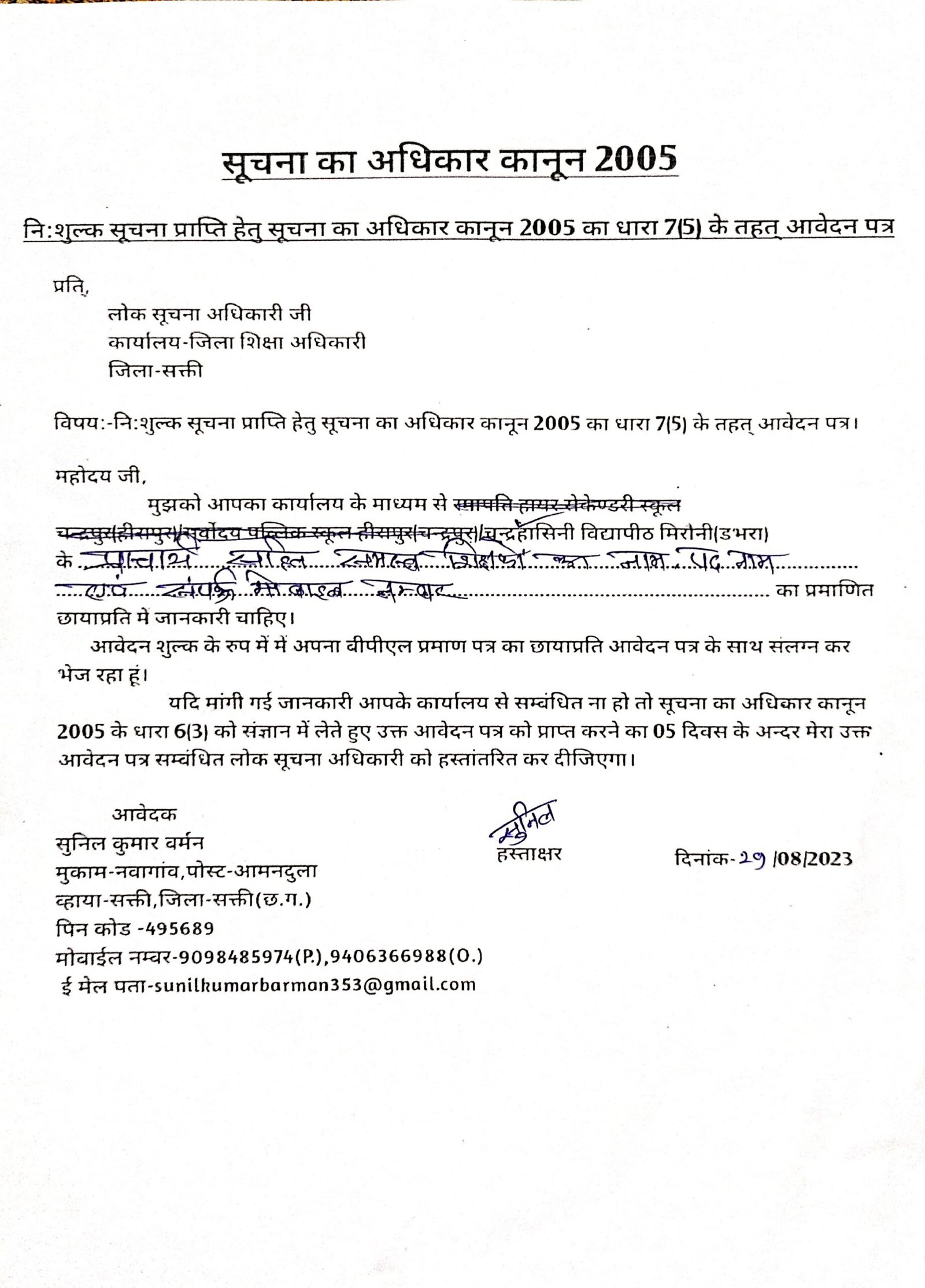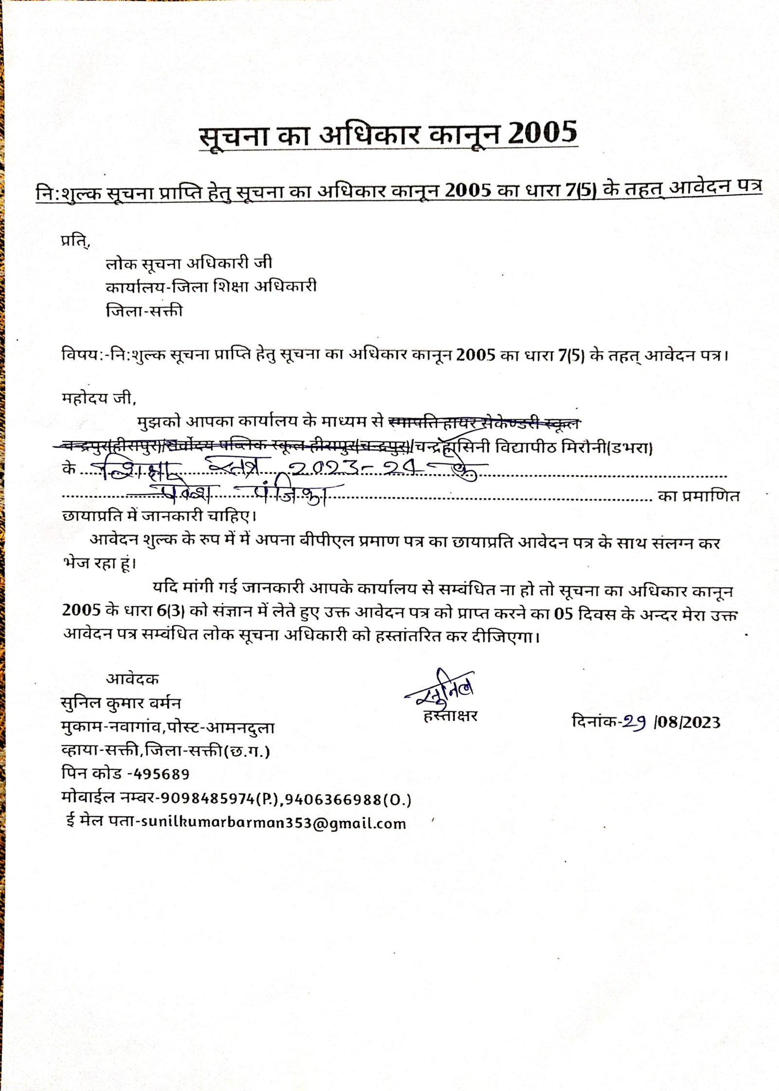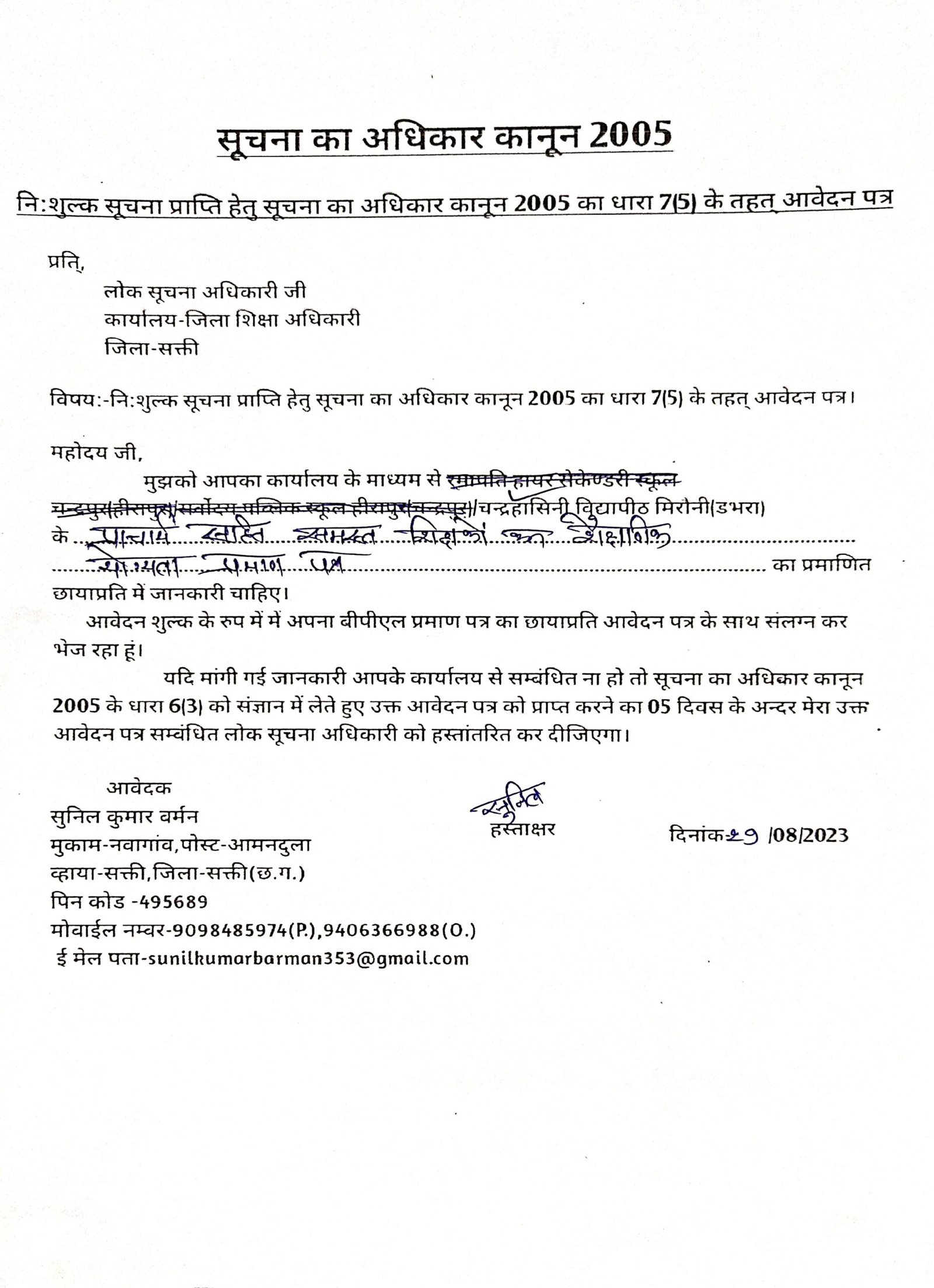डभरा-सक्ती(एचकेपी 24 न्यूज)।सूचना का अधिकार 2005 के तहत् अलग-अलग विषय उल्लेखित 21 आवेदन पत्र प्रेषित कर मांगी गई सार्वजनिक करने योग्य सामान्य जानकारी को अशासकीय विद्यालय चन्द्रहासिनी विद्यापीठ मिरौनी प्रबंधन ने धारा 8(1)(डी) (ह)(जे) का हवाला देकर मांगी गई जानकारी को उपलब्ध करवाने अस्मर्थता व्यक्त करने पर आपत्ति जताते हुए हिन्देश एजुकेशन हेल्थ एण्ड वेलफेयर फाउण्डेशन(रजिस्टर्ड)के अध्यक्ष सुनिल कुमार बर्मन के द्वारा लिखित शिकायत किए जाने पर छत्तीसगढ़ राज्य सूचना आयोग ने सम्बंधित जन सूचना अधिकारी को 21 नोटिस पत्र जारी कर 17/07/2025 को जवाब एवं सम्बंधित रिकार्ड सहित विडियो कांफ्रेंसिंग एनआईसी जिला मुख्यालय सक्ती में उपस्थित होने आदेश जारी किया है।
