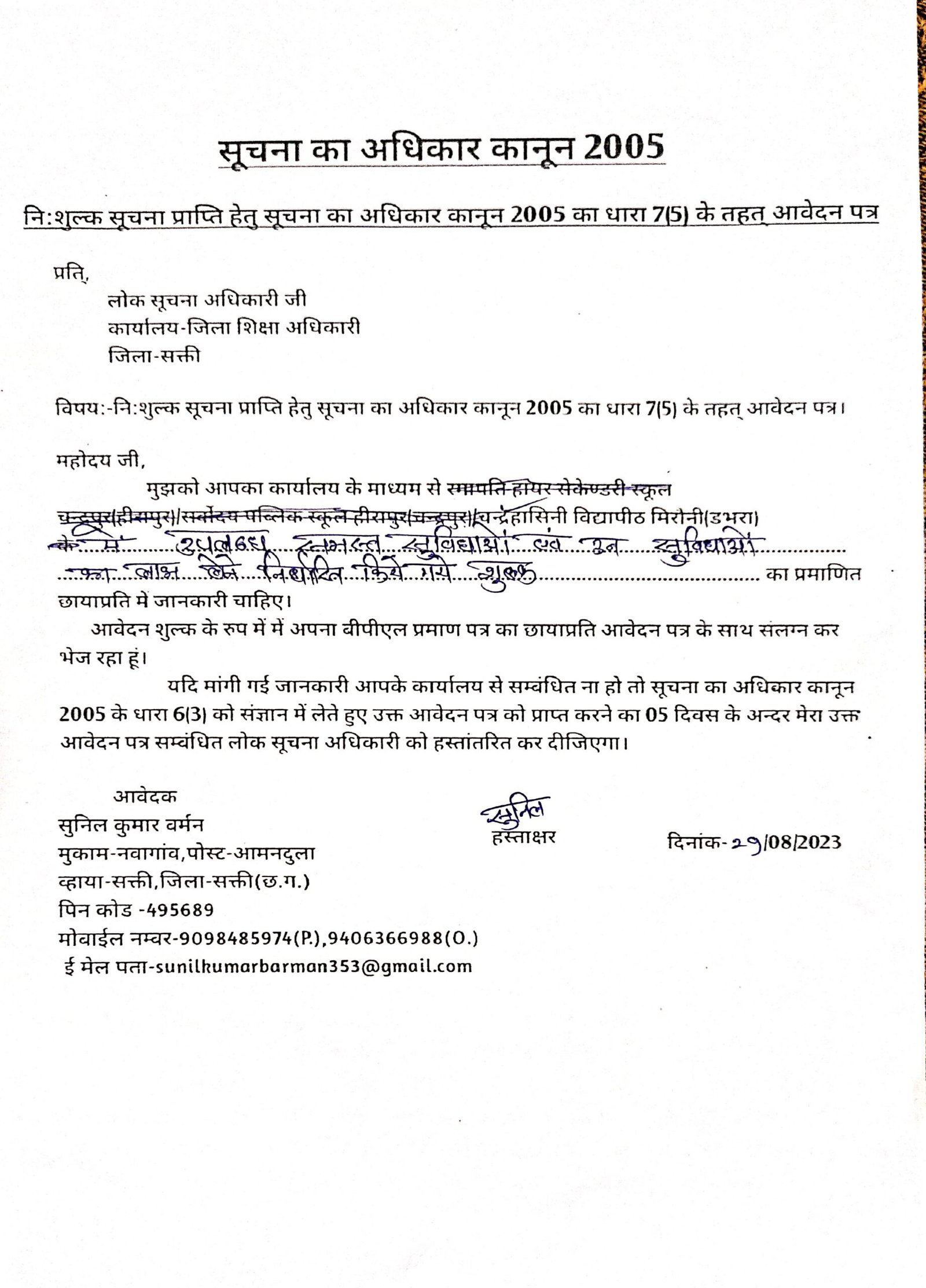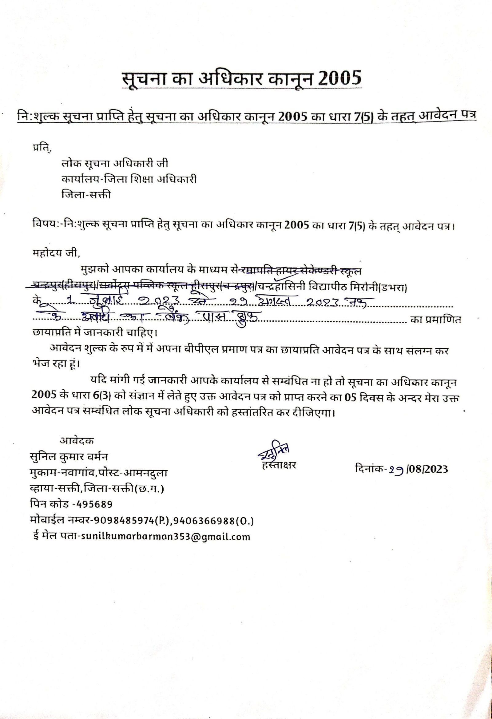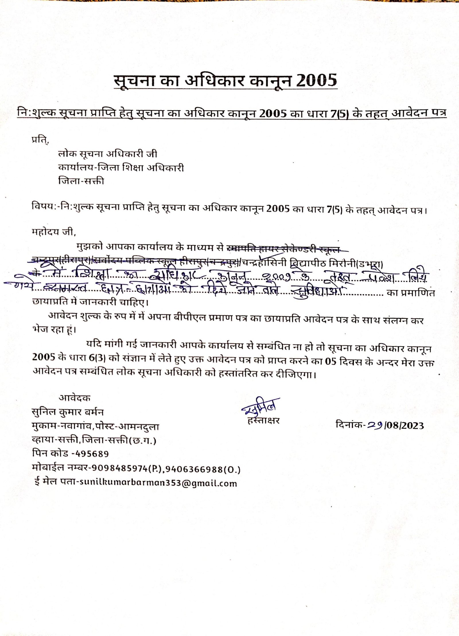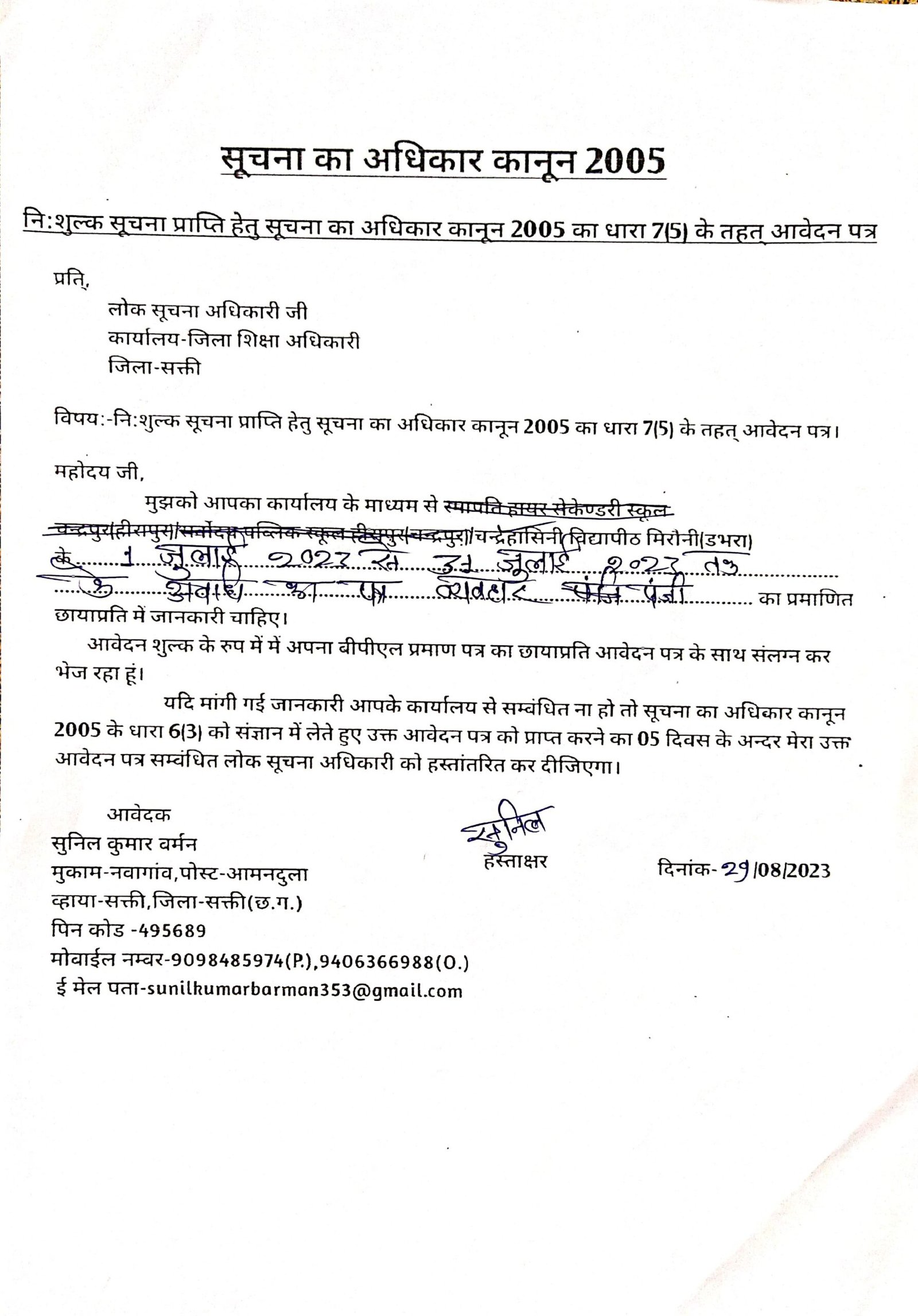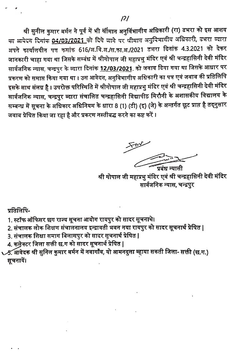 डभरा-सक्ती(एचकेपी 24 न्यूज)।सूचना का अधिकार 2005 के तहत् अलग-अलग विषय उल्लेखित 21 आवेदन पत्र प्रेषित कर मांगी गई सार्वजनिक करने योग्य सामान्य जानकारी को अशासकीय विद्यालय चन्द्रहासिनी विद्यापीठ मिरौनी प्रबंधन ने धारा 8(1)(डी) (ह)(जे) का हवाला देकर मांगी गई जानकारी को उपलब्ध करवाने अस्मर्थता व्यक्त करने पर आपत्ति जताते हुए हिन्देश एजुकेशन हेल्थ एण्ड वेलफेयर फाउण्डेशन(रजिस्टर्ड)के अध्यक्ष सुनिल कुमार बर्मन के द्वारा लिखित शिकायत किए जाने पर छत्तीसगढ़ राज्य सूचना आयोग ने सम्बंधित जन सूचना अधिकारी को 21 नोटिस पत्र जारी कर 17/07/2025 को जवाब एवं सम्बंधित रिकार्ड सहित विडियो कांफ्रेंसिंग एनआईसी जिला मुख्यालय सक्ती में उपस्थित होने आदेश जारी किया है।