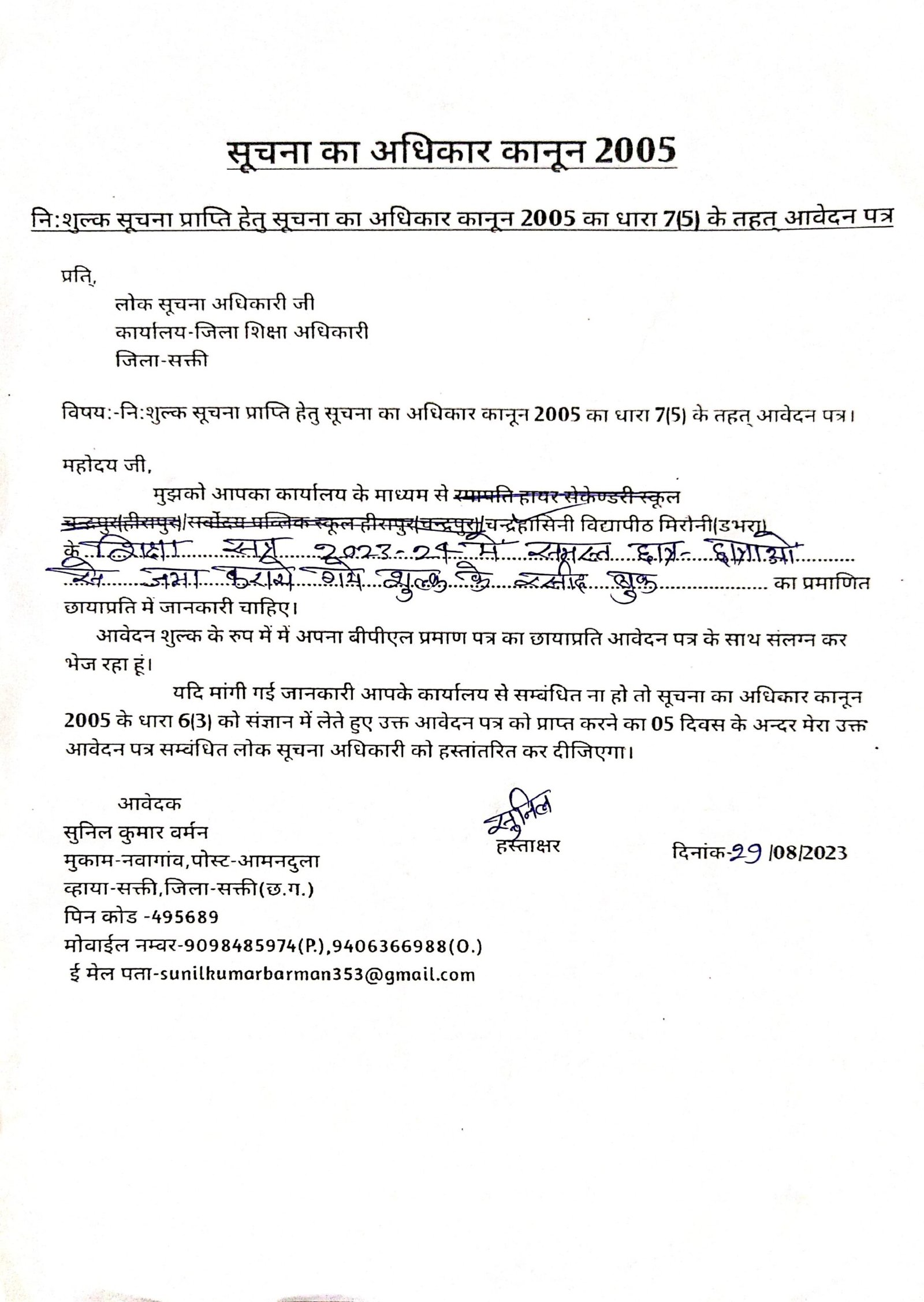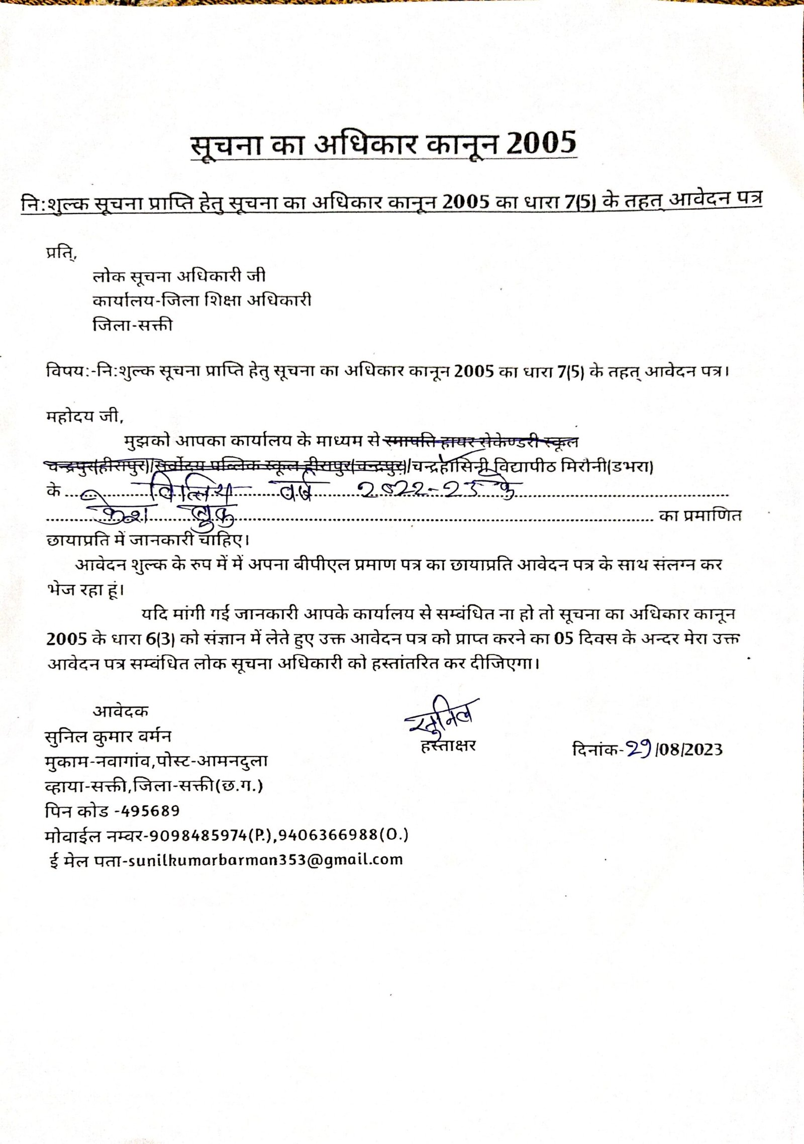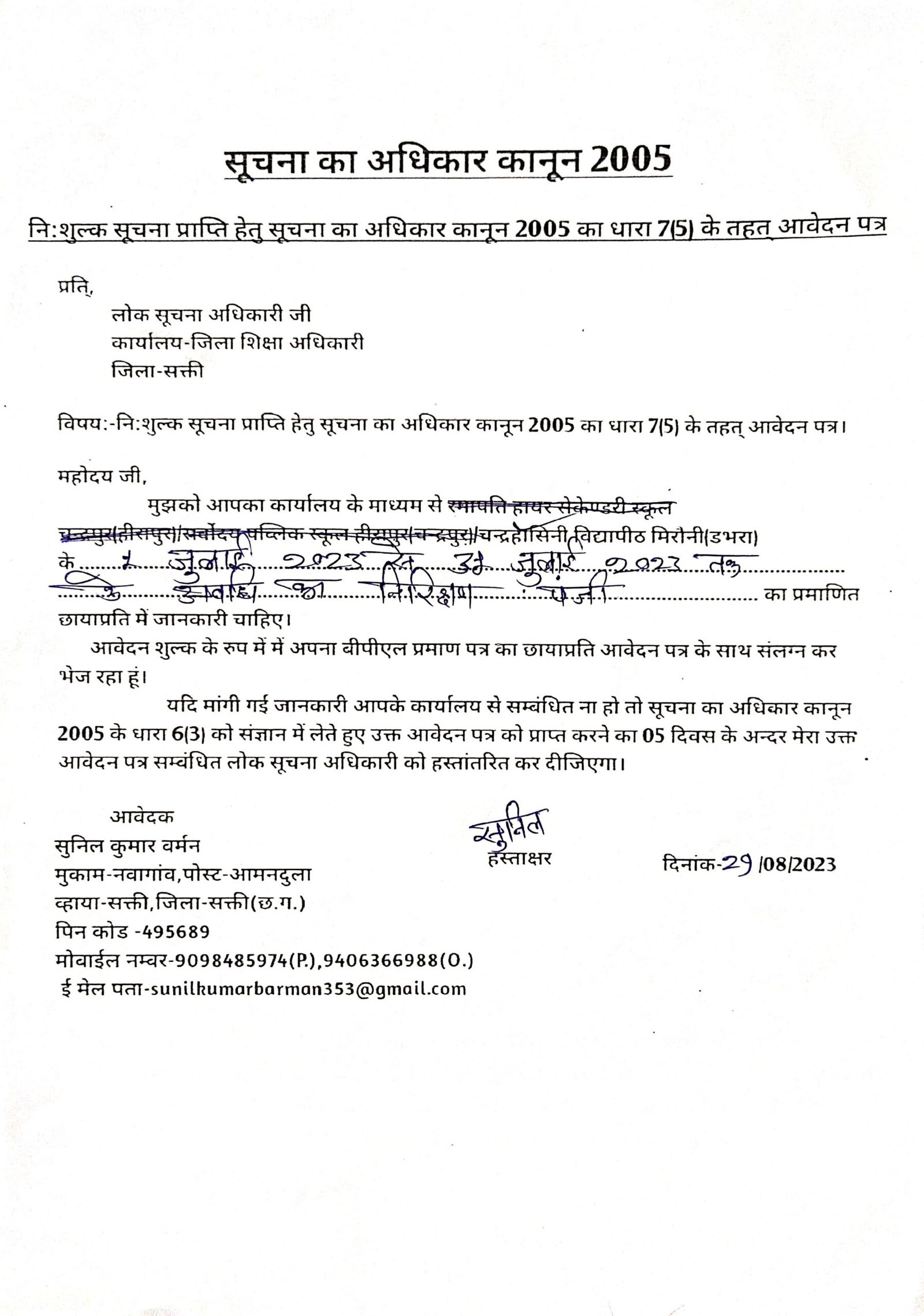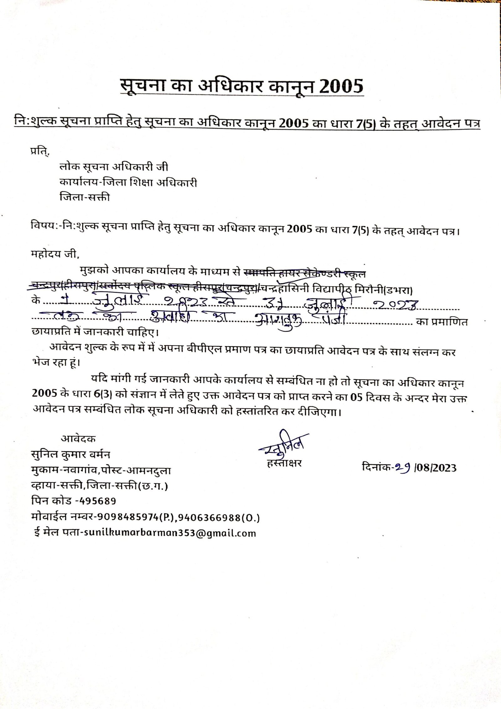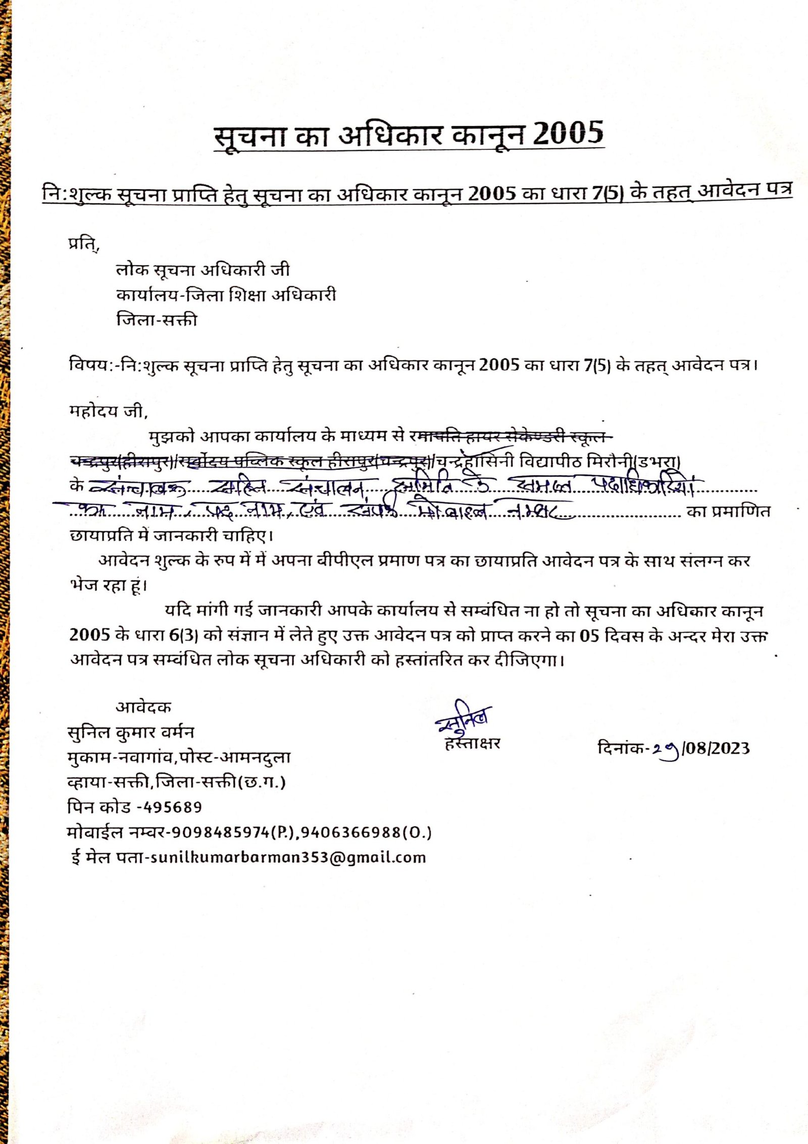 डभरा-सक्ती(एचकेपी 24 न्यूज)।सूचना का अधिकार 2005 के तहत् अलग-अलग विषय उल्लेखित 21 आवेदन पत्र प्रेषित कर मांगी गई सार्वजनिक करने योग्य सामान्य जानकारी को अशासकीय विद्यालय चन्द्रहासिनी विद्यापीठ मिरौनी प्रबंधन ने धारा 8(1)(डी) (ह)(जे) का हवाला देकर मांगी गई जानकारी को उपलब्ध करवाने अस्मर्थता व्यक्त करने पर आपत्ति जताते हुए हिन्देश एजुकेशन हेल्थ एण्ड वेलफेयर फाउण्डेशन(रजिस्टर्ड)के अध्यक्ष सुनिल कुमार बर्मन के द्वारा लिखित शिकायत किए जाने पर छत्तीसगढ़ राज्य सूचना आयोग ने सम्बंधित जन सूचना अधिकारी को 21 नोटिस पत्र जारी कर 17/07/2025 को जवाब एवं सम्बंधित रिकार्ड सहित विडियो कांफ्रेंसिंग एनआईसी जिला मुख्यालय सक्ती में उपस्थित होने आदेश जारी किया है।