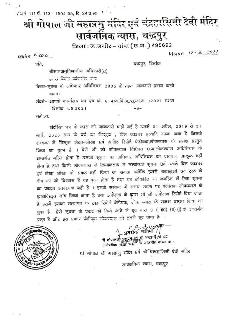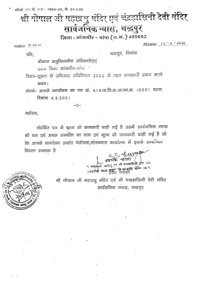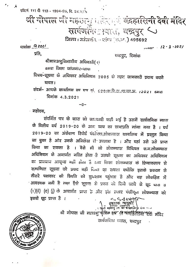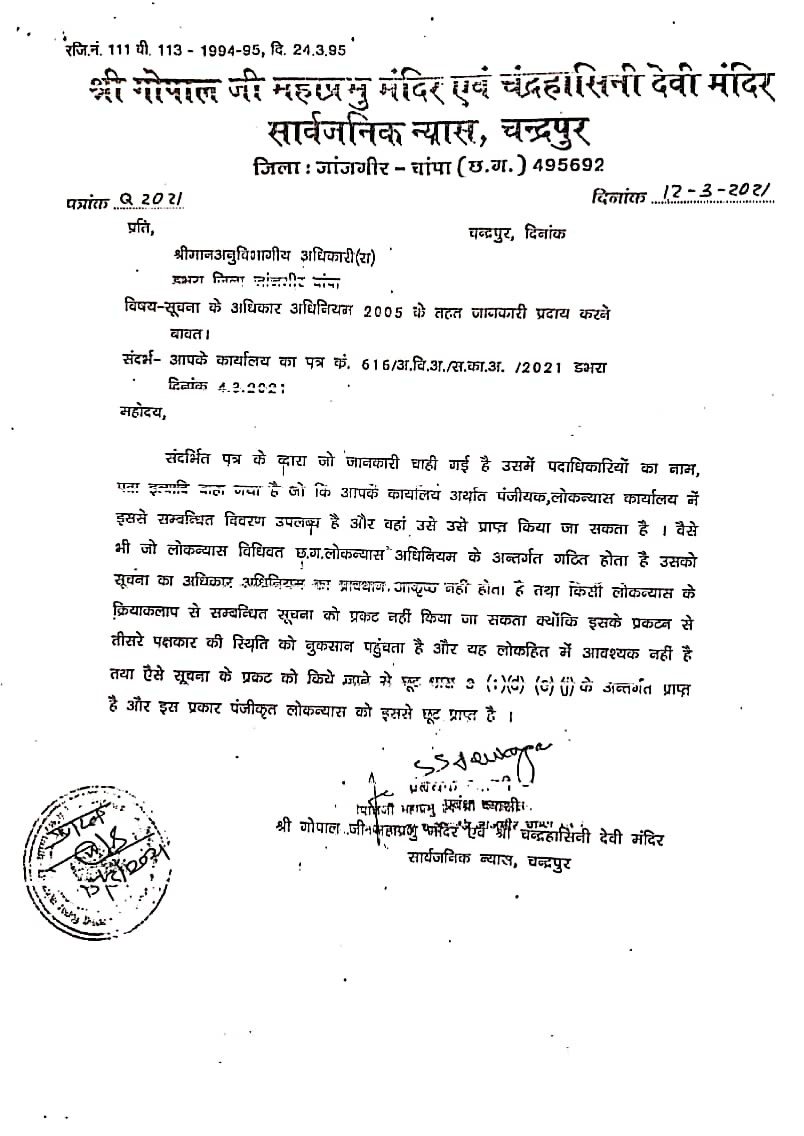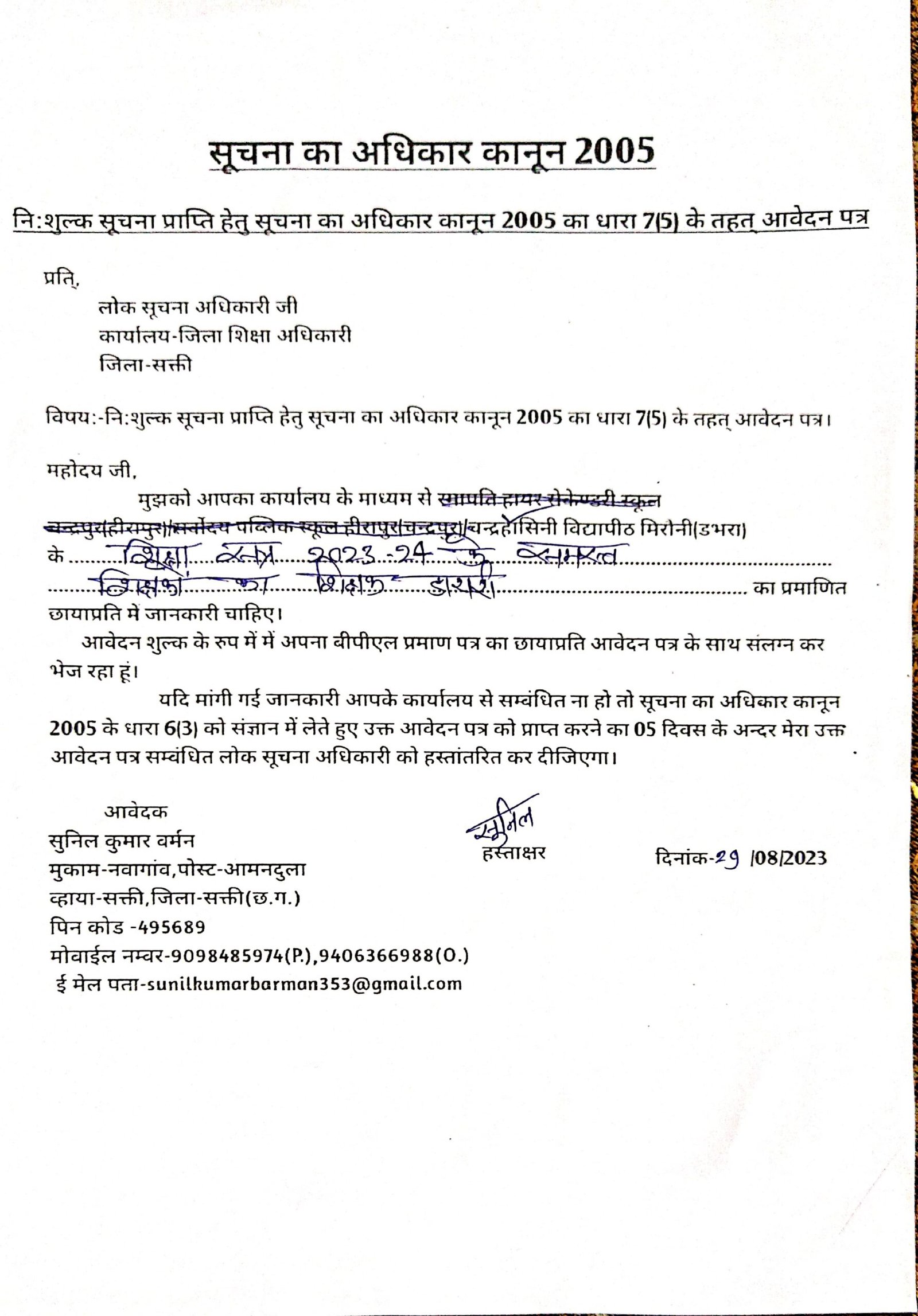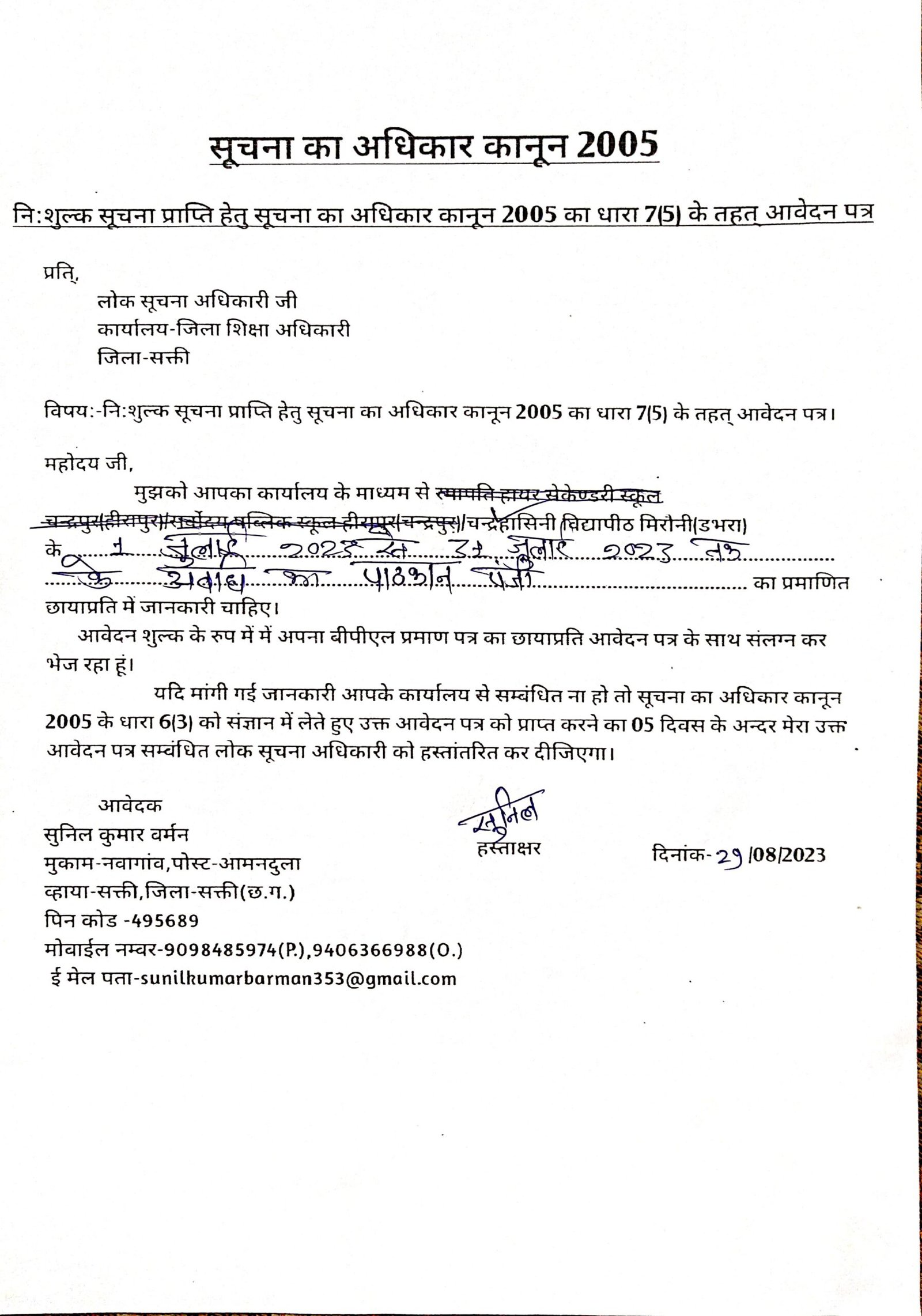 डभरा-सक्ती(एचकेपी 24 न्यूज)।सूचना का अधिकार 2005 के तहत् अलग-अलग विषय उल्लेखित 21 आवेदन पत्र प्रेषित कर मांगी गई सार्वजनिक करने योग्य सामान्य जानकारी को अशासकीय विद्यालय चन्द्रहासिनी विद्यापीठ मिरौनी प्रबंधन ने धारा 8(1)(डी) (ह)(जे) का हवाला देकर मांगी गई जानकारी को उपलब्ध करवाने अस्मर्थता व्यक्त करने पर आपत्ति जताते हुए हिन्देश एजुकेशन हेल्थ एण्ड वेलफेयर फाउण्डेशन(रजिस्टर्ड)के अध्यक्ष सुनिल कुमार बर्मन के द्वारा लिखित शिकायत किए जाने पर छत्तीसगढ़ राज्य सूचना आयोग ने सम्बंधित जन सूचना अधिकारी को 21 नोटिस पत्र जारी कर 17/07/2025 को जवाब एवं सम्बंधित रिकार्ड सहित विडियो कांफ्रेंसिंग एनआईसी जिला मुख्यालय सक्ती में उपस्थित होने आदेश जारी किया है।
