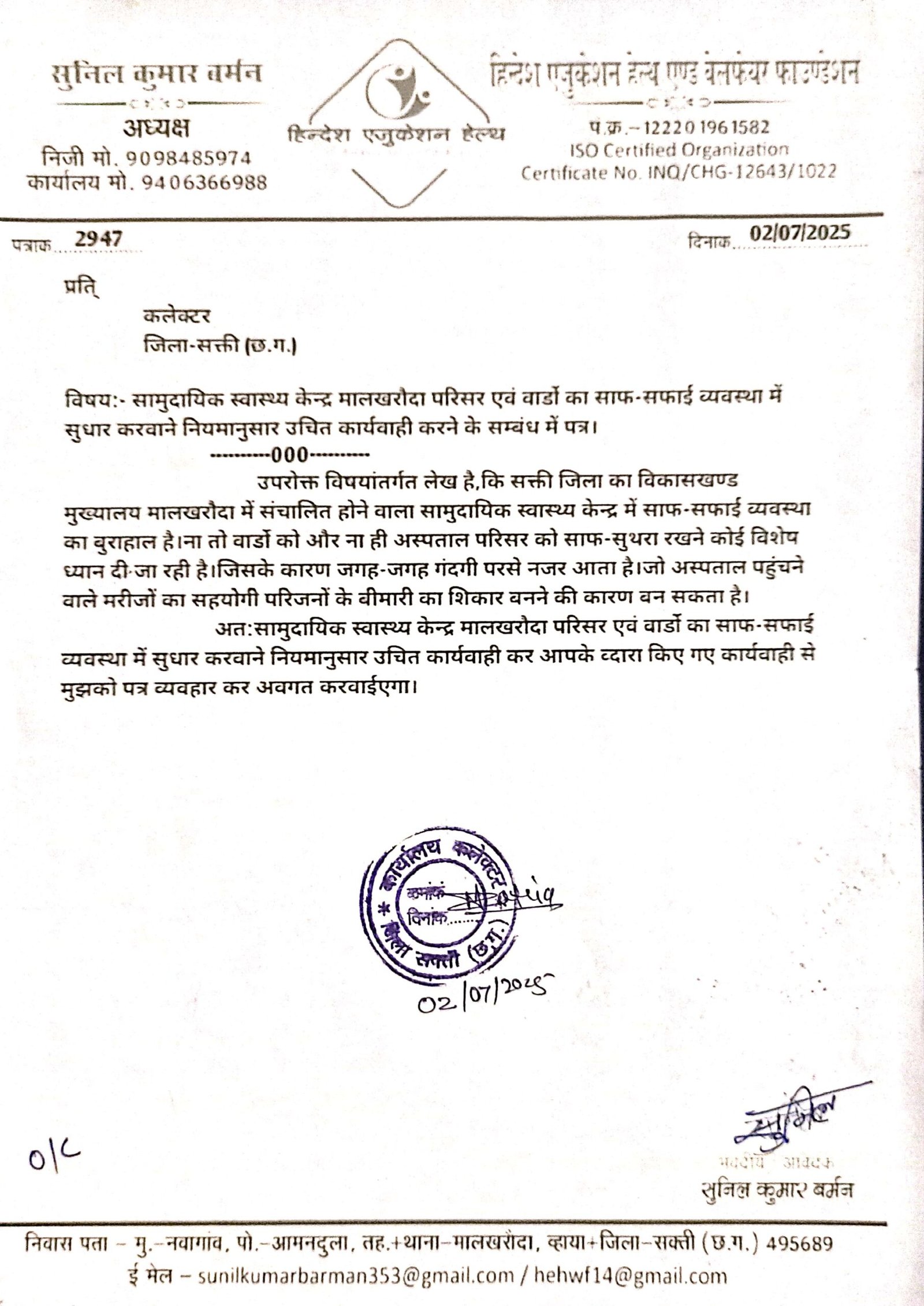 मालखरौदा-सक्ती(एचकेपी 24 न्यूज)।सामुदायिक स्वास्थ्य केन्द्र मालखरौदा परिसर एवं वार्डो में नहीं नियमित रुप से साफ-सफाई नहीं करवाया जा रहा है।जिसक स्वास्थ्य सेवाओं पर विपरीत असर पड़ रहा है।हिन्देश एजुकेशन हेल्थ एण्ड वेलफेयर फाउण्डेशन(रजिस्टर्ड) के अध्यक्ष सुनिल कुमार बर्मन ने स्वच्छता व्यवस्था में आवश्यक सुधार लाने नियमानुसार उचित कार्यवाही करने कलेक्टर को पत्र लिखा है।