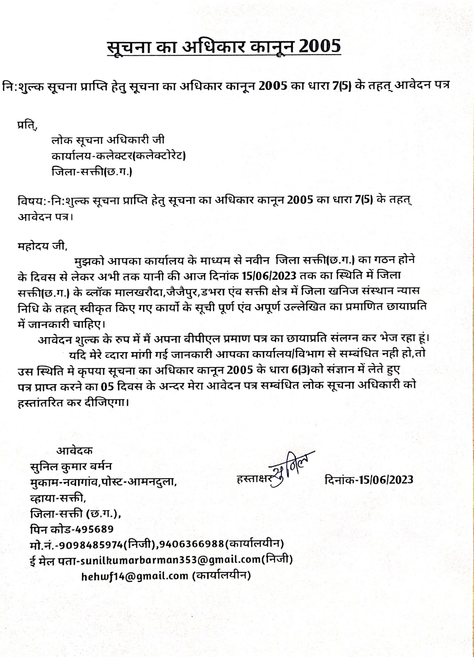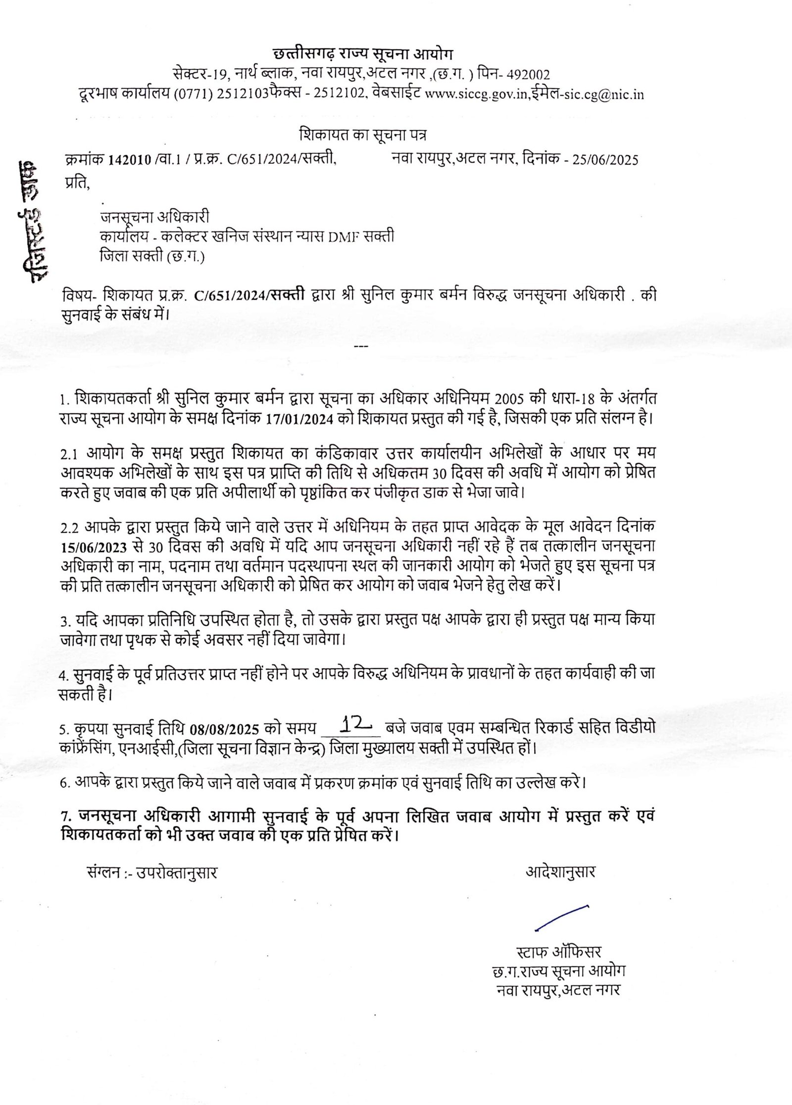 सक्ती(एचकेपी 24 न्यूज)।सूचना का अधिकार 2005 के तहत् जिला खनिज संस्थान न्यास निधि से जुड़े एक विषय पर आवेदन पत्र प्रेषित कर मांगी गई जानकारी को उपलब्ध नहीं करवाए जाने पर हिन्देश एजुकेशन हेल्थ एण्ड वेलफेयर फाउण्डेशन(रजिस्टर्ड)के अध्यक्ष सुनिल कुमार बर्मन के द्वारा लिखित शिकायत किए जाने पर छत्तीसगढ़ राज्य सूचना आयोग ने सम्बंधित जन सूचना अधिकारी कार्यालय कलेक्टर जिला खनिज संस्थान न्यास जिला सक्ती(छ.ग.)को नोटिस पत्र जारी कर 08/08/2025 को जवाब एवं सम्बंधित रिकार्ड सहित विडियो कांफ्रेंसिंग एनआईसी जिला मुख्यालय सक्ती में उपस्थित होने आदेश जारी किया है।