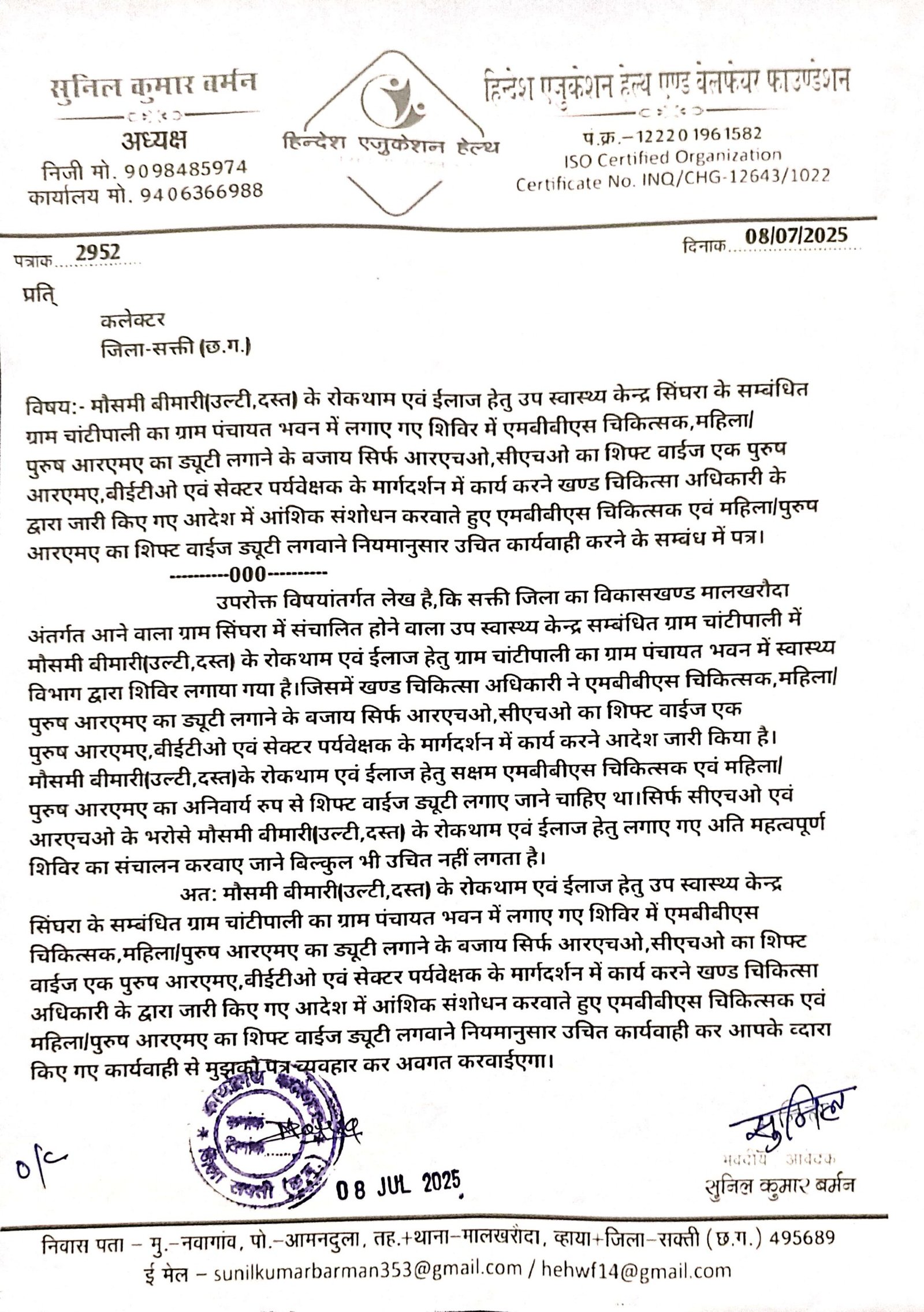 मालखरौदा(एचकेपी 24न्यूज)।मौसमी बीमारी(उल्टी,दस्त) के रोकथाम एवं ईलाज हेतु उप स्वास्थ्य केन्द्र सिंघरा के सम्बंधित ग्राम चांटीपाली का ग्राम पंचायत भवन में लगाए गए शिविर में एमबीबीएस चिकित्सक,महिला/पुरुष आरएमए का ड्यूटी लगाने के बजाय सिर्फ आरएचओ,सीएचओ का शिफ्ट वाईज एक पुरुष आरएमए,बीईटीओ एवं सेक्टर पर्यवेक्षक के मार्गदर्शन में कार्य करने खण्ड चिकित्सा अधिकारी के द्वारा जारी किए गए आदेश में आंशिक संशोधन करवाते हुए एमबीबीएस चिकित्सक एवं महिला/पुरुष आरएमए का शिफ्ट वाईज ड्यूटी लगवाने नियमानुसार उचित कार्यवाही करने हिन्देश एजुकेशन हेल्थ एण्ड वेलफेयर फाउण्डेशन (रजिस्टर्ड) के अध्यक्ष सुनिल कुमार बर्मन ने कलेक्टर को पत्र लिखा है।
