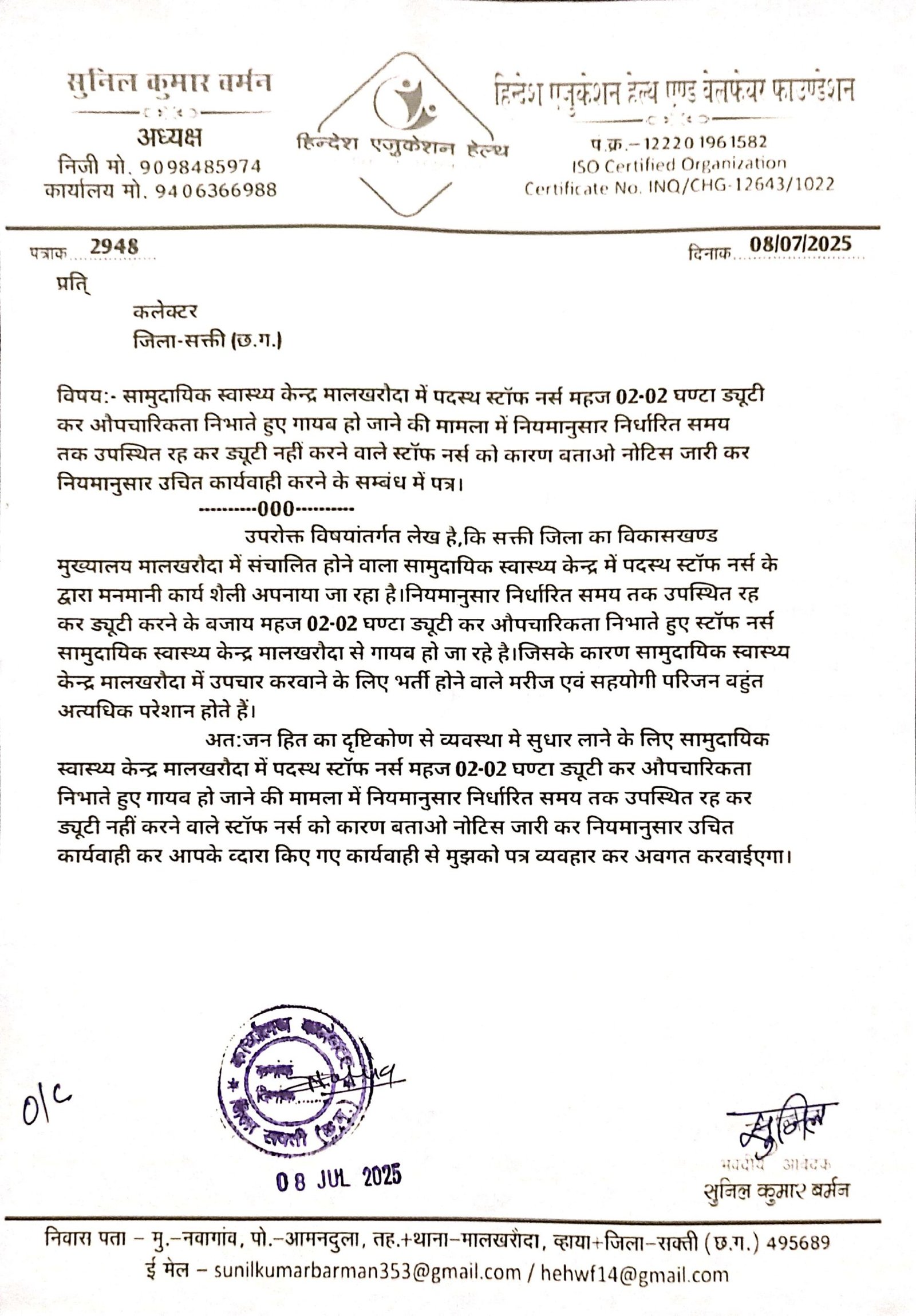 मालखरौदा(एचकेपी 24 न्यूज)।सामुदायिक स्वास्थ्य केन्द्र मालखरौदा में पदस्थ स्टॉफ नर्स नियमानुसार 08-08 घण्टा ड्यूटी करने के बजाय महज 02-02 घण्टा ड्यूटी कर औपचारिकता निभाते हुए अपने-अपने आवास की ओर रुख कर अपने-अपने नीजि कार्यो को करने में व्यस्त हो रहे हैं।स्वास्थ्य विभाग से जुड़ी मामला का संज्ञान में आने पर हिन्देश एजुकेशन हेल्थ एण्ड वेलफेयर फाउण्डेशन(रजिस्टर्ड) के अध्यक्ष सुनिल कुमार बर्मन ने नियमानुसार निर्धारित समय 08-08 घण्टा तक उपस्थित रह कर ड्यूटी नहीं करने वाले स्टॉफ नर्सो को कारण बताओ नोटिस जारी कर 08-08 घण्टा ड्यूटी करने सुनिश्चित करवाने नियमानुसार उचित कार्यवाही करने कलेक्टर को पत्र लिखा है।
