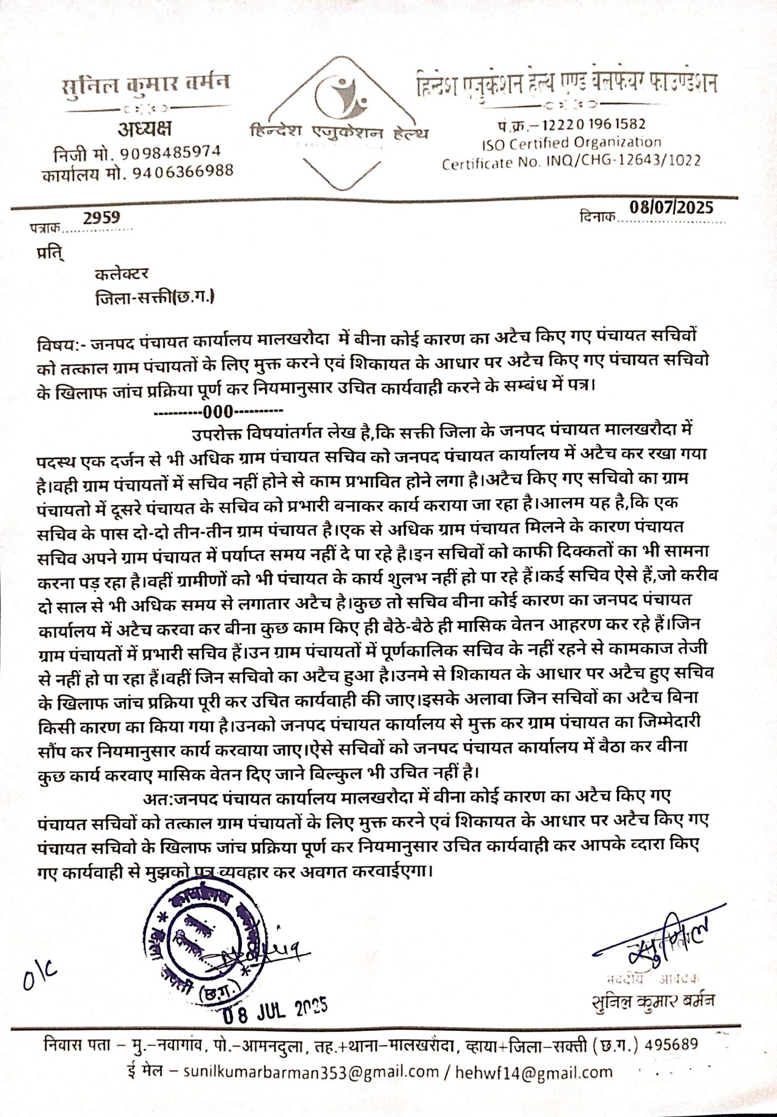 मालखरौदा(एचकेपी 24 न्यूज)।जनपद पंचायत कार्यालय मालखरौदा में बीना कोई कारण का अटैच किए गए पंचायत सचिवों को तत्काल ग्राम पंचायतों के लिए मुक्त करने एवं शिकायत के आधार पर अटैच किए गए पंचायत सचिवो के खिलाफ जांच प्रक्रिया पूर्ण कर नियमानुसार उचित कार्यवाही करने हिन्देश एजुकेशन हेल्थ एण्ड वेलफेयर फाउण्डेशन (रजिस्टर्ड) के अध्यक्ष सुनिल कुमार बर्मन ने कलेक्टर को पत्र लिखा है।