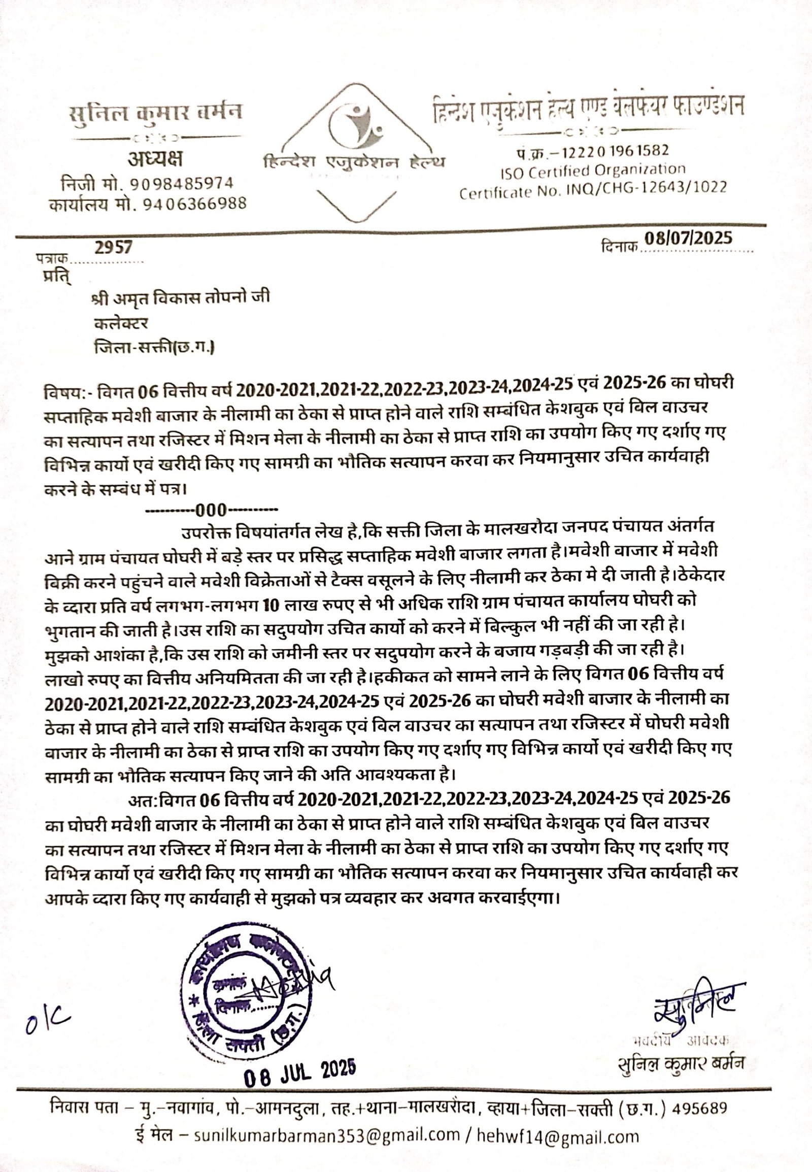 मालखरौदा(एचकेपी 24 न्यूज)।घोघरी के सप्ताहिक प्रसिद्ध मवेशी बाजार के नीलामी का ठेका से सालाना प्राप्त होने वाला लाखो रुपए का बीना जमीनी स्तर पर कार्य किए गडबडी किए जाने की जन शिकायत प्राप्त होने पर हिन्देश एजुकेशन हेल्थ एण्ड वेलफेयर फाउण्डेशन(रजिस्टर्ड) के अध्यक्ष सुनिल कुमार बर्मन ने विगत 06 वित्तीय वर्ष 2020-2021,2021-22,2022-23,2023-24,2024-25 एवं 2025-26 का घोघरी सप्ताहिक मवेशी बाजार के नीलामी का ठेका से प्राप्त होने वाले राशि सम्बंधित केशबुक एवं बिल वाउचर का सत्यापन तथा रजिस्टर में घोघरी मवेशी बाजार के नीलामी का ठेका से प्राप्त राशि का उपयोग किए गए दर्शाए गए विभिन्न कार्यो एवं खरीदी किए गए सामग्री का भौतिक सत्यापन करवा कर नियमानुसार उचित कार्यवाही करने कलेक्टर को पत्र लिखा है।