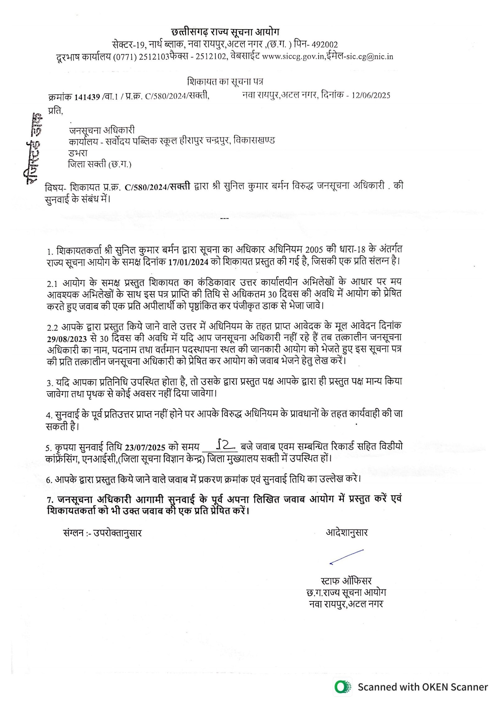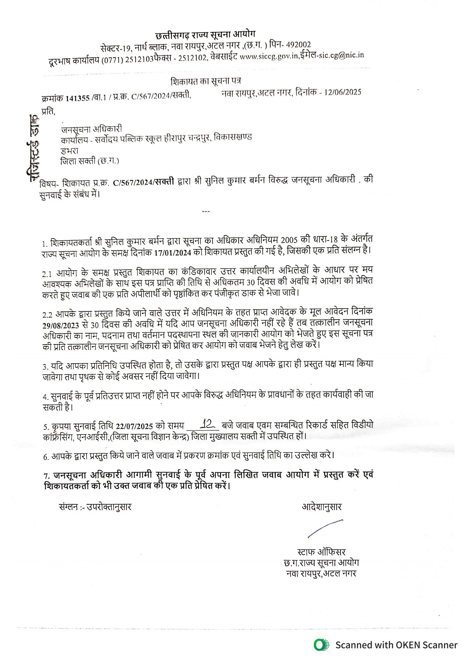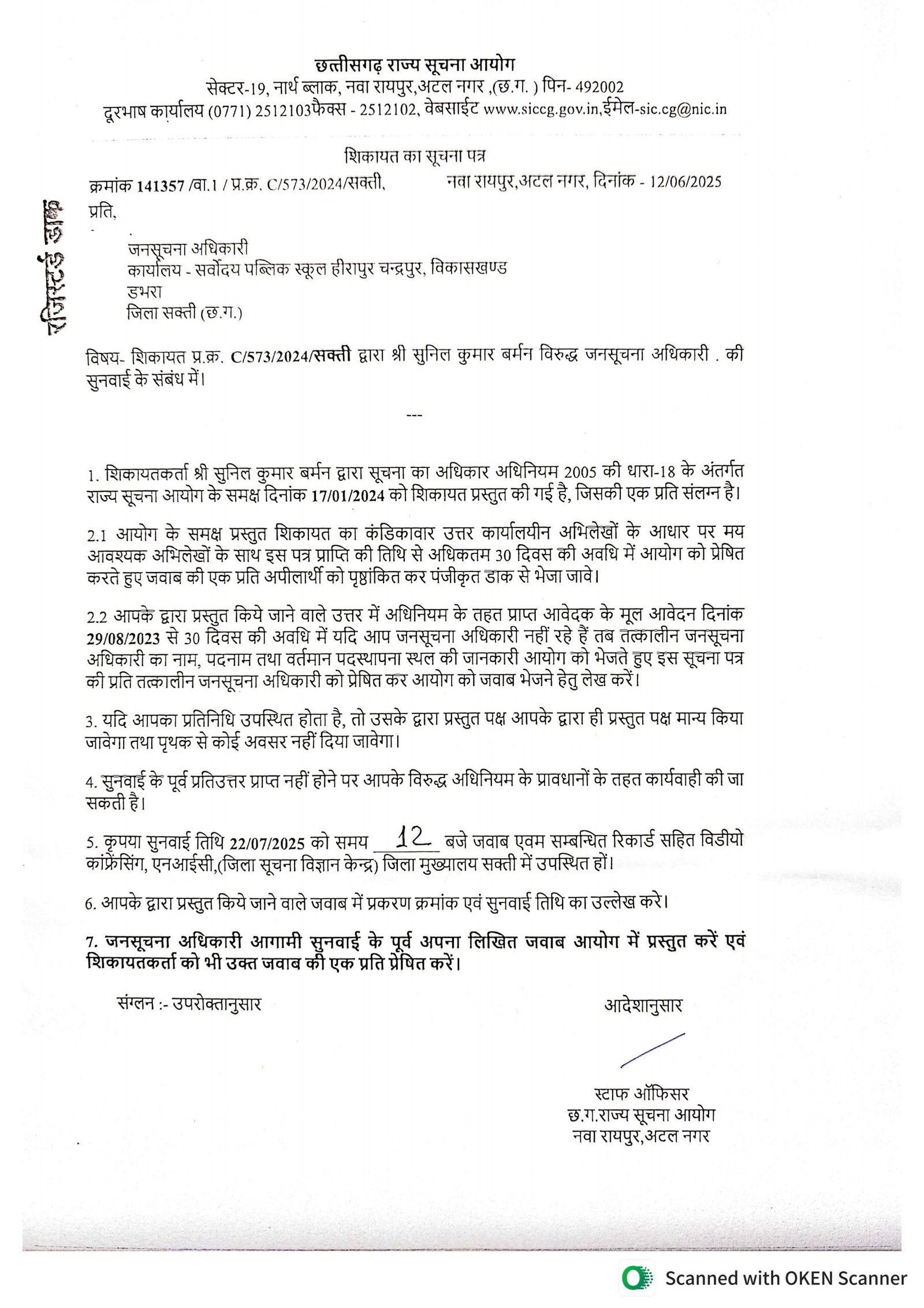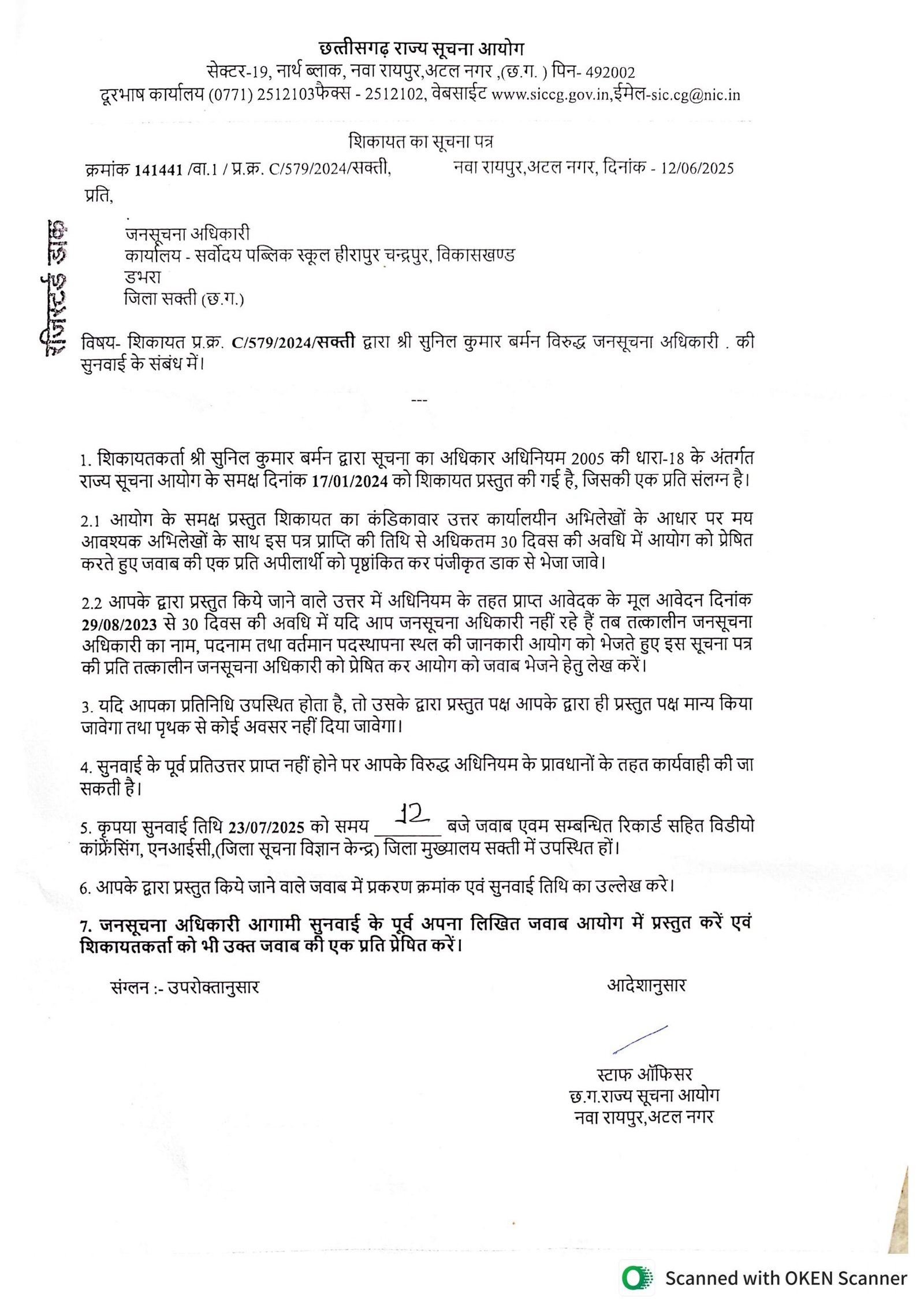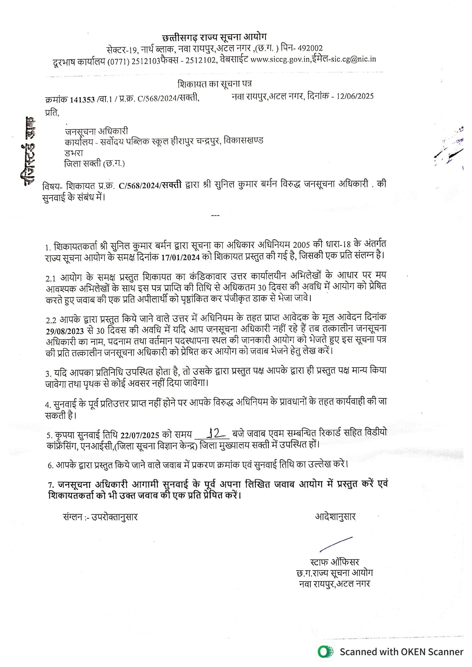 डभरा(एचकेपी 24 न्यूज)।सूचना का अधिकार 2005 के तहत् अलग-अलग विषय उल्लेखित 21 आवेदन पत्र प्रेषित कर मांगी गई सार्वजनिक करने योग्य सामान्य जानकारी को अशासकीय सर्वोदय पब्लिक स्कूल हीरापुर प्रबंधन ने स्वपित पोषित संस्था होने का हवाला देकर मांगी गई जानकारी को उपलब्ध करवाने अस्मर्थता व्यक्त करने पर आपत्ति जताते हुए हिन्देश एजुकेशन हेल्थ एण्ड वेलफेयर फाउण्डेशन(रजिस्टर्ड)के अध्यक्ष सुनिल कुमार बर्मन के द्वारा लिखित शिकायत किए जाने पर छत्तीसगढ़ राज्य सूचना आयोग ने सम्बंधित जन सूचना अधिकारी को 21 नोटिस पत्र जारी कर 23/07/2025 को जवाब एवं सम्बंधित रिकार्ड सहित विडियो कांफ्रेंसिंग एनआईसी जिला मुख्यालय सक्ती में उपस्थित होने के लिए आदेश जारी किया है।