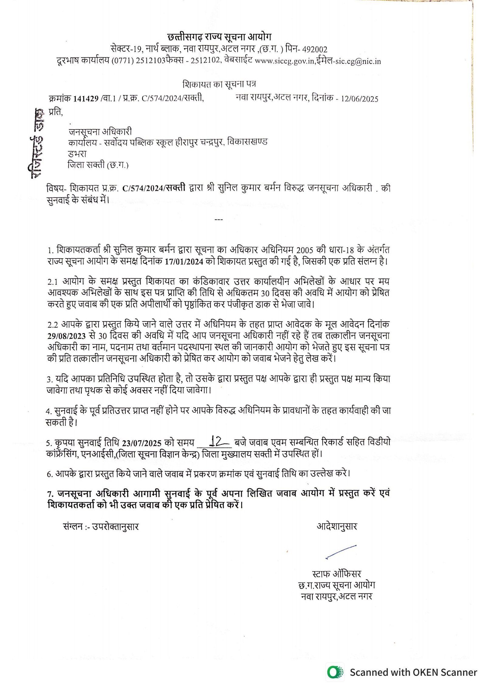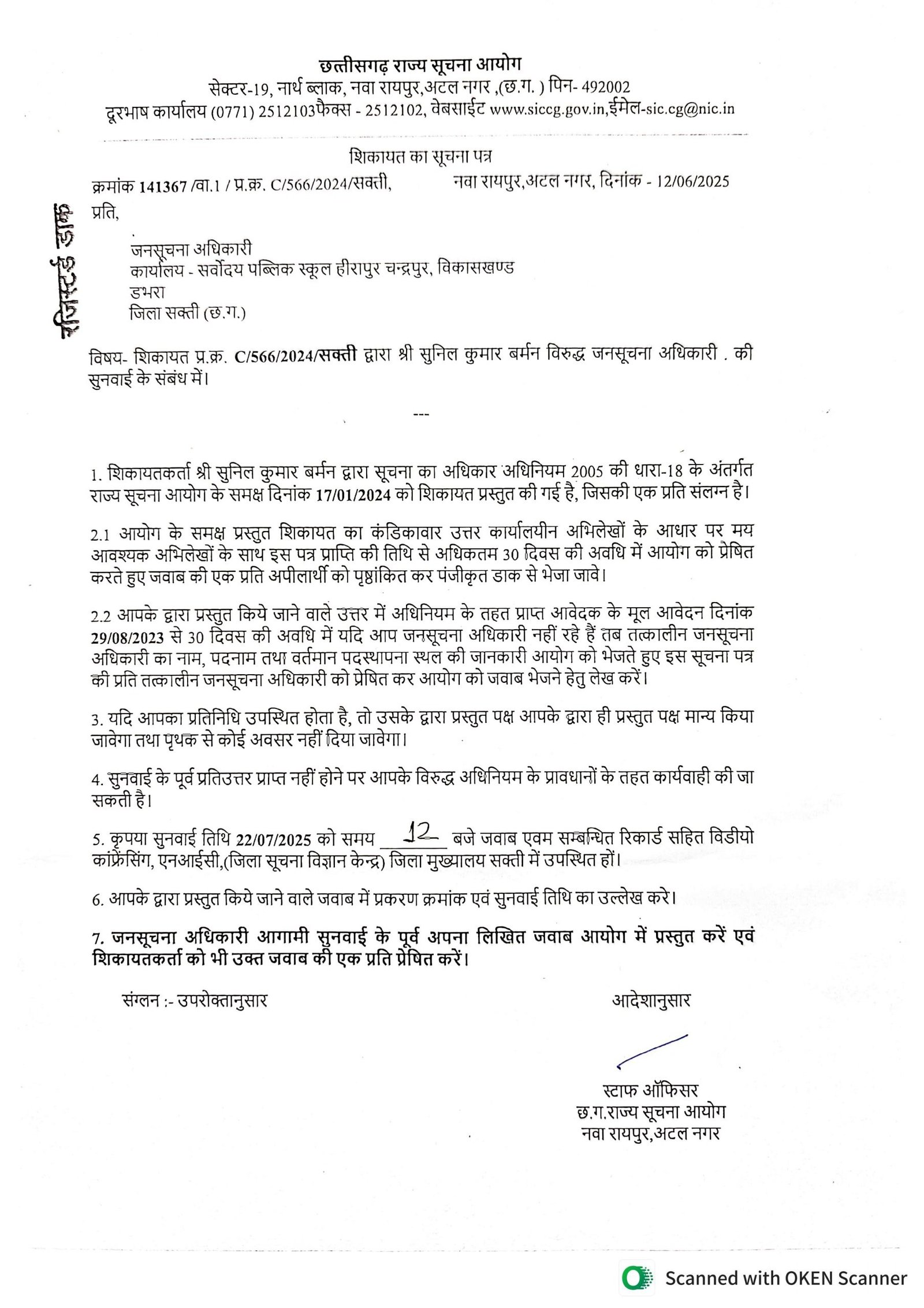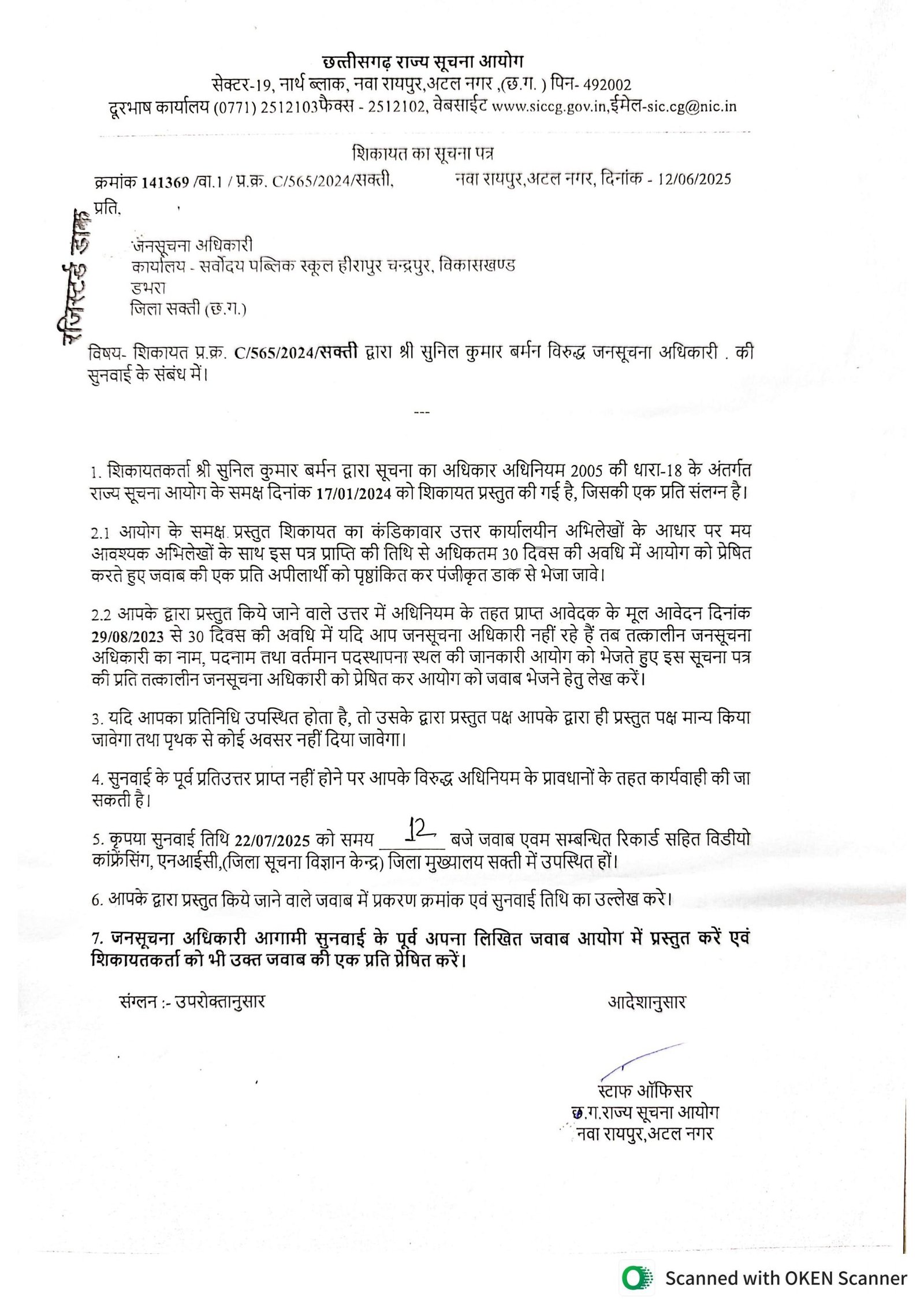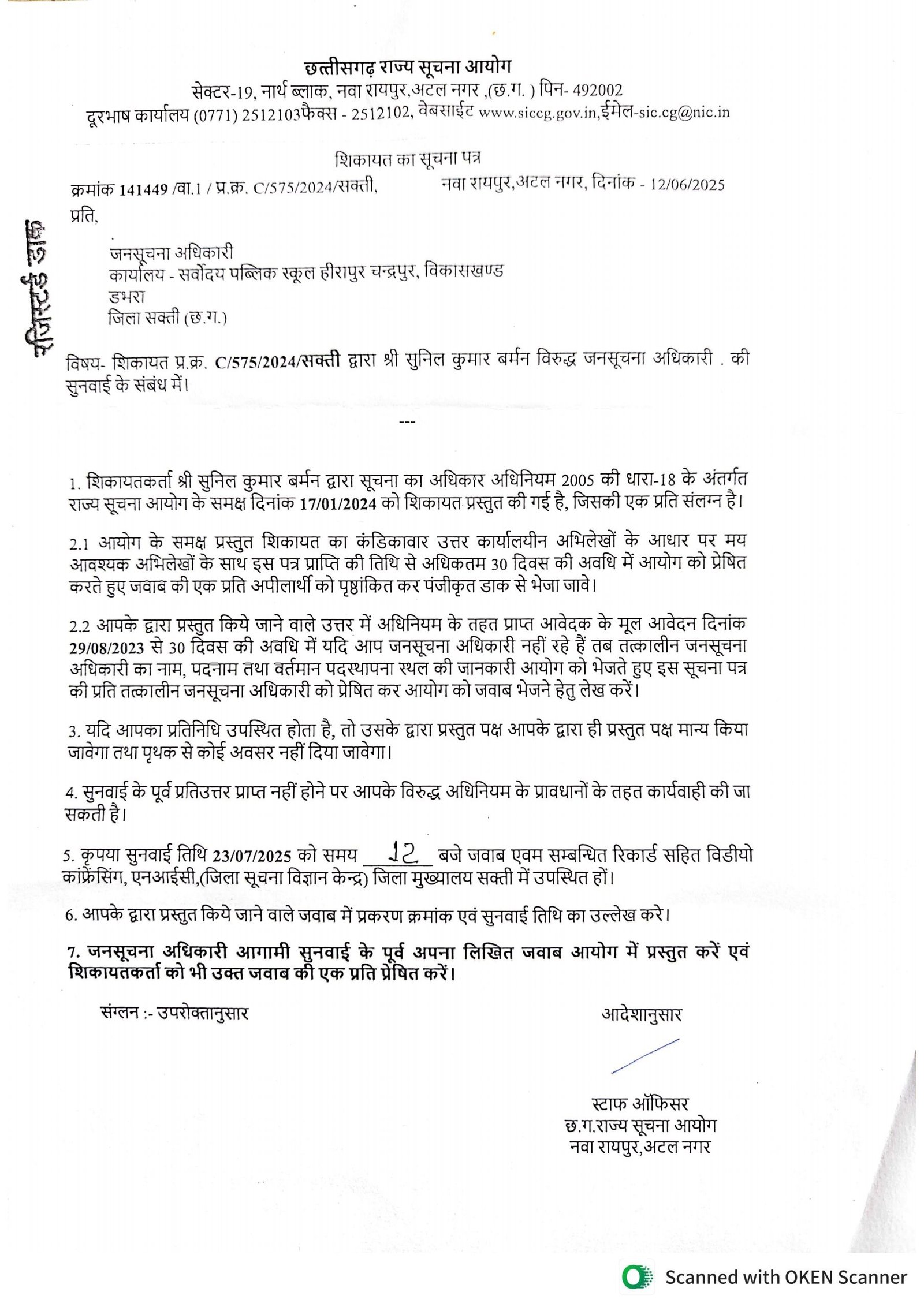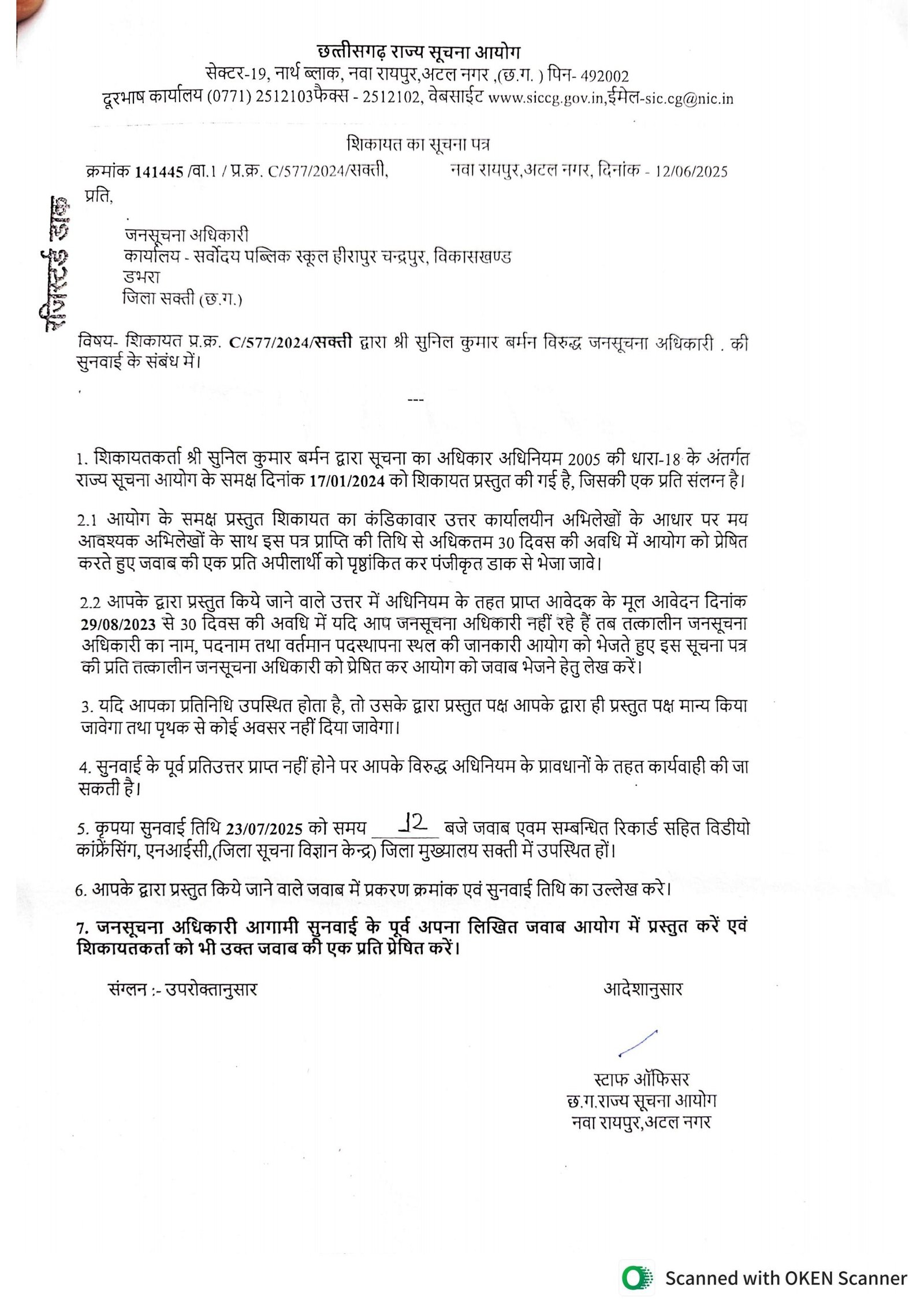 डभरा(एचकेपी 24 न्यूज)।सूचना का अधिकार 2005 के तहत् अलग-अलग विषय उल्लेखित 21 आवेदन पत्र प्रेषित कर मांगी गई सार्वजनिक करने योग्य सामान्य जानकारी को अशासकीय सर्वोदय पब्लिक स्कूल हीरापुर प्रबंधन ने स्वपित पोषित संस्था होने का हवाला देकर मांगी गई जानकारी को उपलब्ध करवाने अस्मर्थता व्यक्त करने पर आपत्ति जताते हुए हिन्देश एजुकेशन हेल्थ एण्ड वेलफेयर फाउण्डेशन(रजिस्टर्ड)के अध्यक्ष सुनिल कुमार बर्मन के द्वारा लिखित शिकायत किए जाने पर छत्तीसगढ़ राज्य सूचना आयोग ने सम्बंधित जन सूचना अधिकारी को 21 नोटिस पत्र जारी कर 23/07/2025 को जवाब एवं सम्बंधित रिकार्ड सहित विडियो कांफ्रेंसिंग एनआईसी जिला मुख्यालय सक्ती में उपस्थित होने के लिए आदेश जारी किया है।
