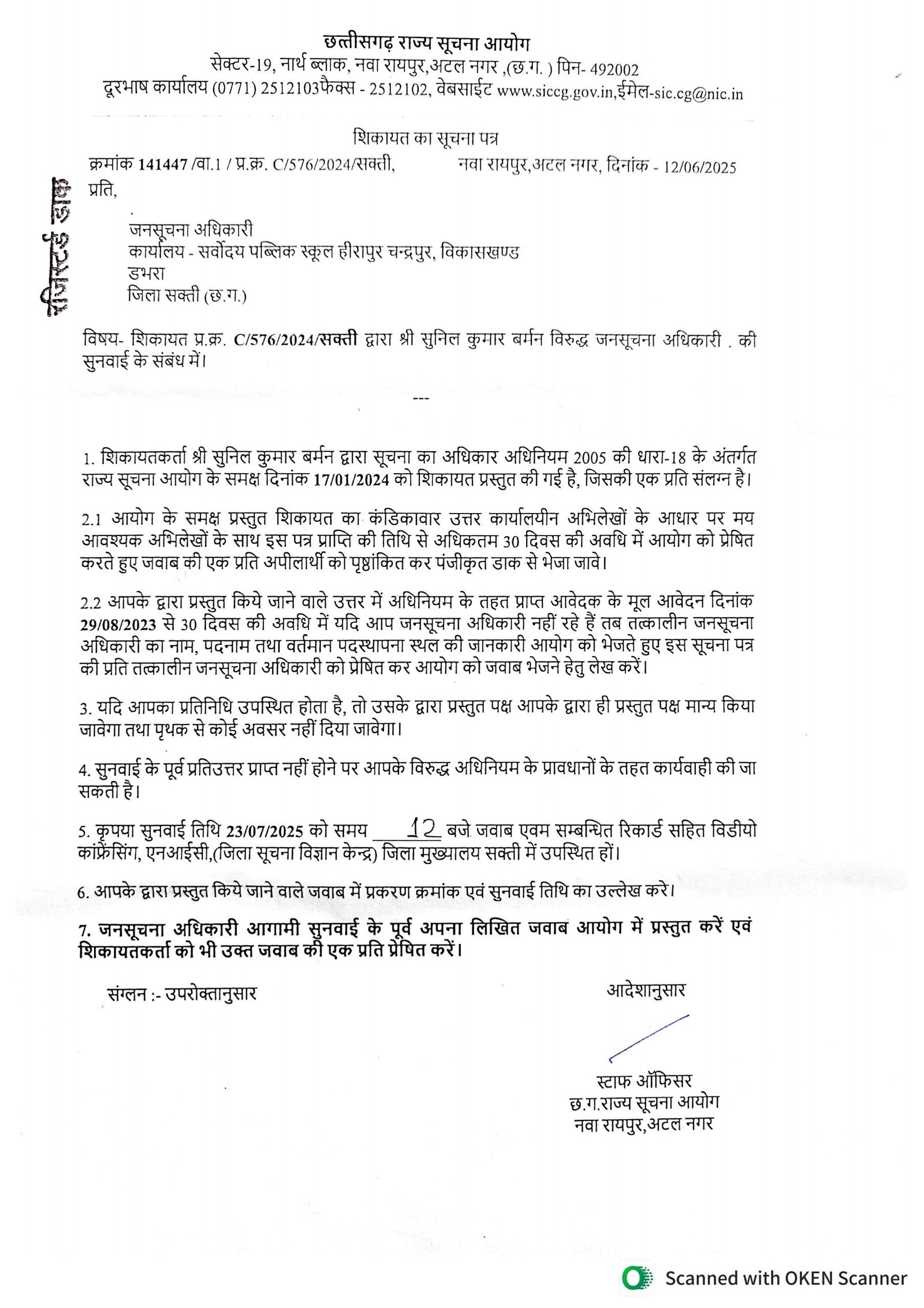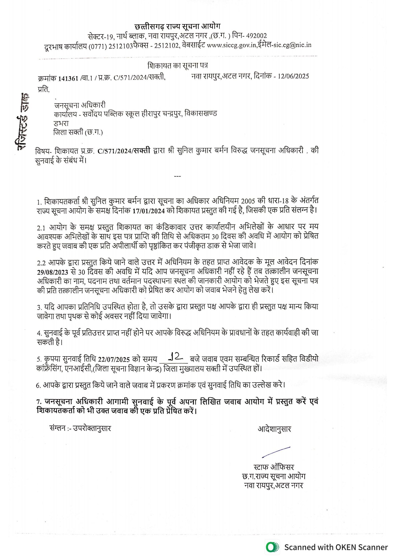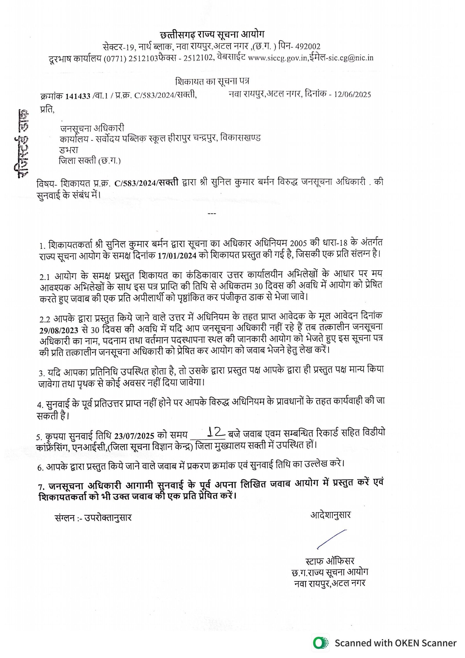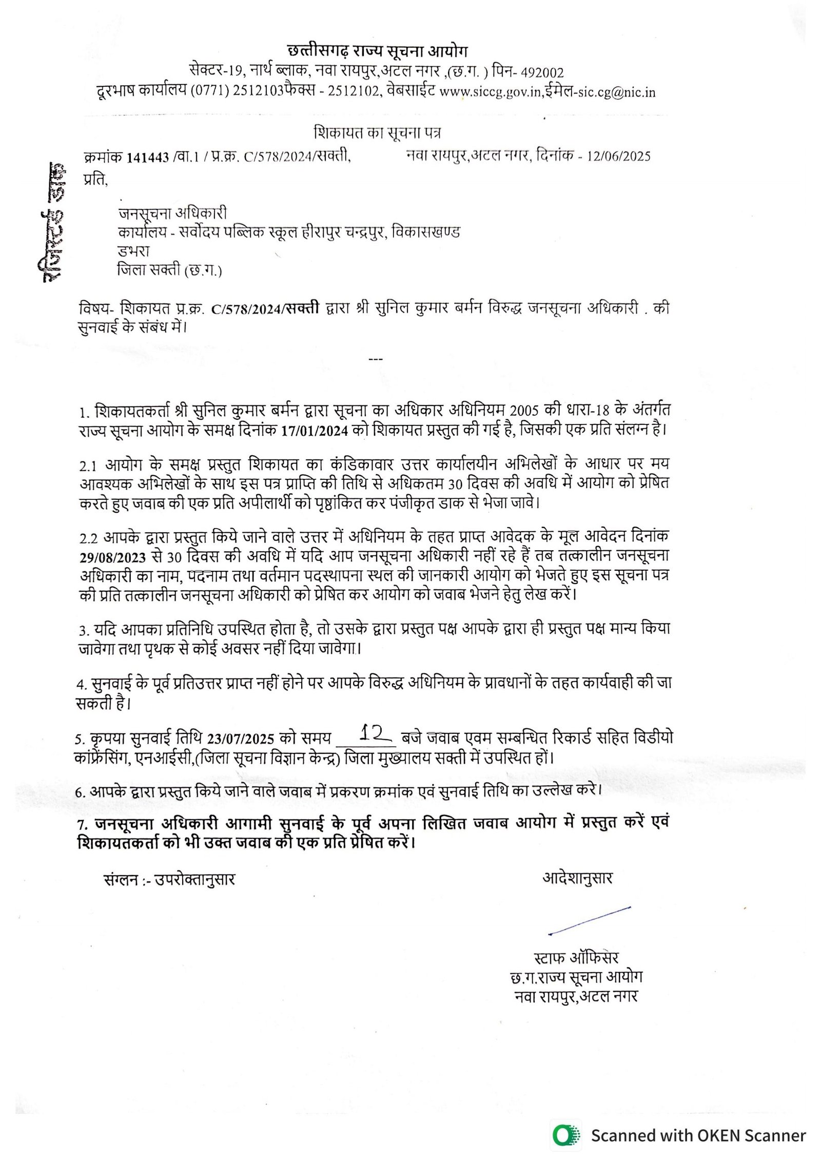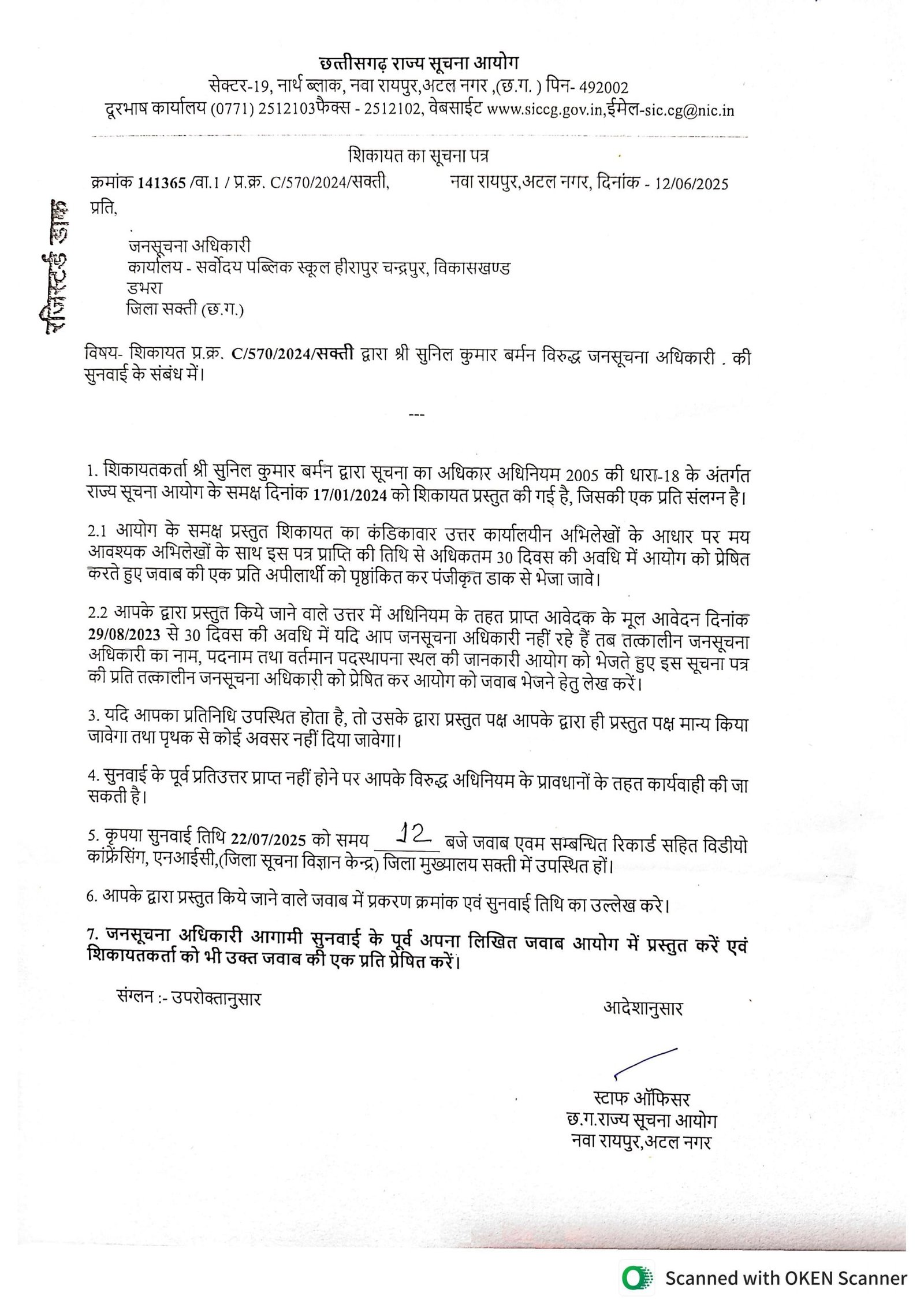 डभरा(एचकेपी 24 न्यूज)।सूचना का अधिकार 2005 के तहत् अलग-अलग विषय उल्लेखित 21 आवेदन पत्र प्रेषित कर मांगी गई सार्वजनिक करने योग्य सामान्य जानकारी को अशासकीय सर्वोदय पब्लिक स्कूल हीरापुर प्रबंधन ने स्वपित पोषित संस्था होने का हवाला देकर मांगी गई जानकारी को उपलब्ध करवाने अस्मर्थता व्यक्त करने पर आपत्ति जताते हुए हिन्देश एजुकेशन हेल्थ एण्ड वेलफेयर फाउण्डेशन(रजिस्टर्ड)के अध्यक्ष सुनिल कुमार बर्मन के द्वारा लिखित शिकायत किए जाने पर छत्तीसगढ़ राज्य सूचना आयोग ने सम्बंधित जन सूचना अधिकारी को 21 नोटिस पत्र जारी कर 23/07/2025 को जवाब एवं सम्बंधित रिकार्ड सहित विडियो कांफ्रेंसिंग एनआईसी जिला मुख्यालय सक्ती में उपस्थित होने के लिए आदेश जारी किया है।