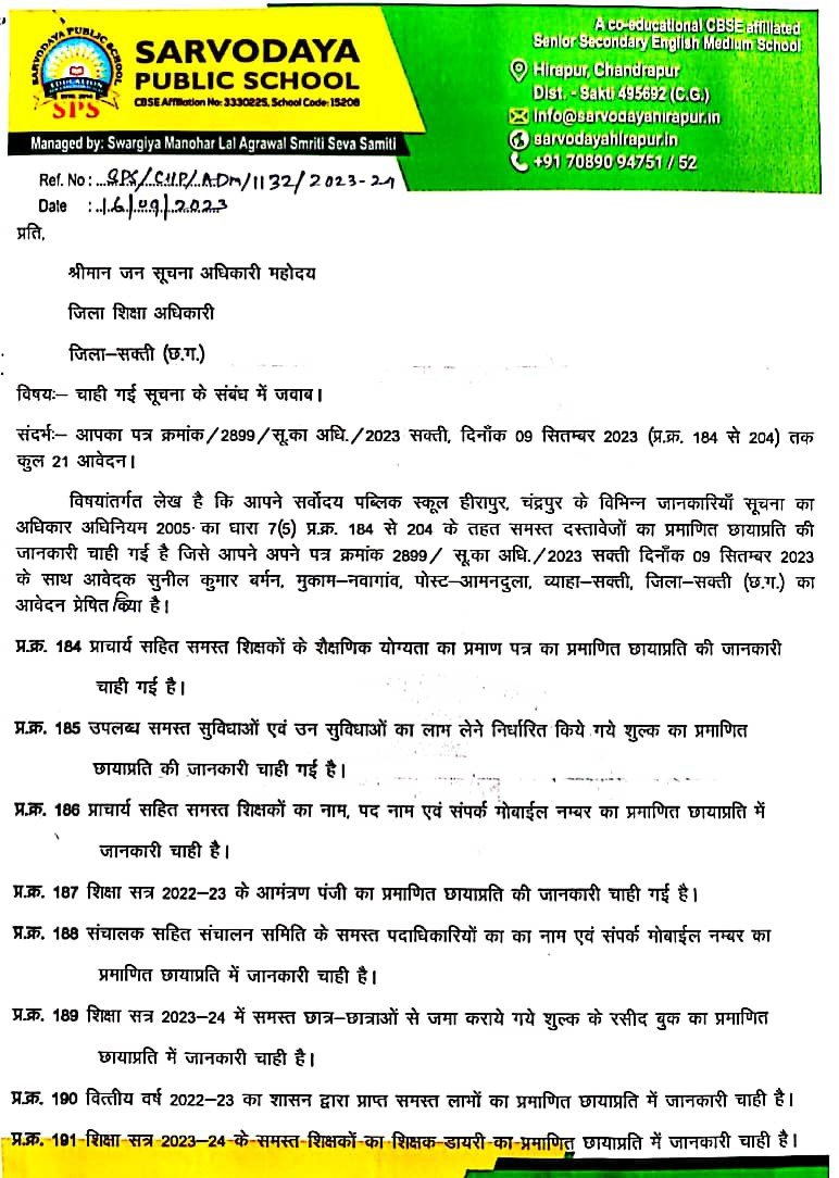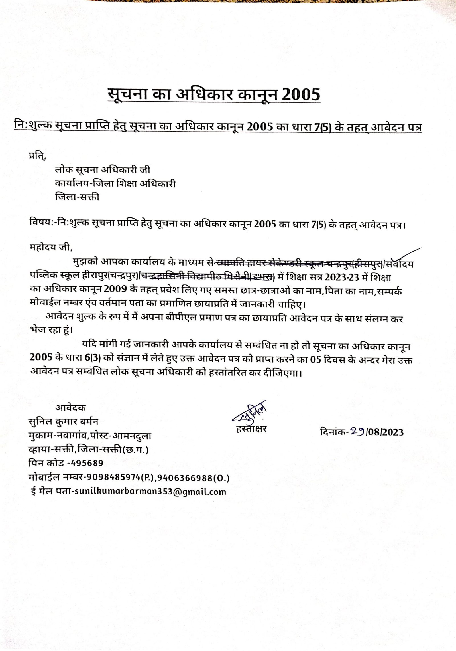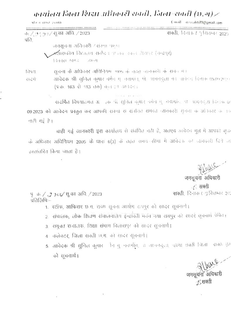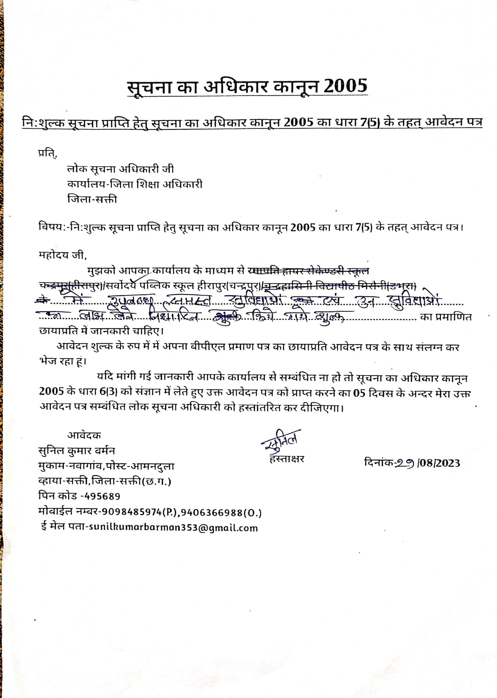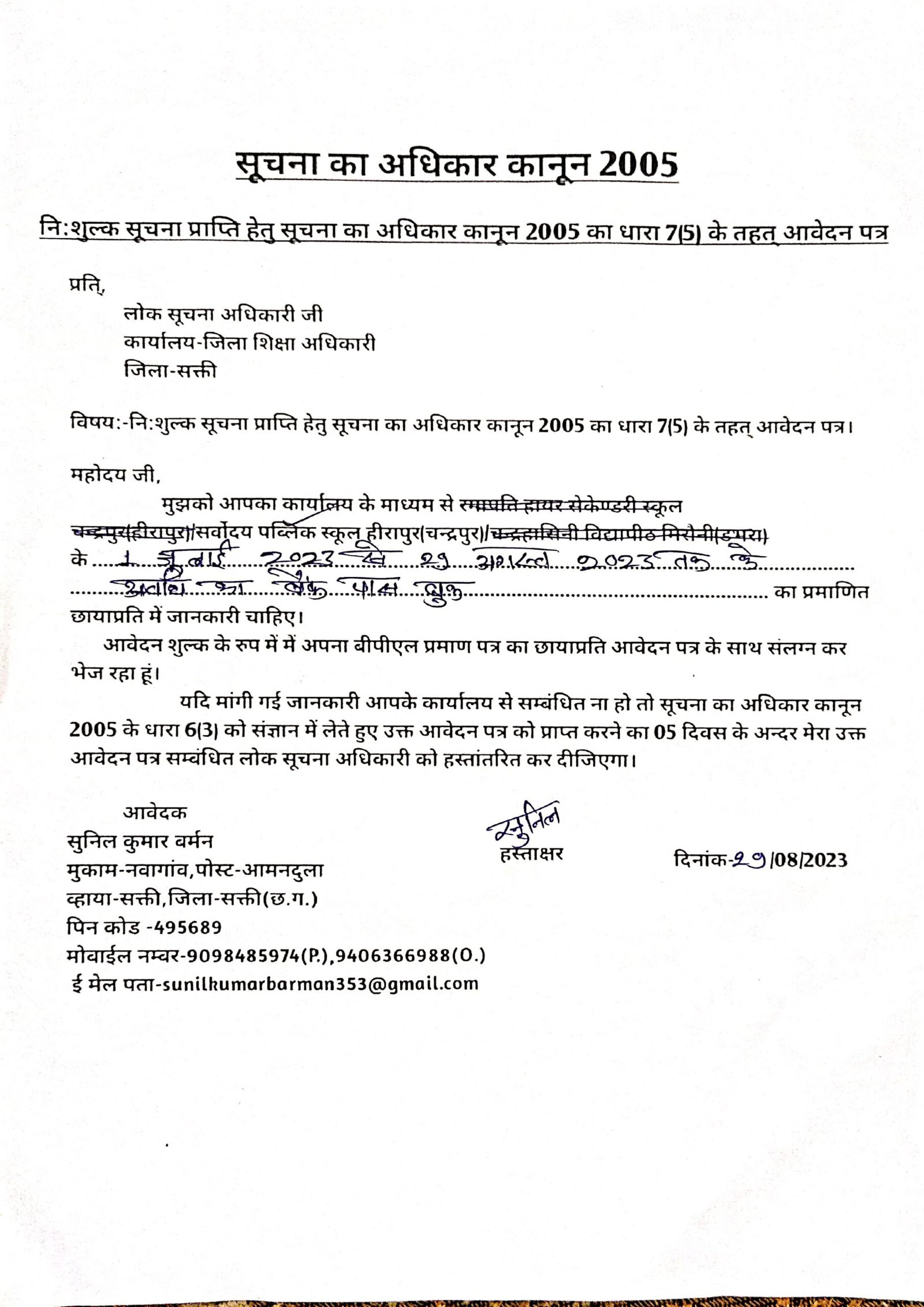 डभरा(एचकेपी 24 न्यूज)।सूचना का अधिकार 2005 के तहत् अलग-अलग विषय उल्लेखित 21 आवेदन पत्र प्रेषित कर मांगी गई सार्वजनिक करने योग्य सामान्य जानकारी को अशासकीय सर्वोदय पब्लिक स्कूल हीरापुर प्रबंधन ने स्वपित पोषित संस्था होने का हवाला देकर मांगी गई जानकारी को उपलब्ध करवाने अस्मर्थता व्यक्त करने पर आपत्ति जताते हुए हिन्देश एजुकेशन हेल्थ एण्ड वेलफेयर फाउण्डेशन(रजिस्टर्ड)के अध्यक्ष सुनिल कुमार बर्मन के द्वारा लिखित शिकायत किए जाने पर छत्तीसगढ़ राज्य सूचना आयोग ने सम्बंधित जन सूचना अधिकारी को 21 नोटिस पत्र जारी कर 23/07/2025 को जवाब एवं सम्बंधित रिकार्ड सहित विडियो कांफ्रेंसिंग एनआईसी जिला मुख्यालय सक्ती में उपस्थित होने के लिए आदेश जारी किया है।