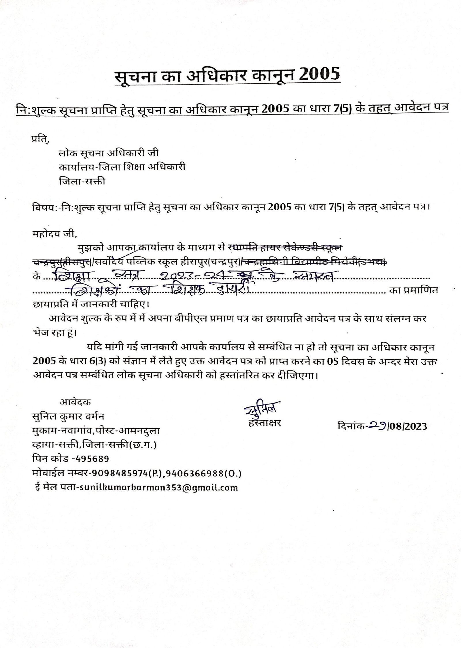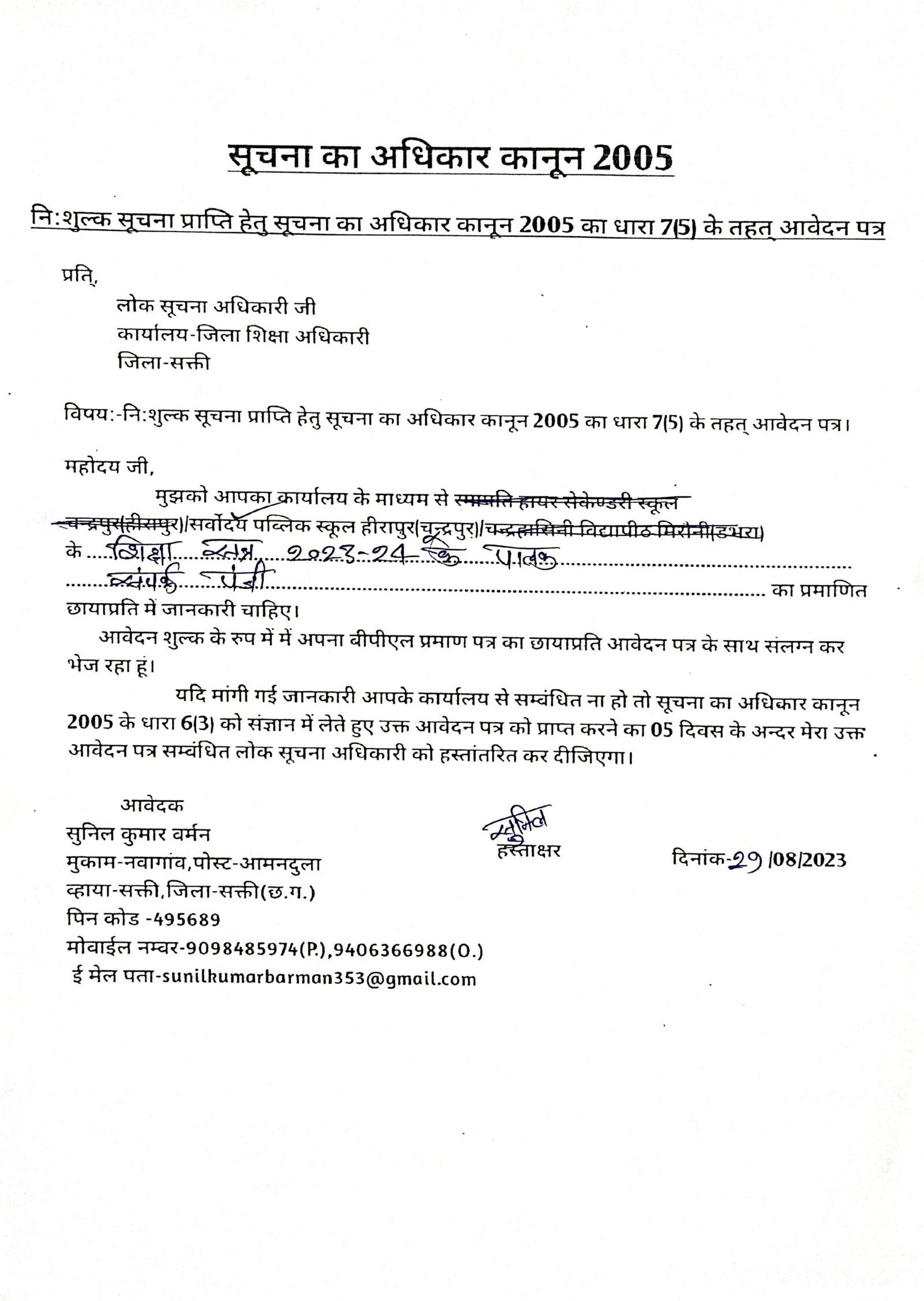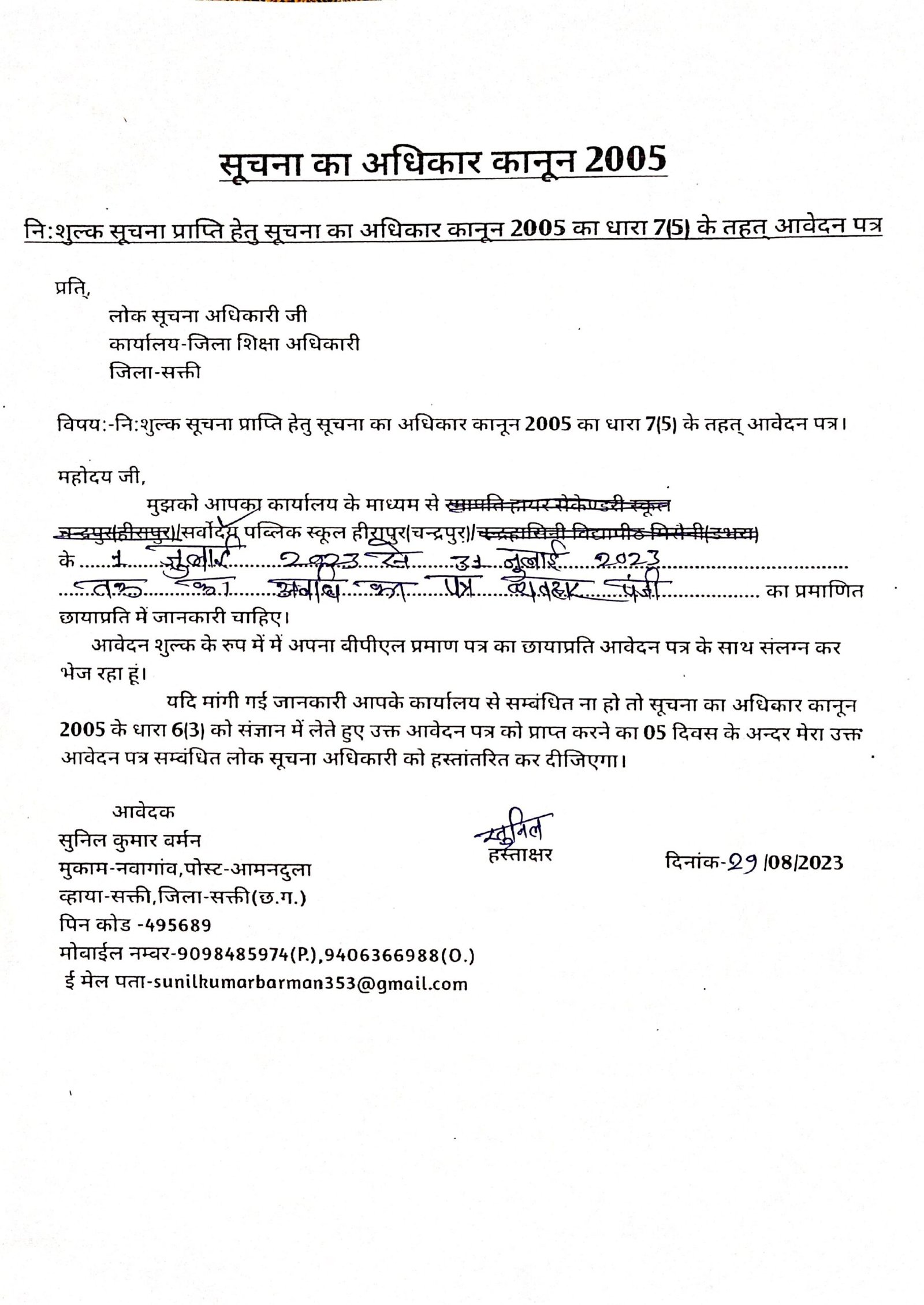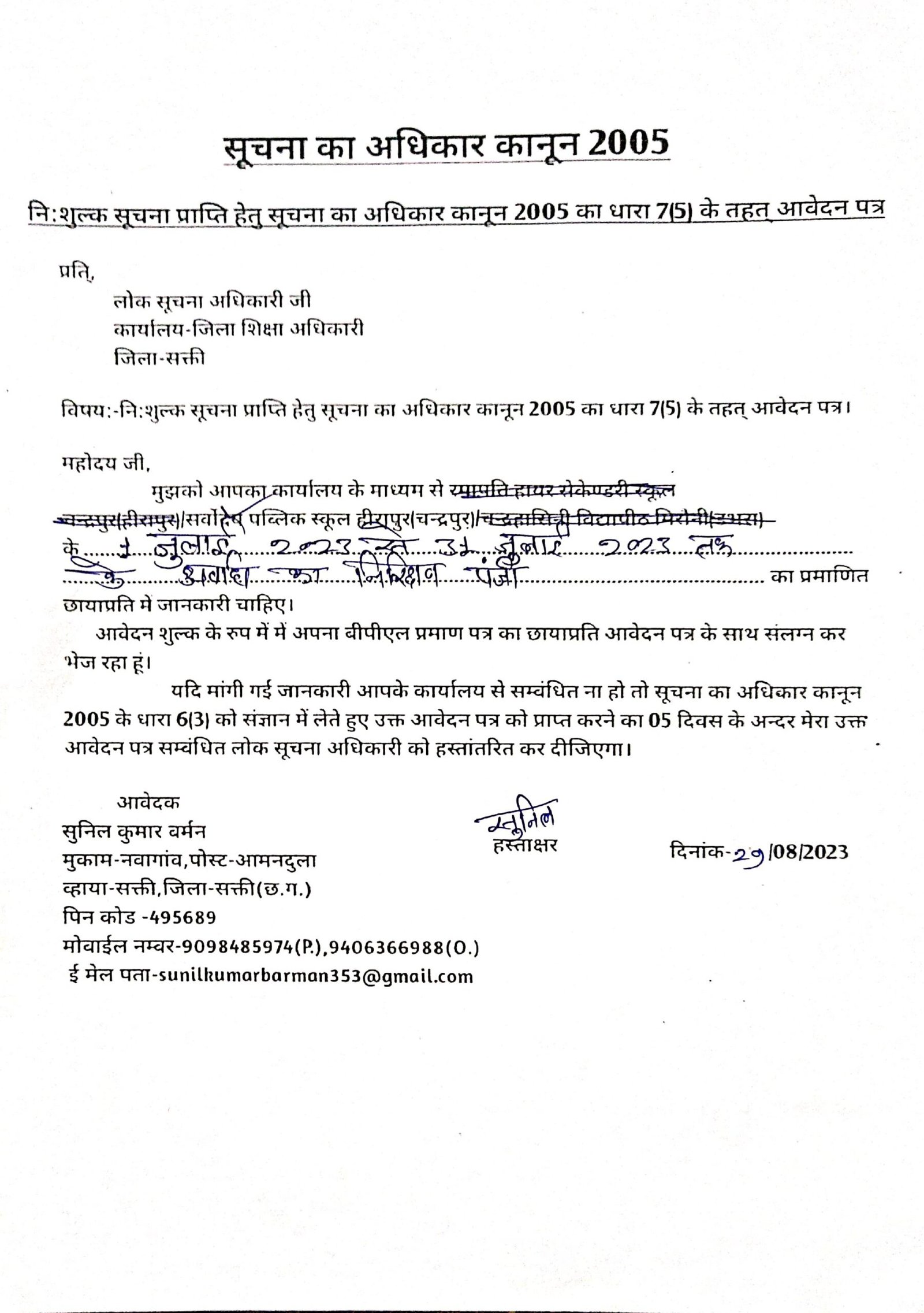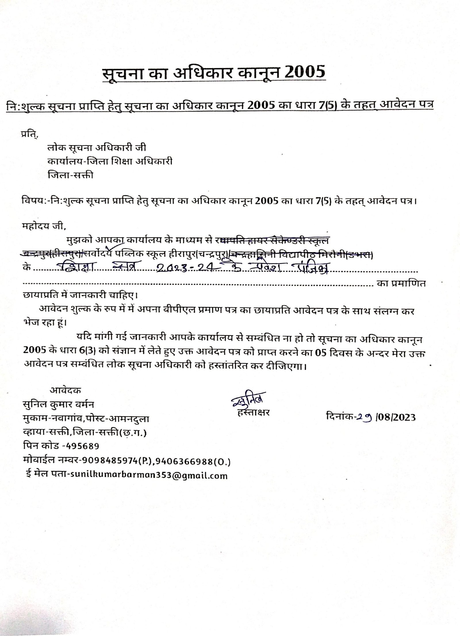 डभरा(एचकेपी 24 न्यूज)।सूचना का अधिकार 2005 के तहत् अलग-अलग विषय उल्लेखित 21 आवेदन पत्र प्रेषित कर मांगी गई सार्वजनिक करने योग्य सामान्य जानकारी को अशासकीय सर्वोदय पब्लिक स्कूल हीरापुर प्रबंधन ने स्वपित पोषित संस्था होने का हवाला देकर मांगी गई जानकारी को उपलब्ध करवाने अस्मर्थता व्यक्त करने पर आपत्ति जताते हुए हिन्देश एजुकेशन हेल्थ एण्ड वेलफेयर फाउण्डेशन(रजिस्टर्ड)के अध्यक्ष सुनिल कुमार बर्मन के द्वारा लिखित शिकायत किए जाने पर छत्तीसगढ़ राज्य सूचना आयोग ने सम्बंधित जन सूचना अधिकारी को 21 नोटिस पत्र जारी कर 23/07/2025 को जवाब एवं सम्बंधित रिकार्ड सहित विडियो कांफ्रेंसिंग एनआईसी जिला मुख्यालय सक्ती में उपस्थित होने के लिए आदेश जारी किया है।