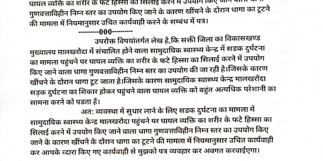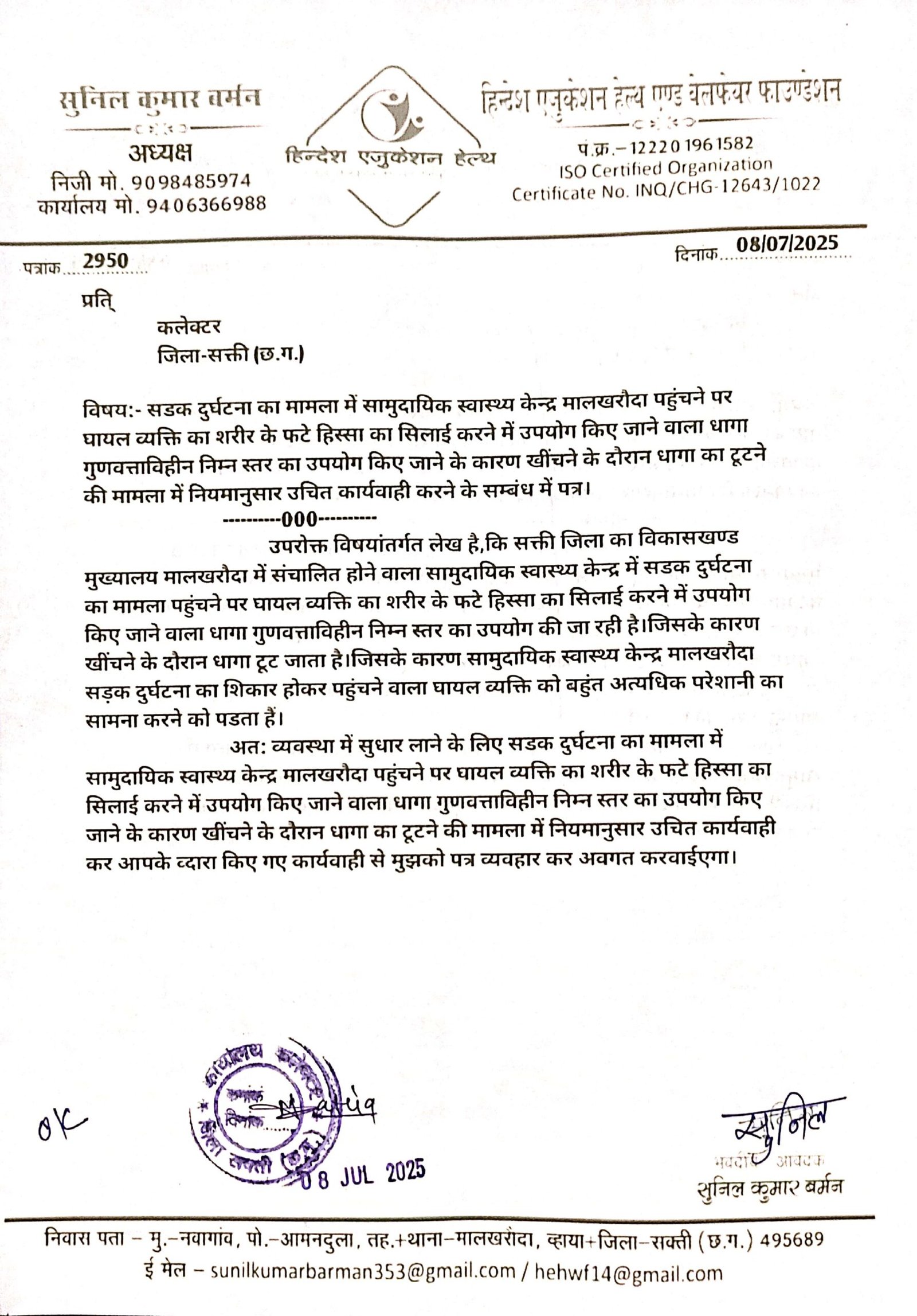 मालखरौदा(एचकेपी 24 न्यूज)।सडक दुर्घटना का मामला में सामुदायिक स्वास्थ्य केन्द्र मालखरौदा पहुंचने पर घायल व्यक्ति का शरीर के फटे हिस्सा का सिलाई करने में उपयोग किए जाने वाला धागा गुणवत्ताविहीन निम्न स्तर का उपयोग किए जाने के कारण खींचने के दौरान धागा का टूटने की मामला का संज्ञान मे आने पर हिन्देश एजुकेशन हेल्थ एण्ड वेलफेयर फाउण्डेशन (रजिस्टर्ड) के अध्यक्ष सुनिल कुमार बर्मन ने जन स्वास्थ्य सुरक्षा के जुड़े संवेदनशील मामला को लेकर नियमानुसार उचित कार्यवाही करने कलेक्टर को पत्र लिखा है।