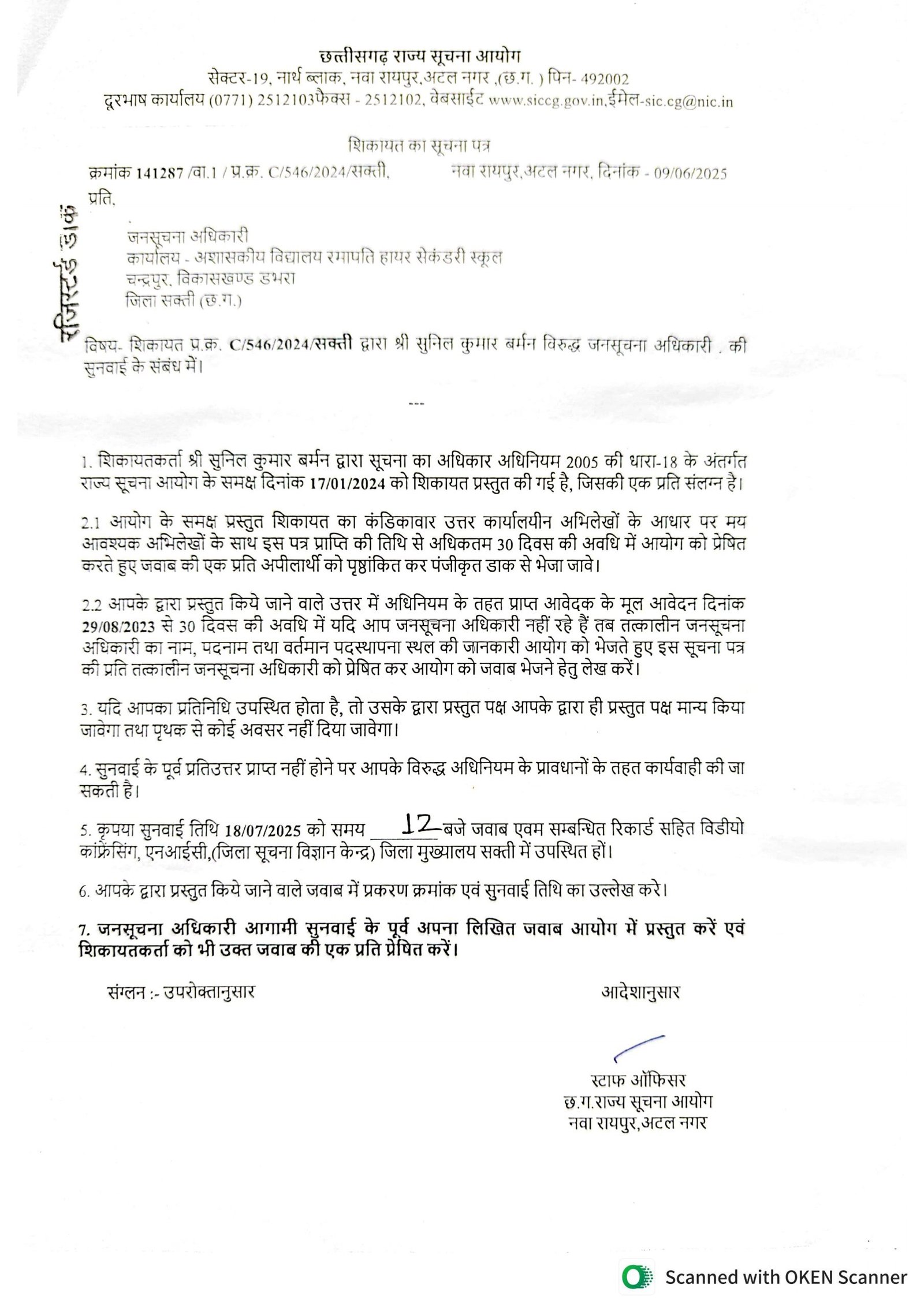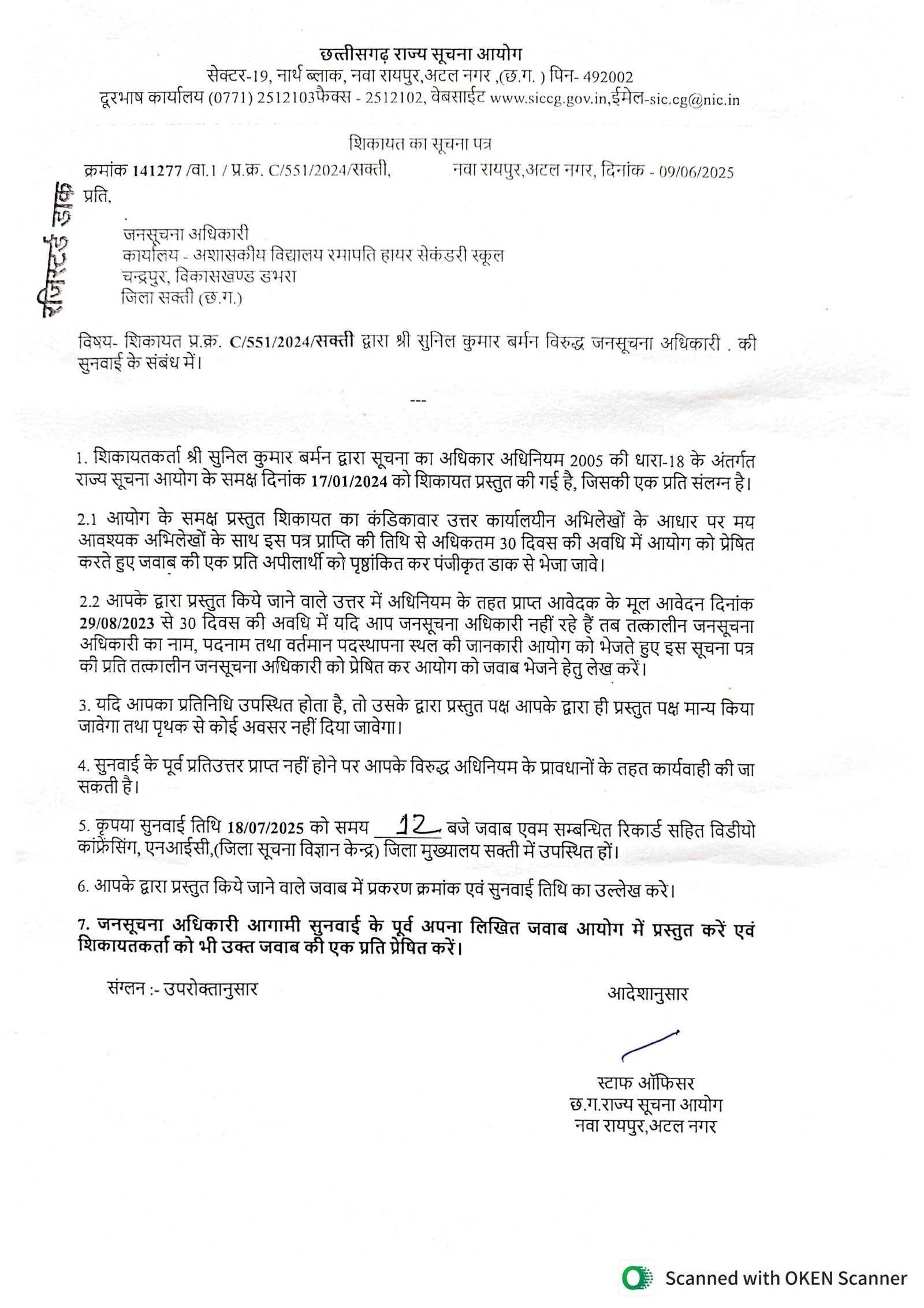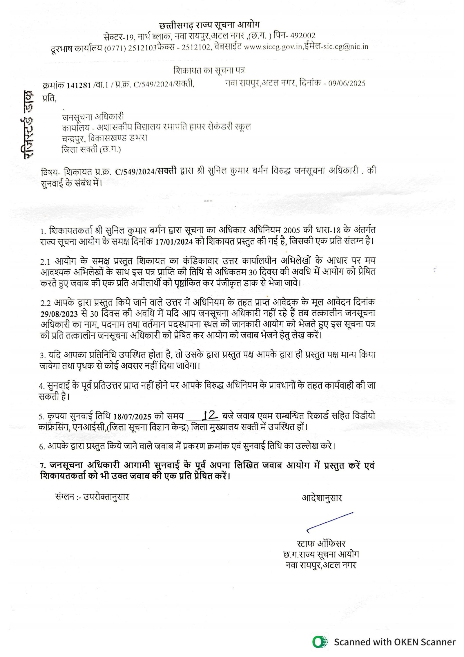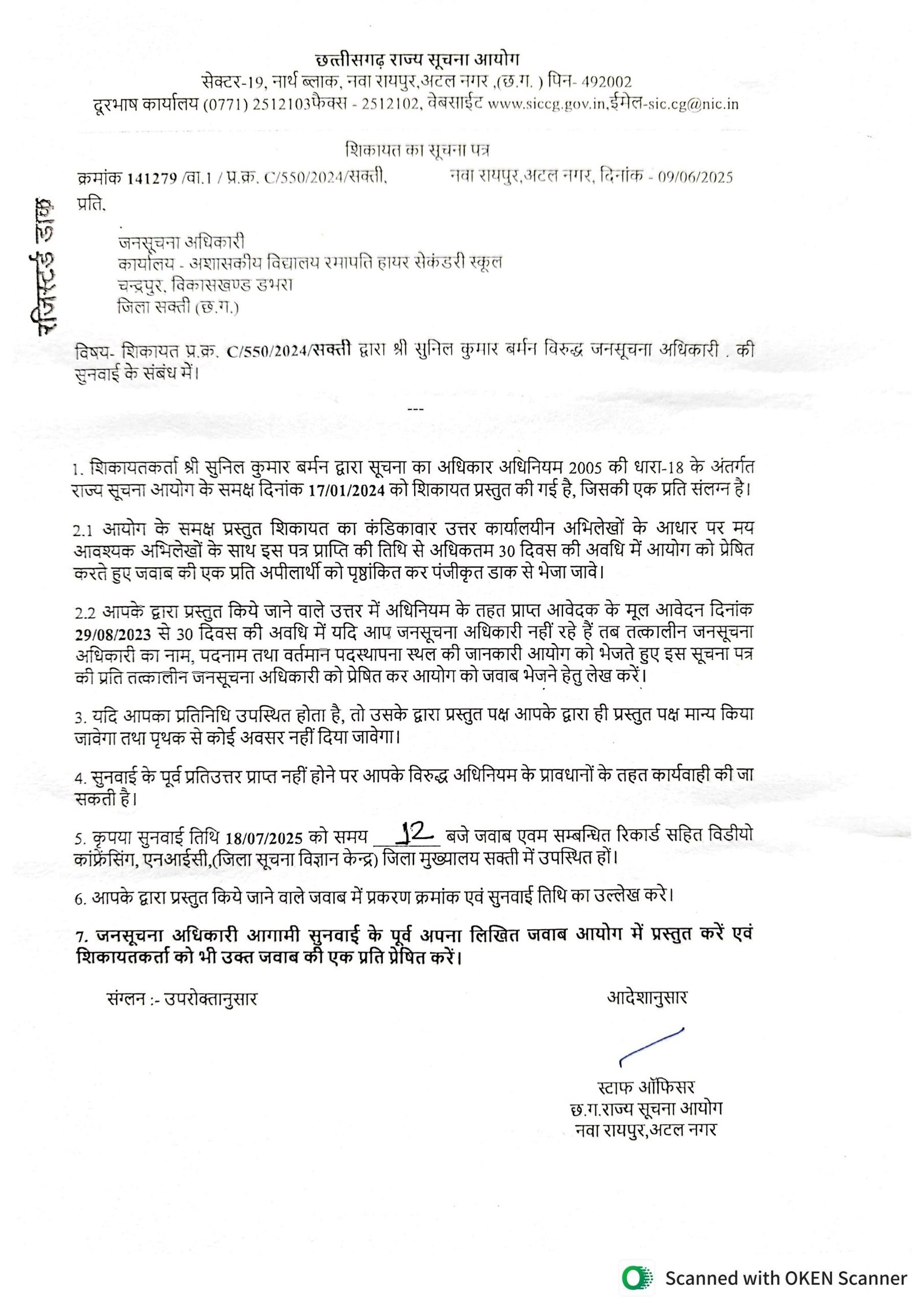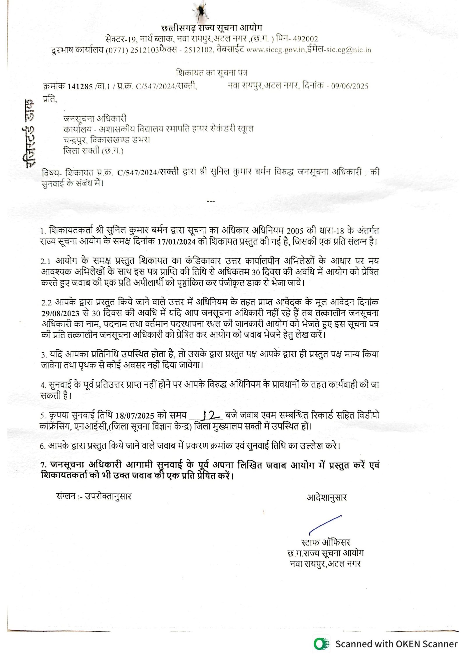 डभरा(एचकेपी 24 न्यूज)।सूचना का अधिकार 2005 के तहत् अलग-अलग विषय उल्लेखित 21 आवेदन पत्र प्रेषित कर मांगी गई सार्वजनिक करने योग्य सामान्य जानकारी को अशासकीय रमापति उच्चतर माध्यमिक विद्यालय चन्द्रपुर प्रबंधन ने स्वपित पोषित संस्था होने का हवाला देकर मांगी गई जानकारी को उपलब्ध करवाने अस्मर्थता व्यक्त करने पर आपत्ति जताते हुए हिन्देश एजुकेशन हेल्थ एण्ड वेलफेयर फाउण्डेशन(रजिस्टर्ड)के अध्यक्ष सुनिल कुमार बर्मन के द्वारा लिखित शिकायत किए जाने पर छत्तीसगढ़ राज्य सूचना आयोग ने सम्बंधित जन सूचना अधिकारी को 21 नोटिस पत्र जारी कर 18/07/2025 को जवाब एवं सम्बंधित रिकार्ड सहित विडियो कांफ्रेंसिंग एनआईसी जिला मुख्यालय सक्ती में उपस्थित होने के लिए आदेश पत्र जारी किया है।