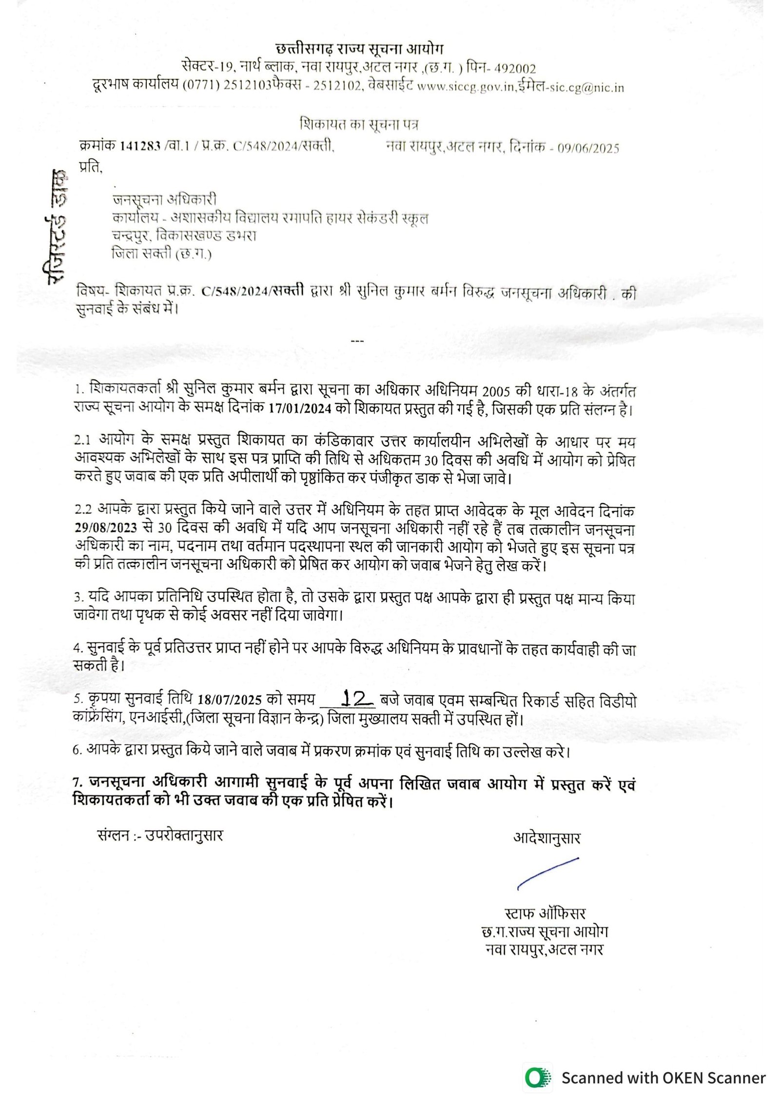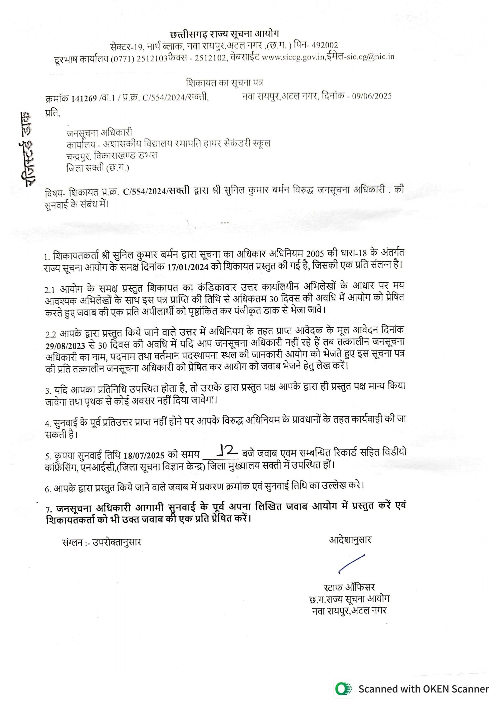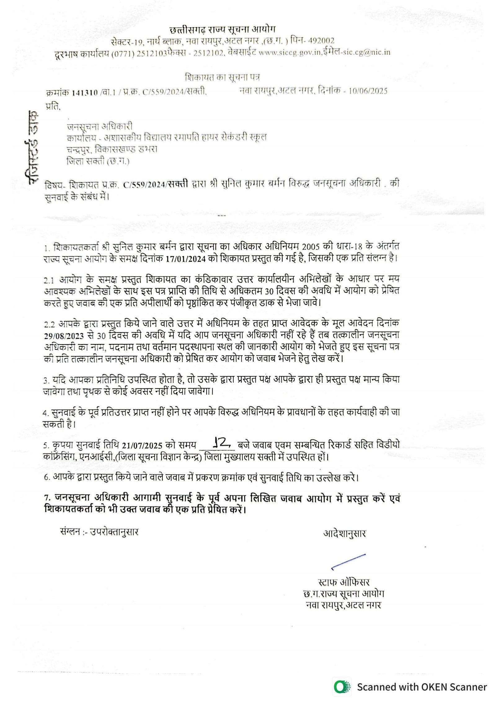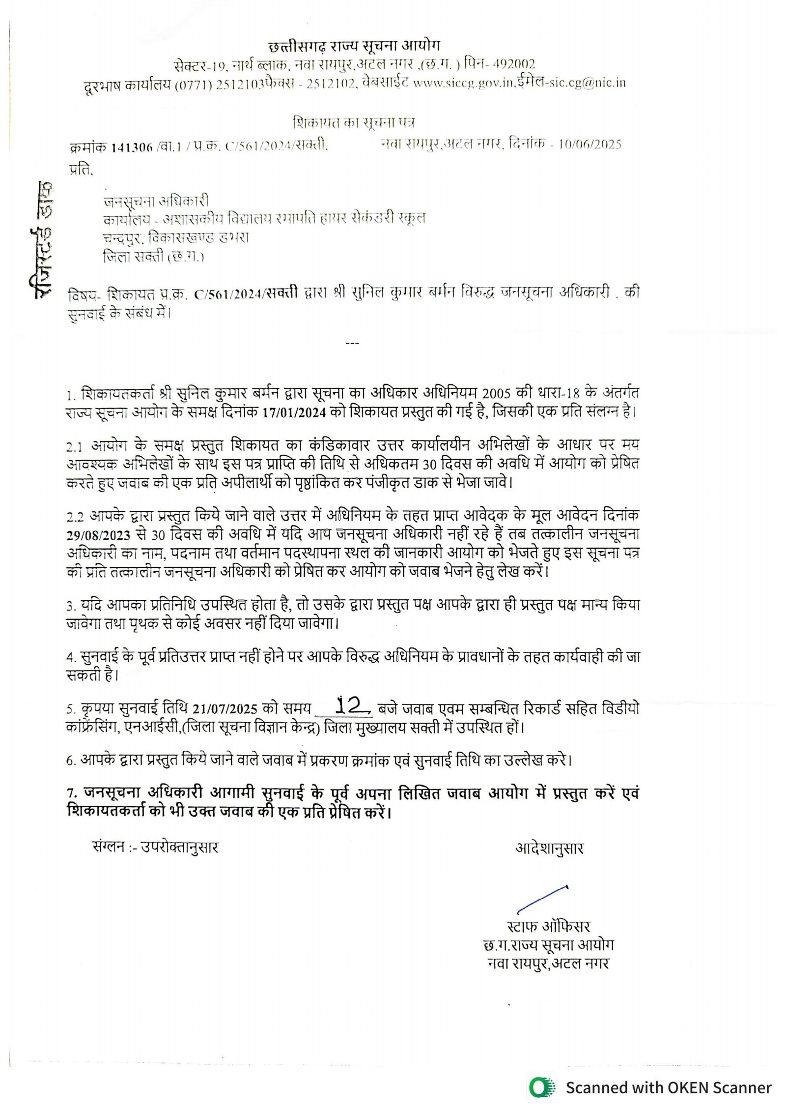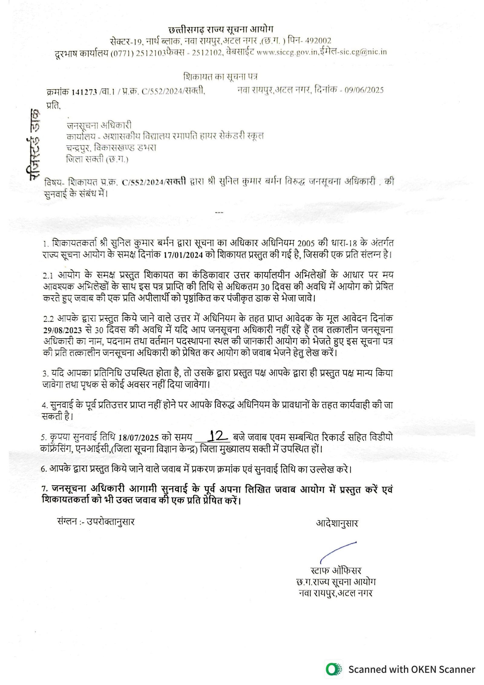 डभरा(एचकेपी 24 न्यूज)।सूचना का अधिकार 2005 के तहत् अलग-अलग विषय उल्लेखित 21 आवेदन पत्र प्रेषित कर मांगी गई सार्वजनिक करने योग्य सामान्य जानकारी को अशासकीय रमापति उच्चतर माध्यमिक विद्यालय चन्द्रपुर प्रबंधन ने स्वपित पोषित संस्था होने का हवाला देकर मांगी गई जानकारी को उपलब्ध करवाने अस्मर्थता व्यक्त करने पर आपत्ति जताते हुए हिन्देश एजुकेशन हेल्थ एण्ड वेलफेयर फाउण्डेशन(रजिस्टर्ड)के अध्यक्ष सुनिल कुमार बर्मन के द्वारा लिखित शिकायत किए जाने पर छत्तीसगढ़ राज्य सूचना आयोग ने सम्बंधित जन सूचना अधिकारी को 21 नोटिस पत्र जारी कर 18/07/2025 को जवाब एवं सम्बंधित रिकार्ड सहित विडियो कांफ्रेंसिंग एनआईसी जिला मुख्यालय सक्ती में उपस्थित होने के लिए आदेश पत्र जारी किया है।