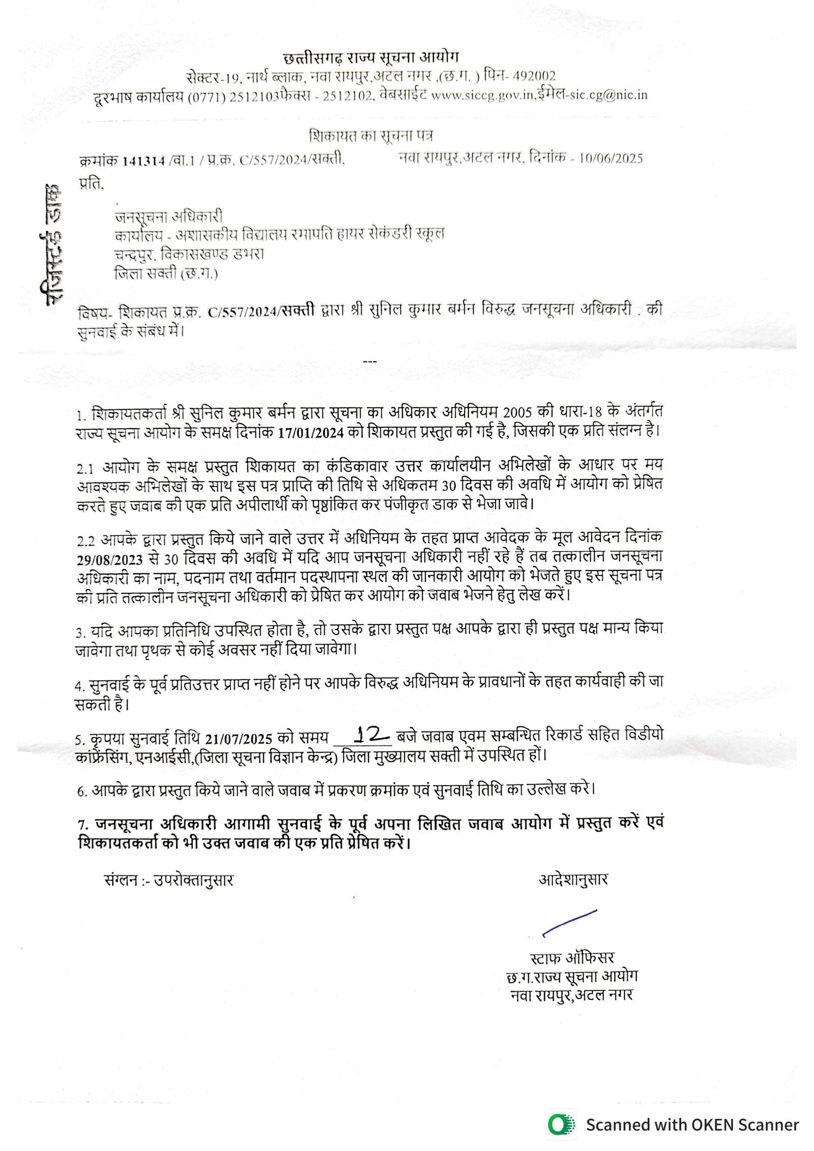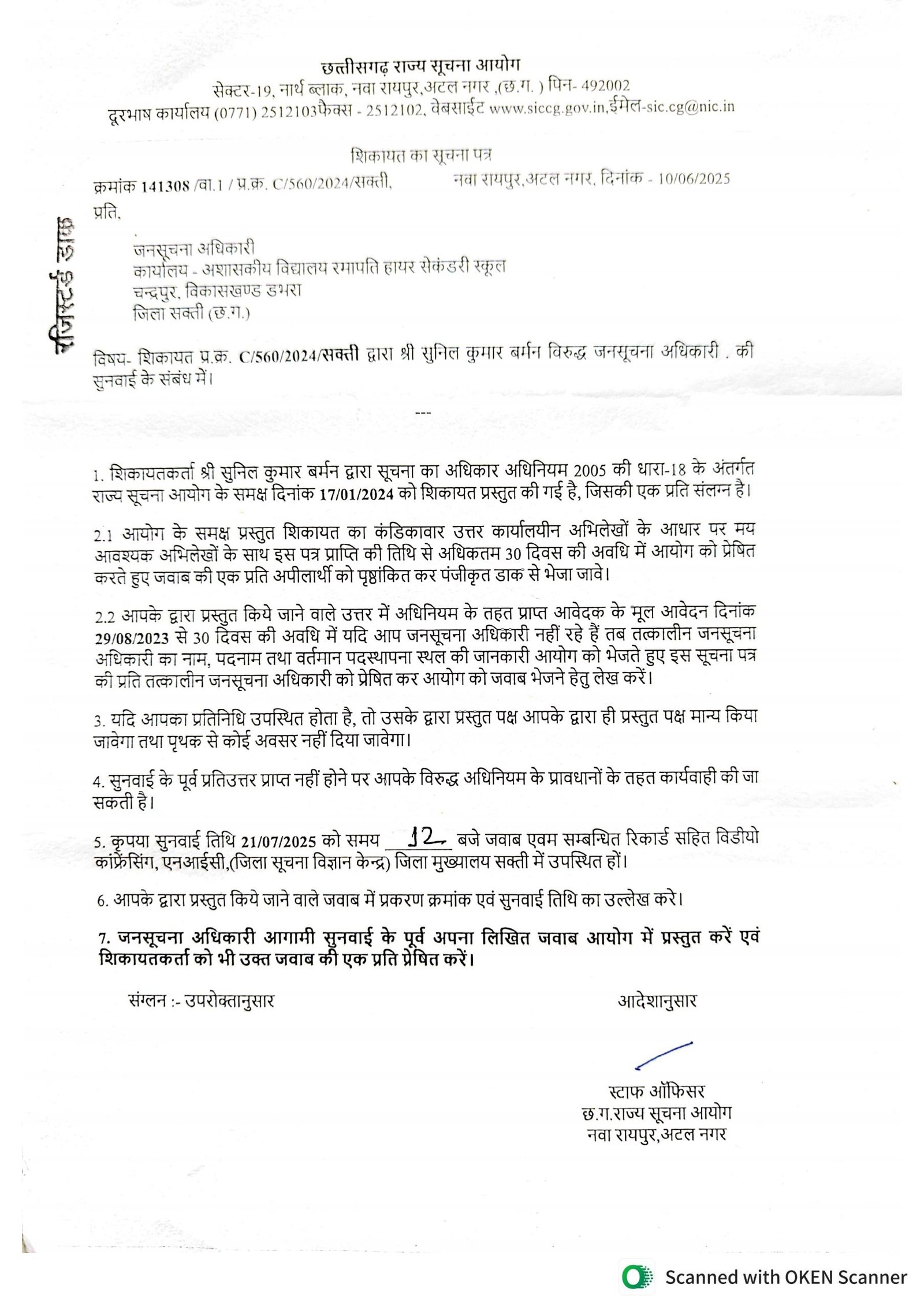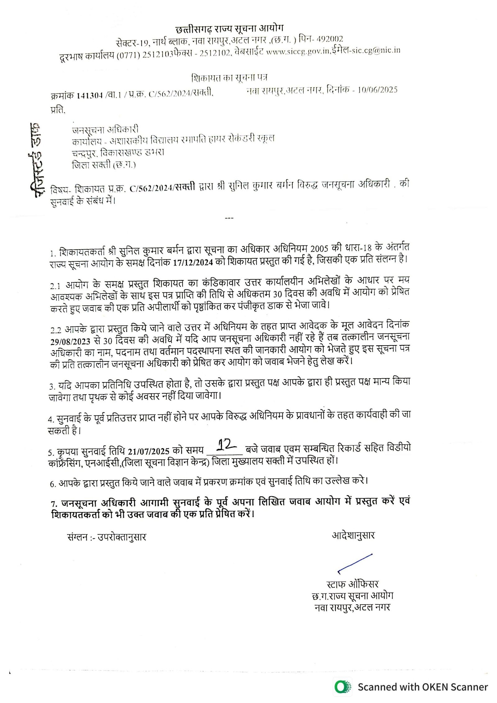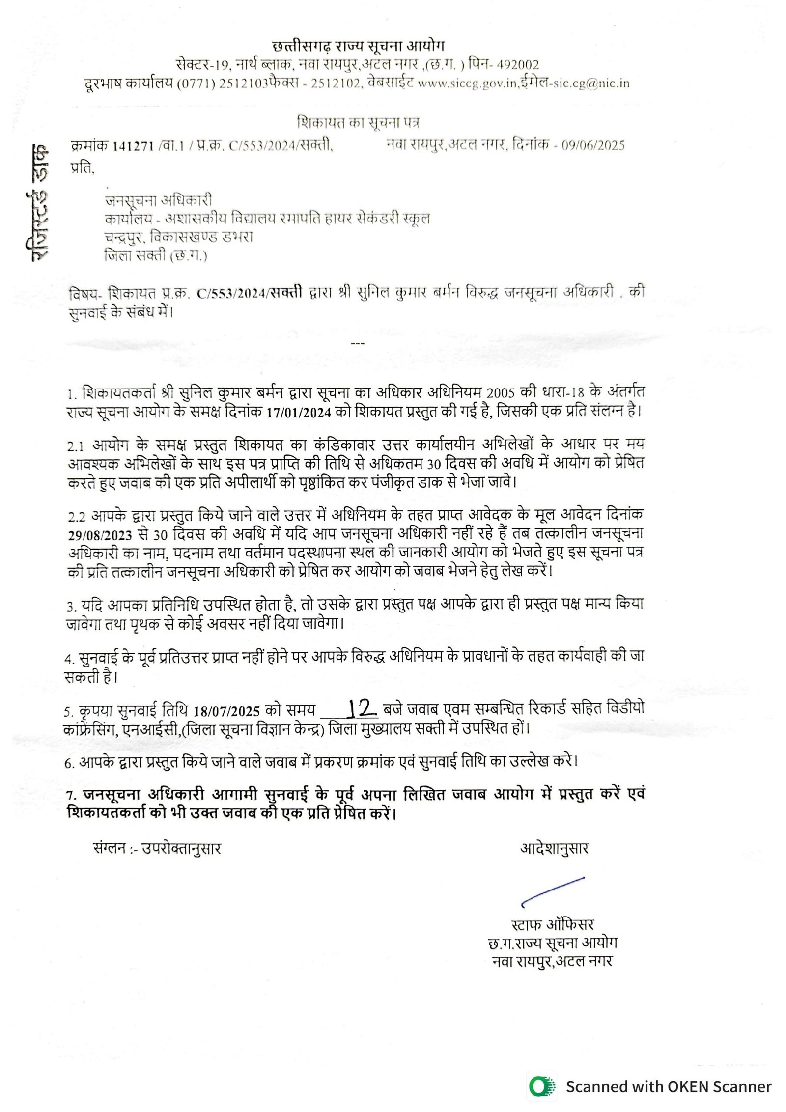 डभरा(एचकेपी 24 न्यूज)।सूचना का अधिकार 2005 के तहत् अलग-अलग विषय उल्लेखित 21 आवेदन पत्र प्रेषित कर मांगी गई सार्वजनिक करने योग्य सामान्य जानकारी को अशासकीय रमापति उच्चतर माध्यमिक विद्यालय चन्द्रपुर प्रबंधन ने स्वपित पोषित संस्था होने का हवाला देकर मांगी गई जानकारी को उपलब्ध करवाने अस्मर्थता व्यक्त करने पर आपत्ति जताते हुए हिन्देश एजुकेशन हेल्थ एण्ड वेलफेयर फाउण्डेशन(रजिस्टर्ड)के अध्यक्ष सुनिल कुमार बर्मन के द्वारा लिखित शिकायत किए जाने पर छत्तीसगढ़ राज्य सूचना आयोग ने सम्बंधित जन सूचना अधिकारी को 21 नोटिस पत्र जारी कर 18/07/2025 को जवाब एवं सम्बंधित रिकार्ड सहित विडियो कांफ्रेंसिंग एनआईसी जिला मुख्यालय सक्ती में उपस्थित होने के लिए आदेश पत्र जारी किया है।