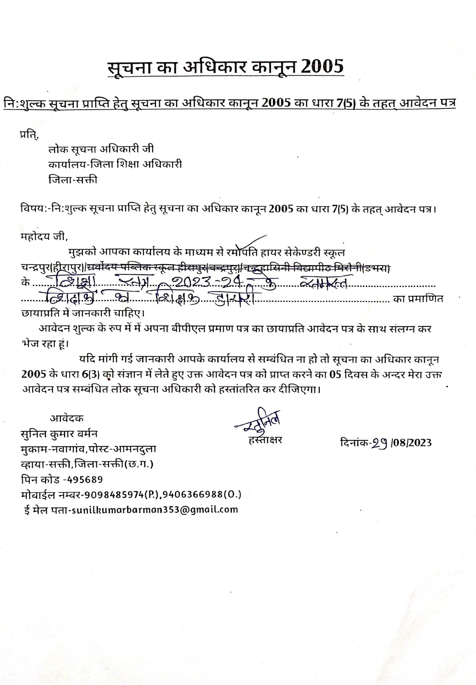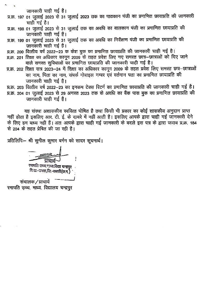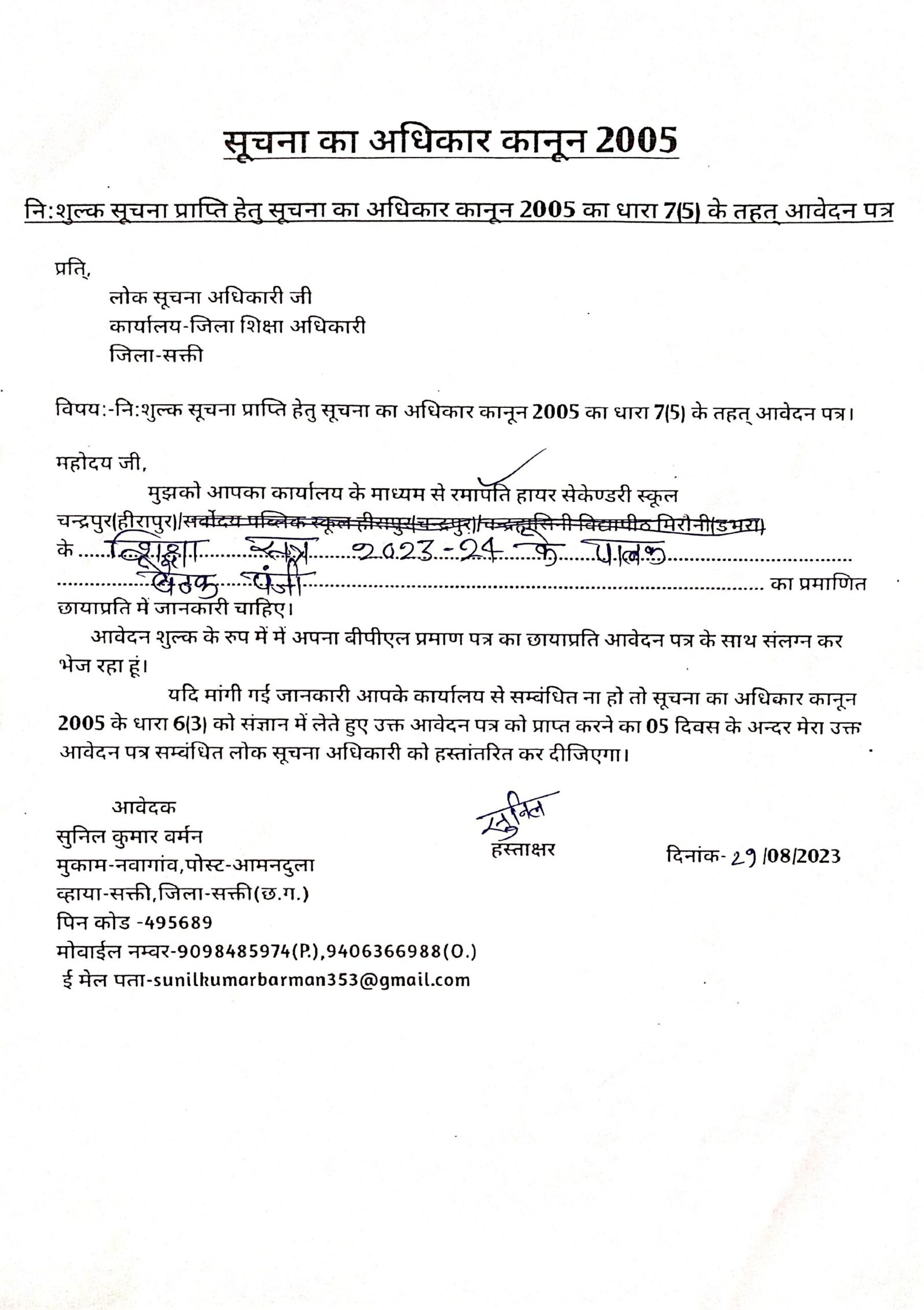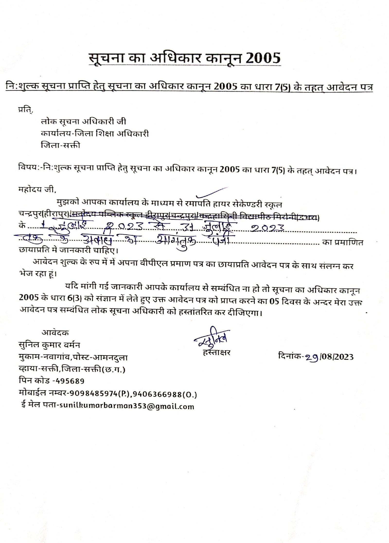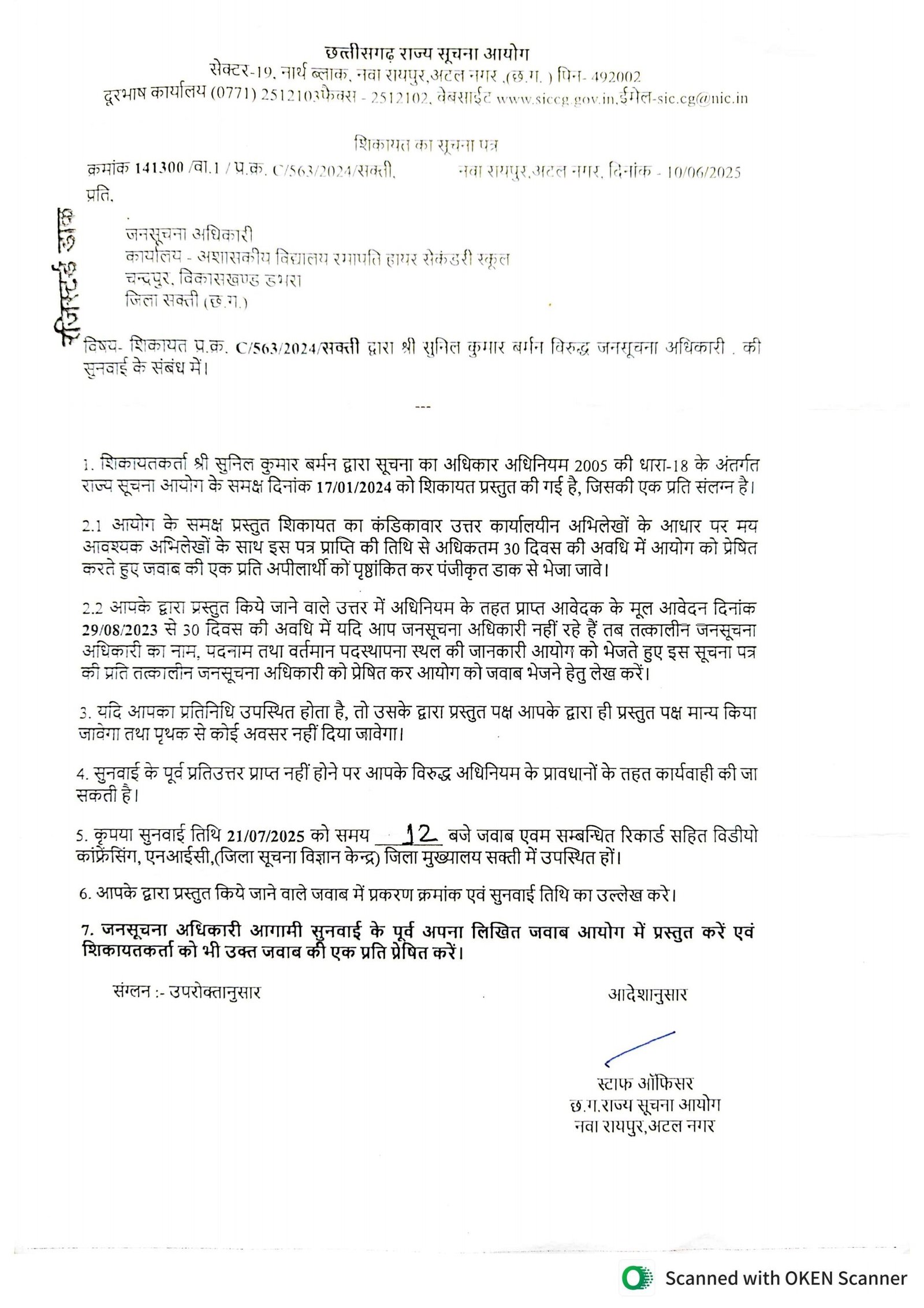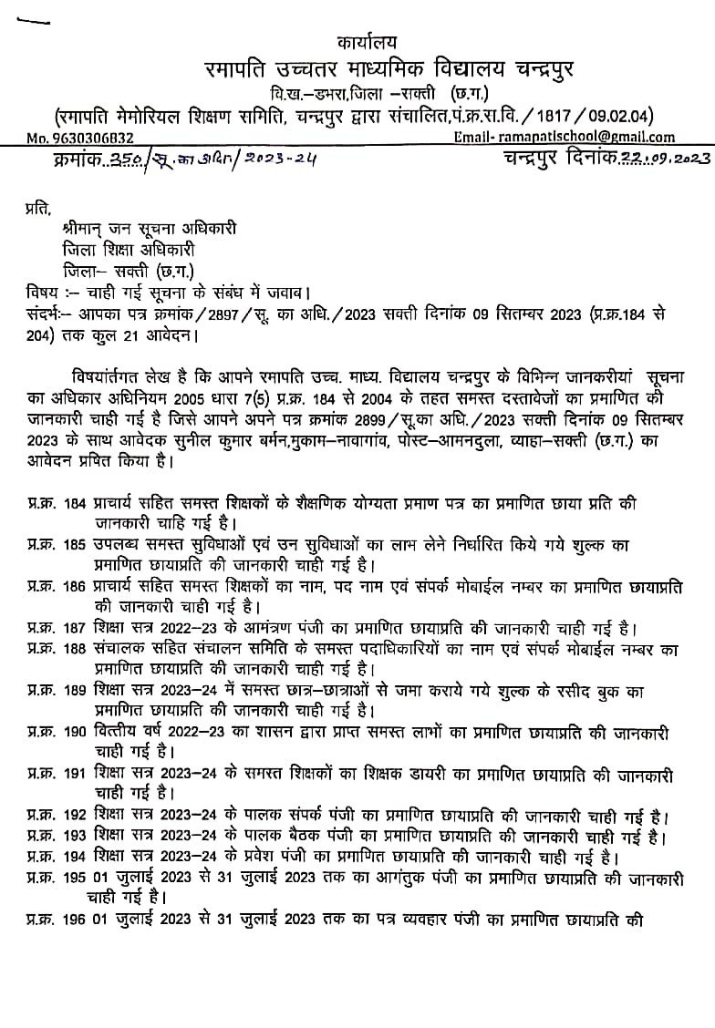 डभरा(एचकेपी 24 न्यूज)।सूचना का अधिकार 2005 के तहत् अलग-अलग विषय उल्लेखित 21 आवेदन पत्र प्रेषित कर मांगी गई सार्वजनिक करने योग्य सामान्य जानकारी को अशासकीय रमापति उच्चतर माध्यमिक विद्यालय चन्द्रपुर प्रबंधन ने स्वपित पोषित संस्था होने का हवाला देकर मांगी गई जानकारी को उपलब्ध करवाने अस्मर्थता व्यक्त करने पर आपत्ति जताते हुए हिन्देश एजुकेशन हेल्थ एण्ड वेलफेयर फाउण्डेशन(रजिस्टर्ड)के अध्यक्ष सुनिल कुमार बर्मन के द्वारा लिखित शिकायत किए जाने पर छत्तीसगढ़ राज्य सूचना आयोग ने सम्बंधित जन सूचना अधिकारी को 21 नोटिस पत्र जारी कर 18/07/2025 को जवाब एवं सम्बंधित रिकार्ड सहित विडियो कांफ्रेंसिंग एनआईसी जिला मुख्यालय सक्ती में उपस्थित होने के लिए आदेश पत्र जारी किया है।