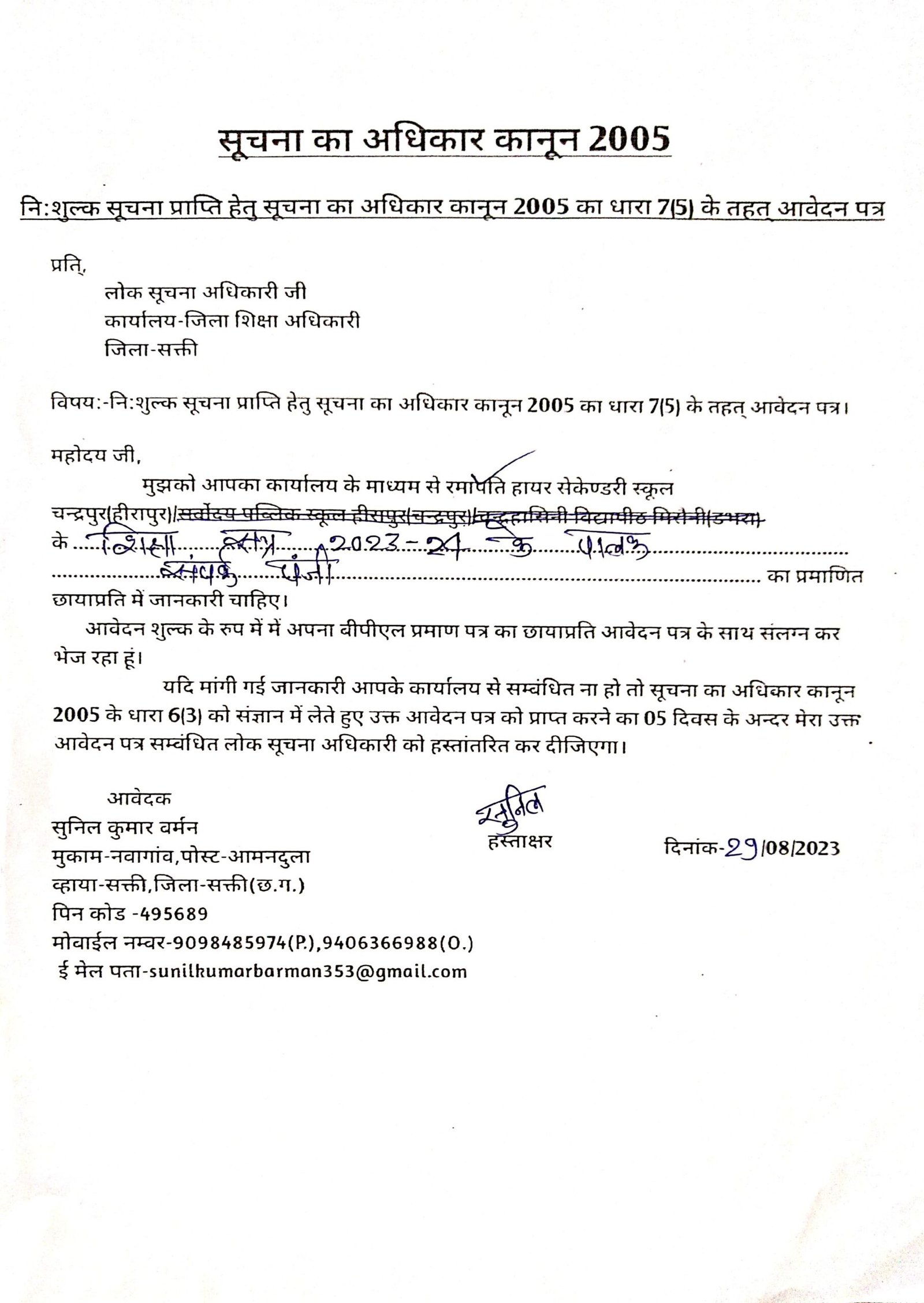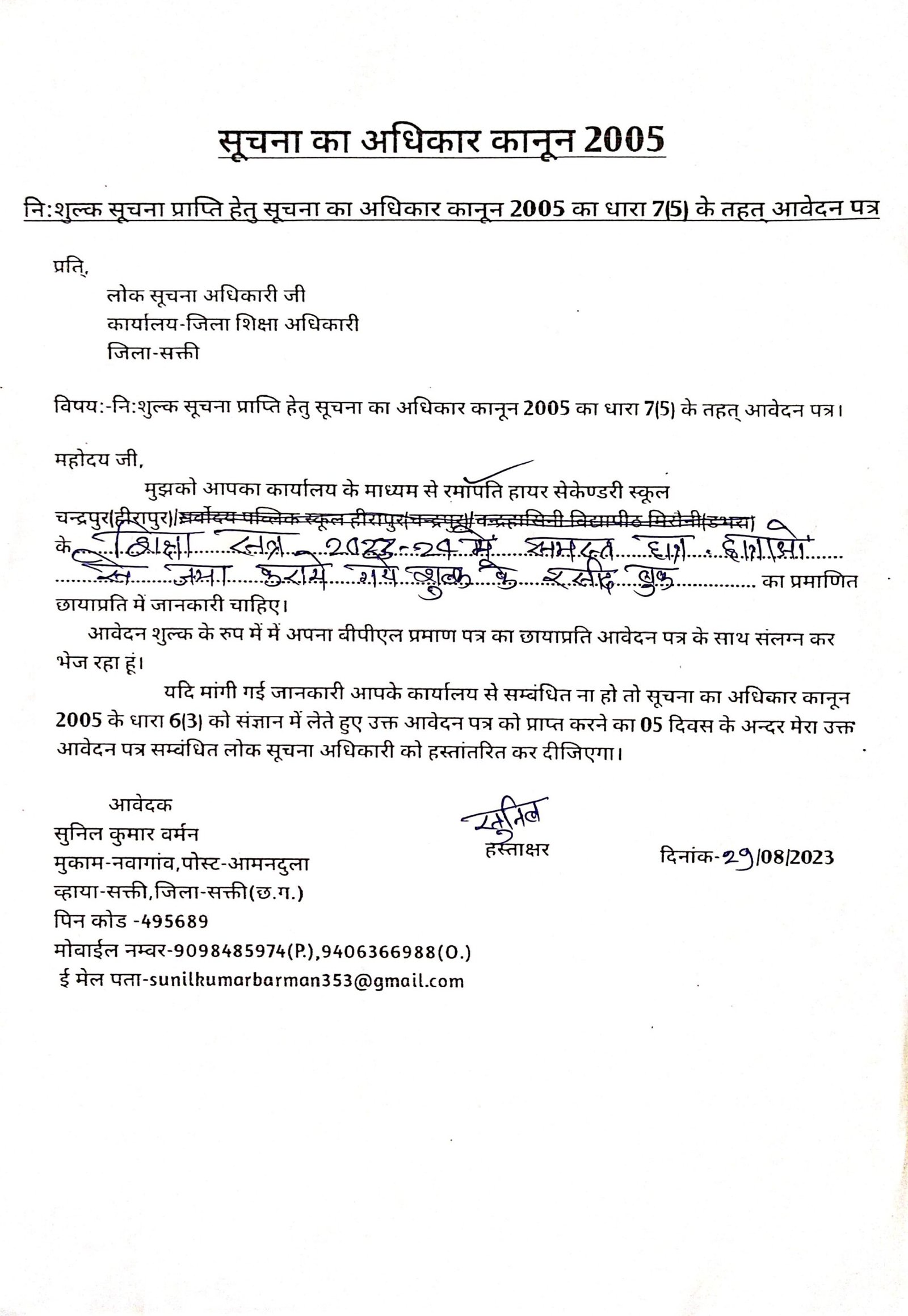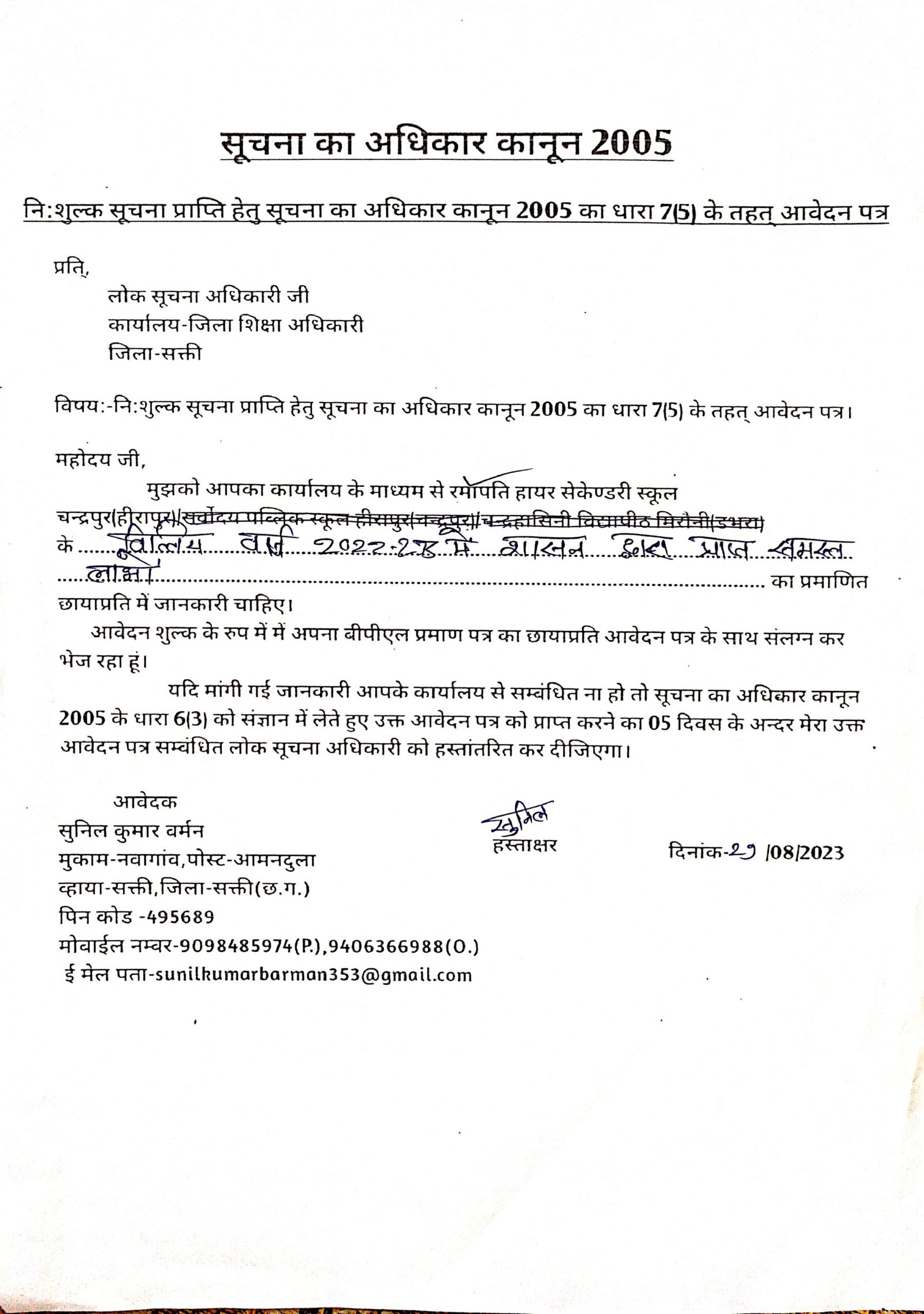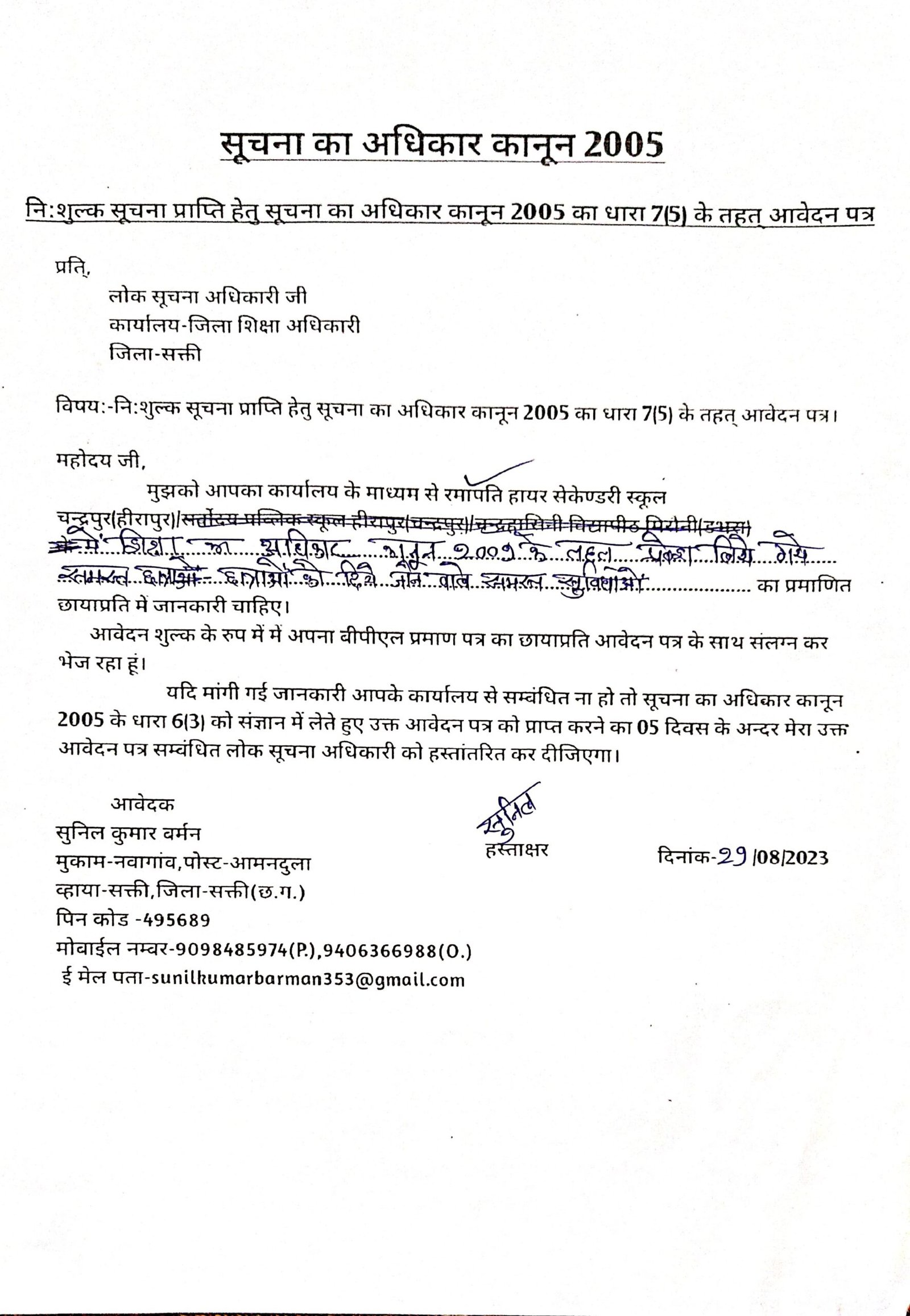 डभरा(एचकेपी 24 न्यूज)।सूचना का अधिकार 2005 के तहत् अलग-अलग विषय उल्लेखित 21 आवेदन पत्र प्रेषित कर मांगी गई सार्वजनिक करने योग्य सामान्य जानकारी को अशासकीय रमापति उच्चतर माध्यमिक विद्यालय चन्द्रपुर प्रबंधन ने स्वपित पोषित संस्था होने का हवाला देकर मांगी गई जानकारी को उपलब्ध करवाने अस्मर्थता व्यक्त करने पर आपत्ति जताते हुए हिन्देश एजुकेशन हेल्थ एण्ड वेलफेयर फाउण्डेशन(रजिस्टर्ड)के अध्यक्ष सुनिल कुमार बर्मन के द्वारा लिखित शिकायत किए जाने पर छत्तीसगढ़ राज्य सूचना आयोग ने सम्बंधित जन सूचना अधिकारी को 21 नोटिस पत्र जारी कर 18/07/2025 को जवाब एवं सम्बंधित रिकार्ड सहित विडियो कांफ्रेंसिंग एनआईसी जिला मुख्यालय सक्ती में उपस्थित होने के लिए आदेश पत्र जारी किया है।