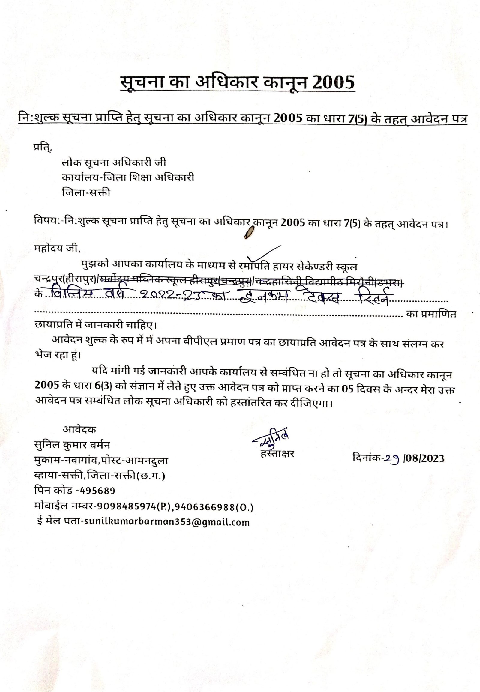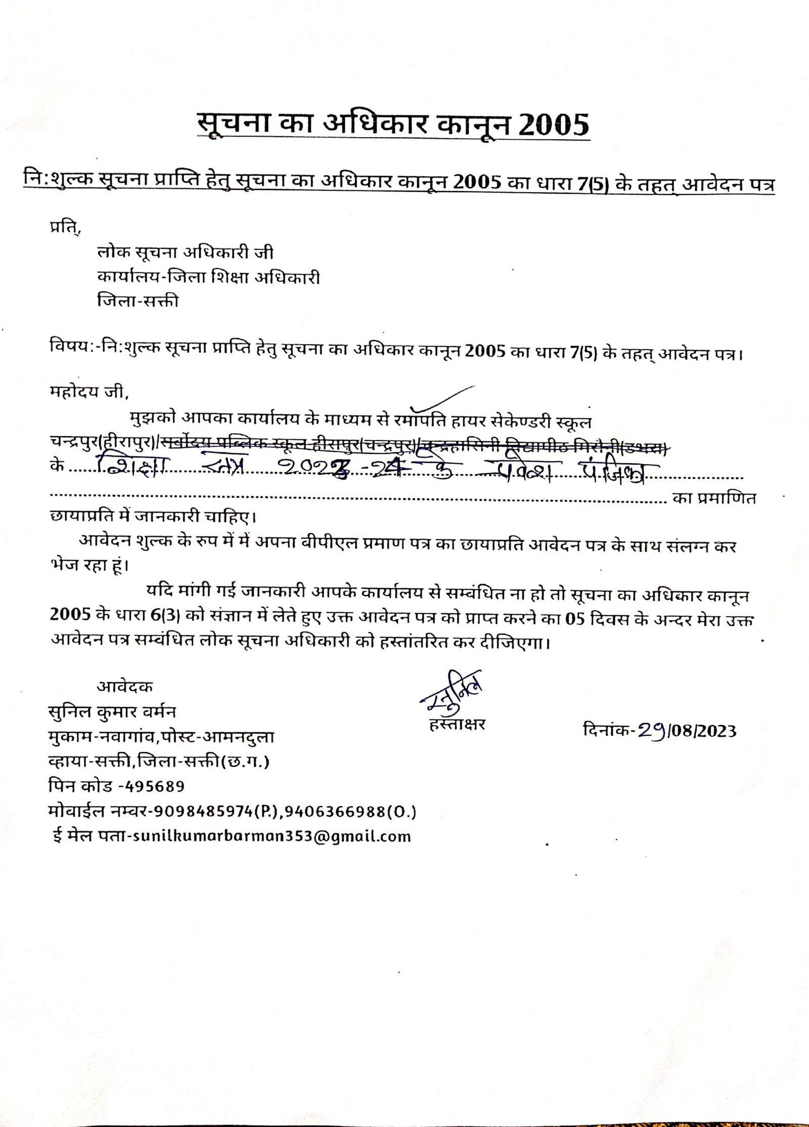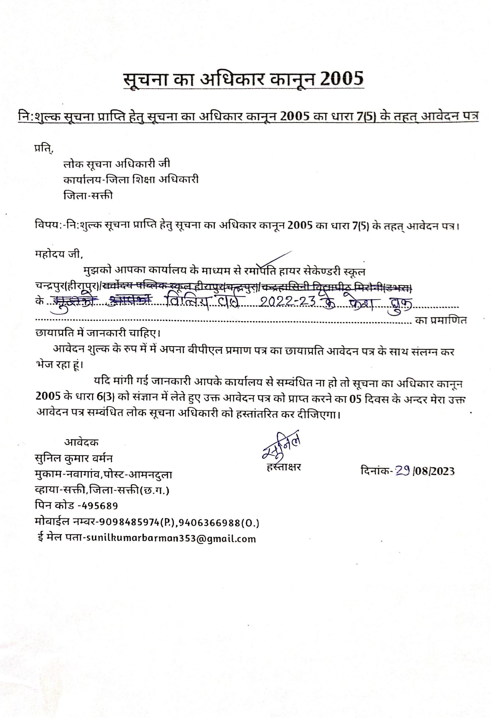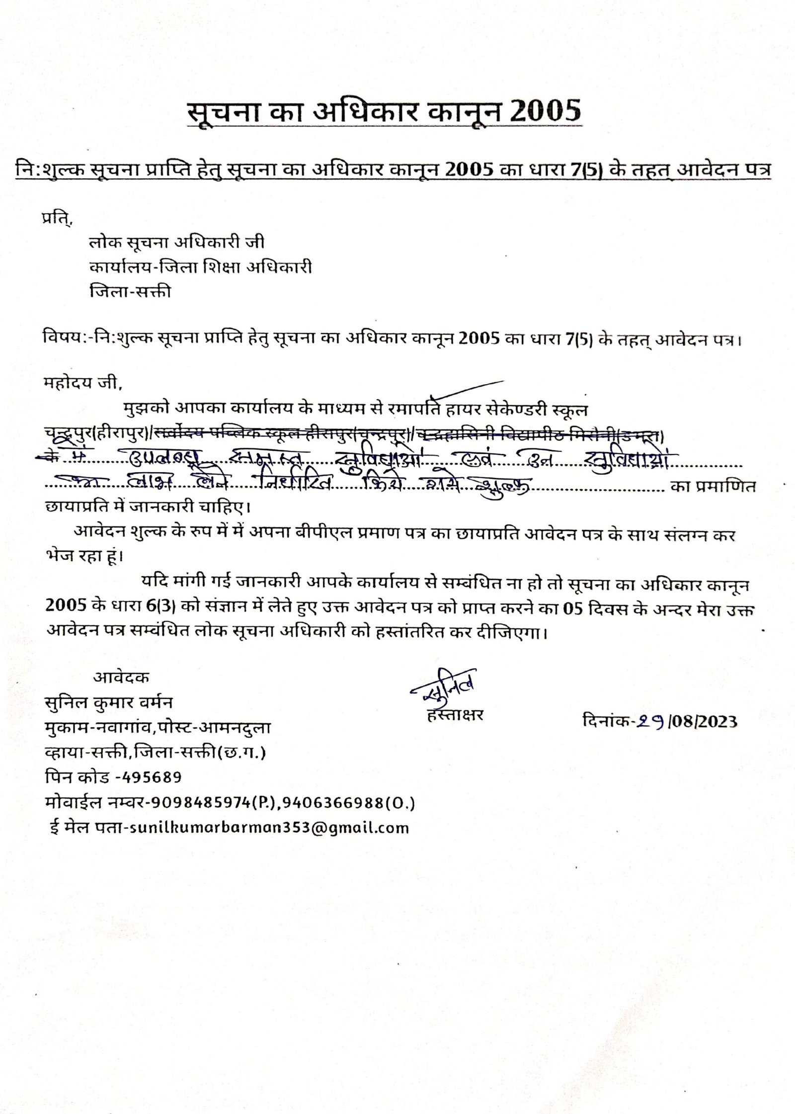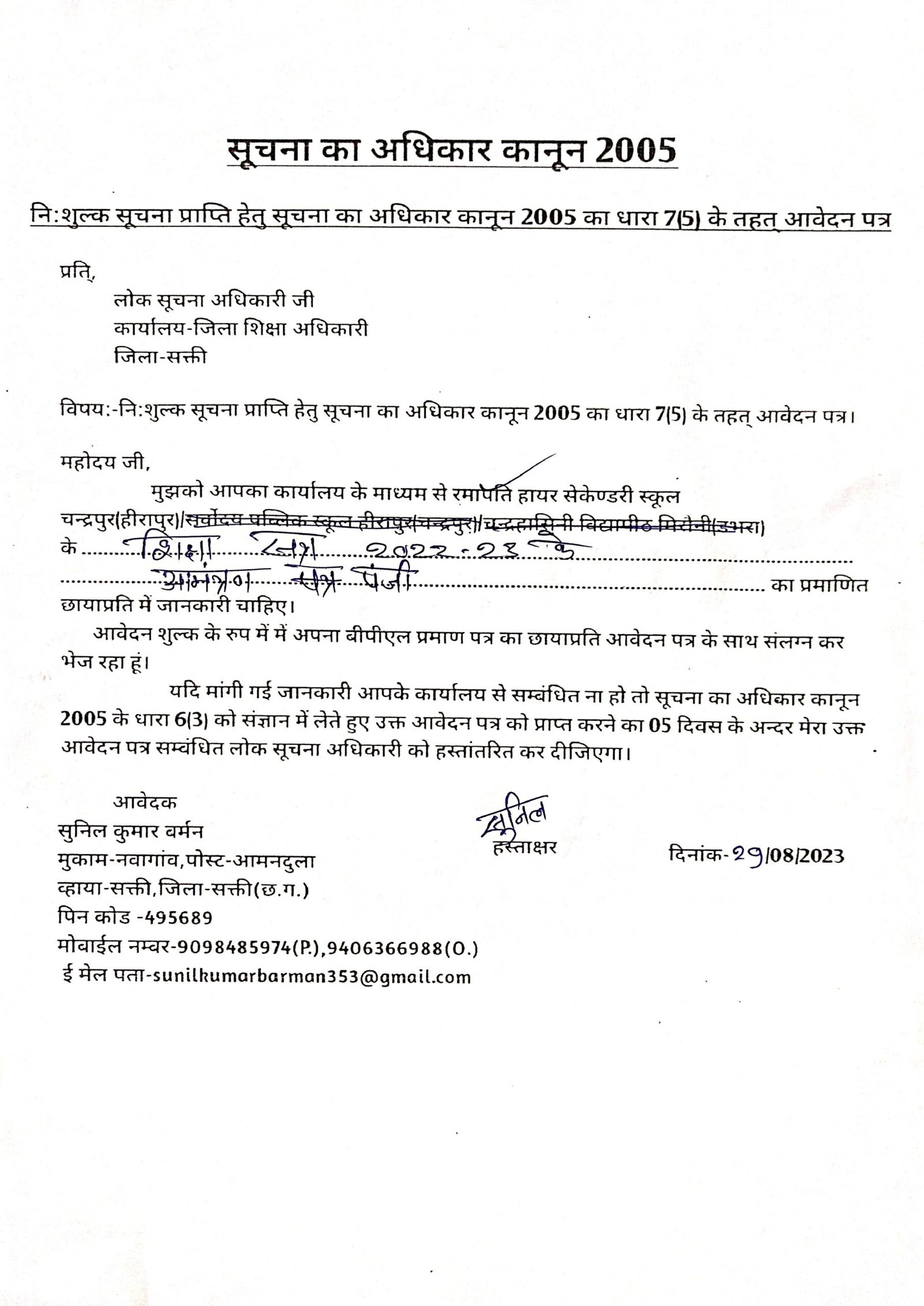 डभरा(एचकेपी 24 न्यूज)।सूचना का अधिकार 2005 के तहत् अलग-अलग विषय उल्लेखित 21 आवेदन पत्र प्रेषित कर मांगी गई सार्वजनिक करने योग्य सामान्य जानकारी को अशासकीय रमापति उच्चतर माध्यमिक विद्यालय चन्द्रपुर प्रबंधन ने स्वपित पोषित संस्था होने का हवाला देकर मांगी गई जानकारी को उपलब्ध करवाने अस्मर्थता व्यक्त करने पर आपत्ति जताते हुए हिन्देश एजुकेशन हेल्थ एण्ड वेलफेयर फाउण्डेशन(रजिस्टर्ड)के अध्यक्ष सुनिल कुमार बर्मन के द्वारा लिखित शिकायत किए जाने पर छत्तीसगढ़ राज्य सूचना आयोग ने सम्बंधित जन सूचना अधिकारी को 21 नोटिस पत्र जारी कर 18/07/2025 को जवाब एवं सम्बंधित रिकार्ड सहित विडियो कांफ्रेंसिंग एनआईसी जिला मुख्यालय सक्ती में उपस्थित होने के लिए आदेश पत्र जारी किया है।