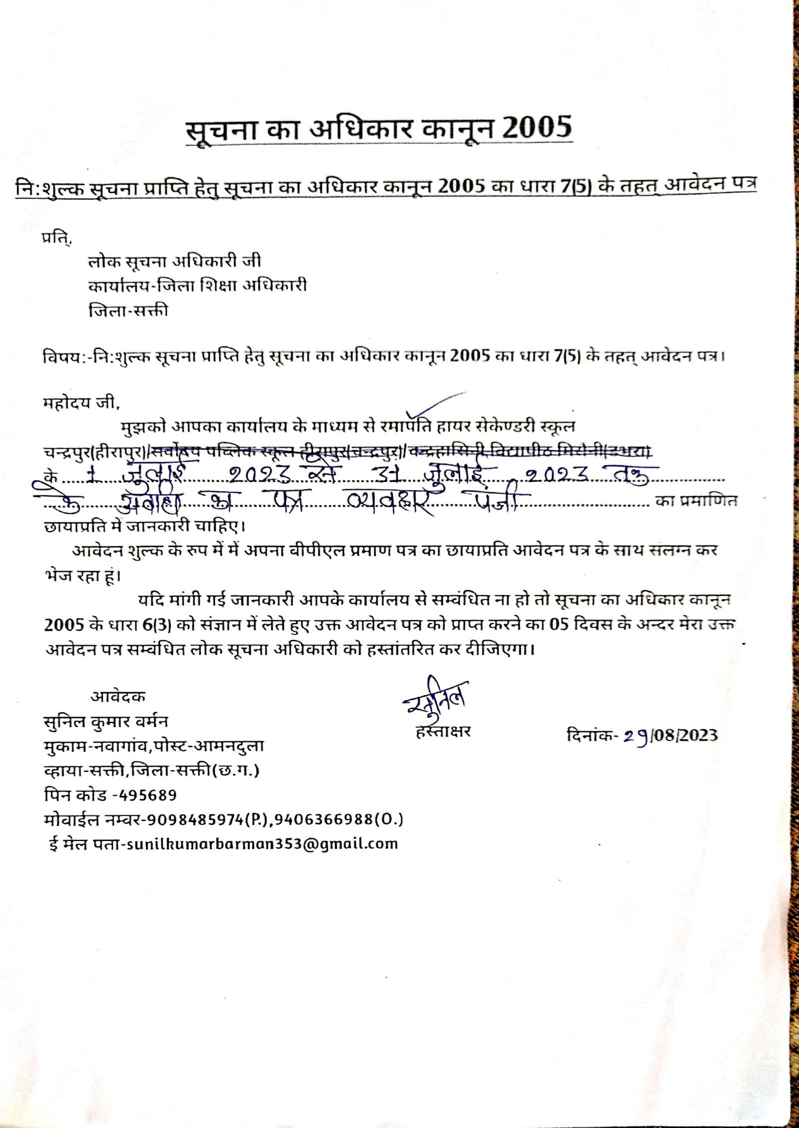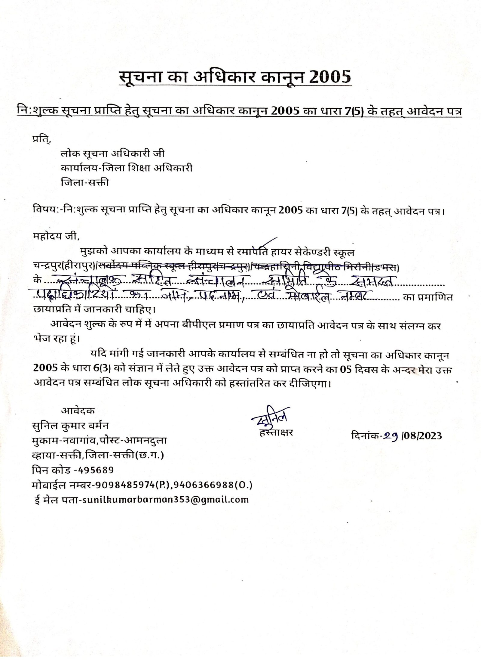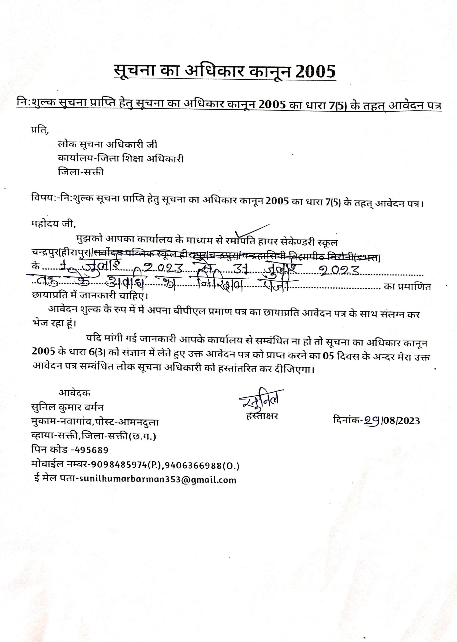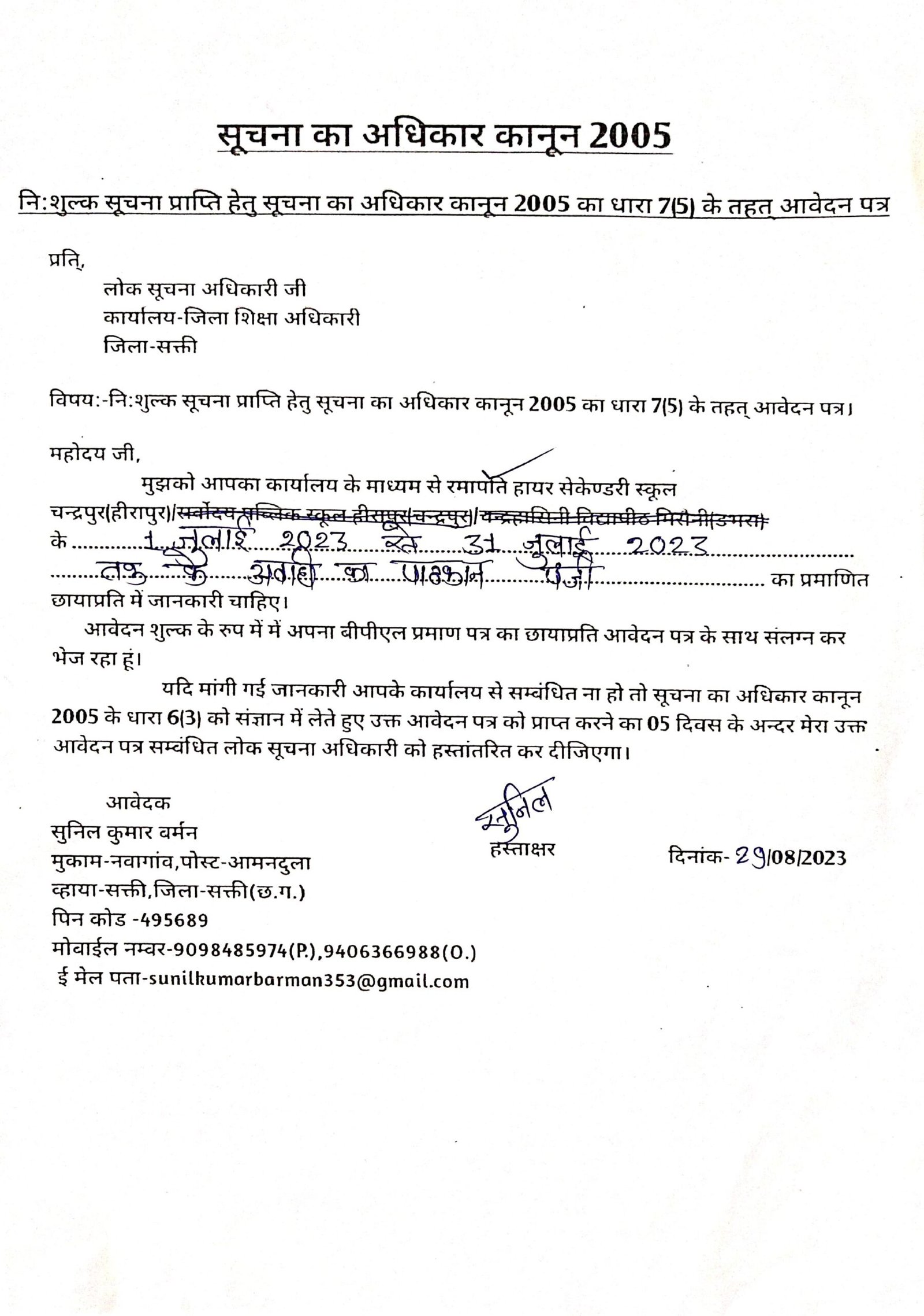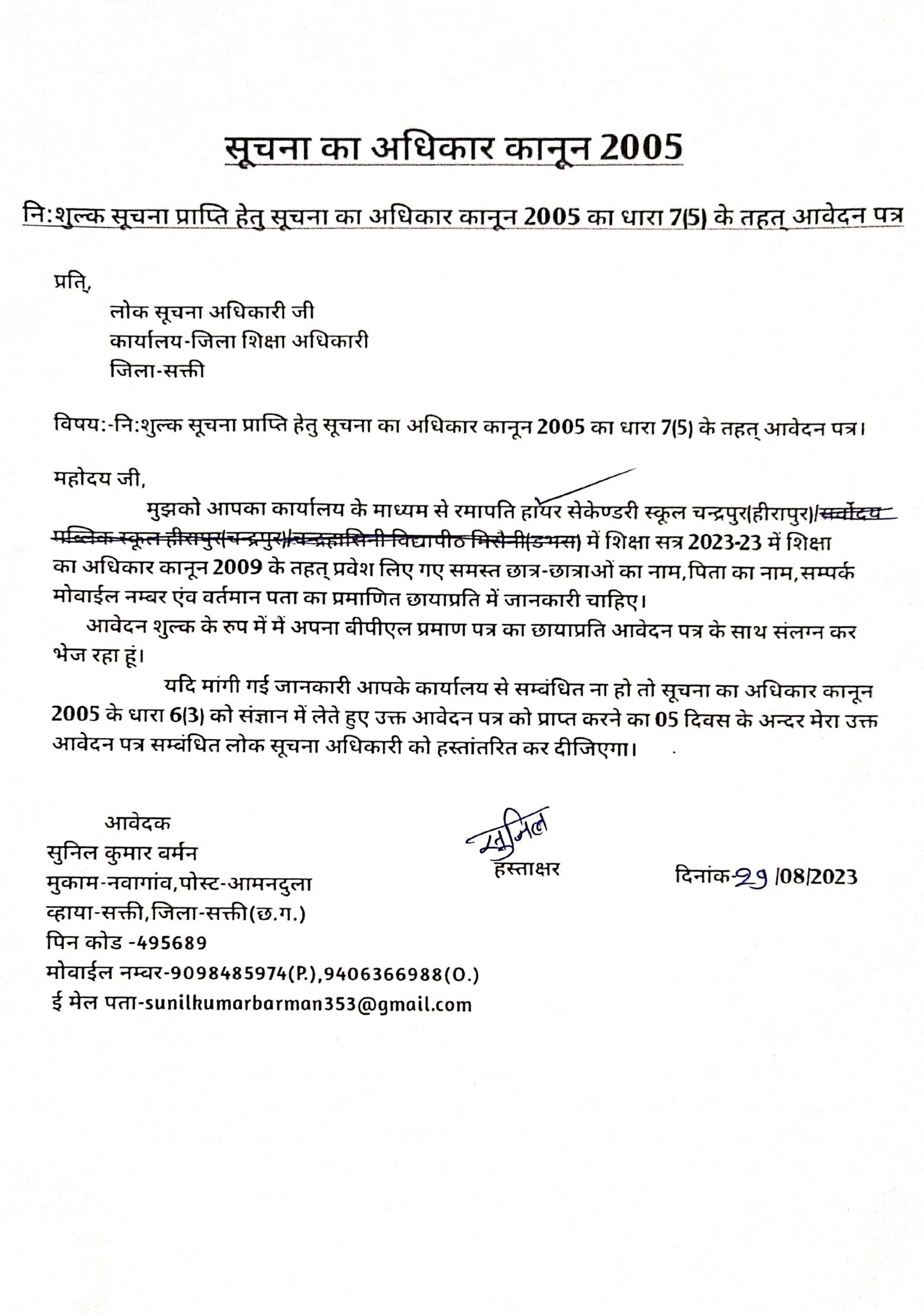 डभरा(एचकेपी 24 न्यूज)।सूचना का अधिकार 2005 के तहत् अलग-अलग विषय उल्लेखित 21 आवेदन पत्र प्रेषित कर मांगी गई सार्वजनिक करने योग्य सामान्य जानकारी को अशासकीय रमापति उच्चतर माध्यमिक विद्यालय चन्द्रपुर प्रबंधन ने स्वपित पोषित संस्था होने का हवाला देकर मांगी गई जानकारी को उपलब्ध करवाने अस्मर्थता व्यक्त करने पर आपत्ति जताते हुए हिन्देश एजुकेशन हेल्थ एण्ड वेलफेयर फाउण्डेशन(रजिस्टर्ड)के अध्यक्ष सुनिल कुमार बर्मन के द्वारा लिखित शिकायत किए जाने पर छत्तीसगढ़ राज्य सूचना आयोग ने सम्बंधित जन सूचना अधिकारी को 21 नोटिस पत्र जारी कर 18/07/2025 को जवाब एवं सम्बंधित रिकार्ड सहित विडियो कांफ्रेंसिंग एनआईसी जिला मुख्यालय सक्ती में उपस्थित होने के लिए आदेश पत्र जारी किया है।