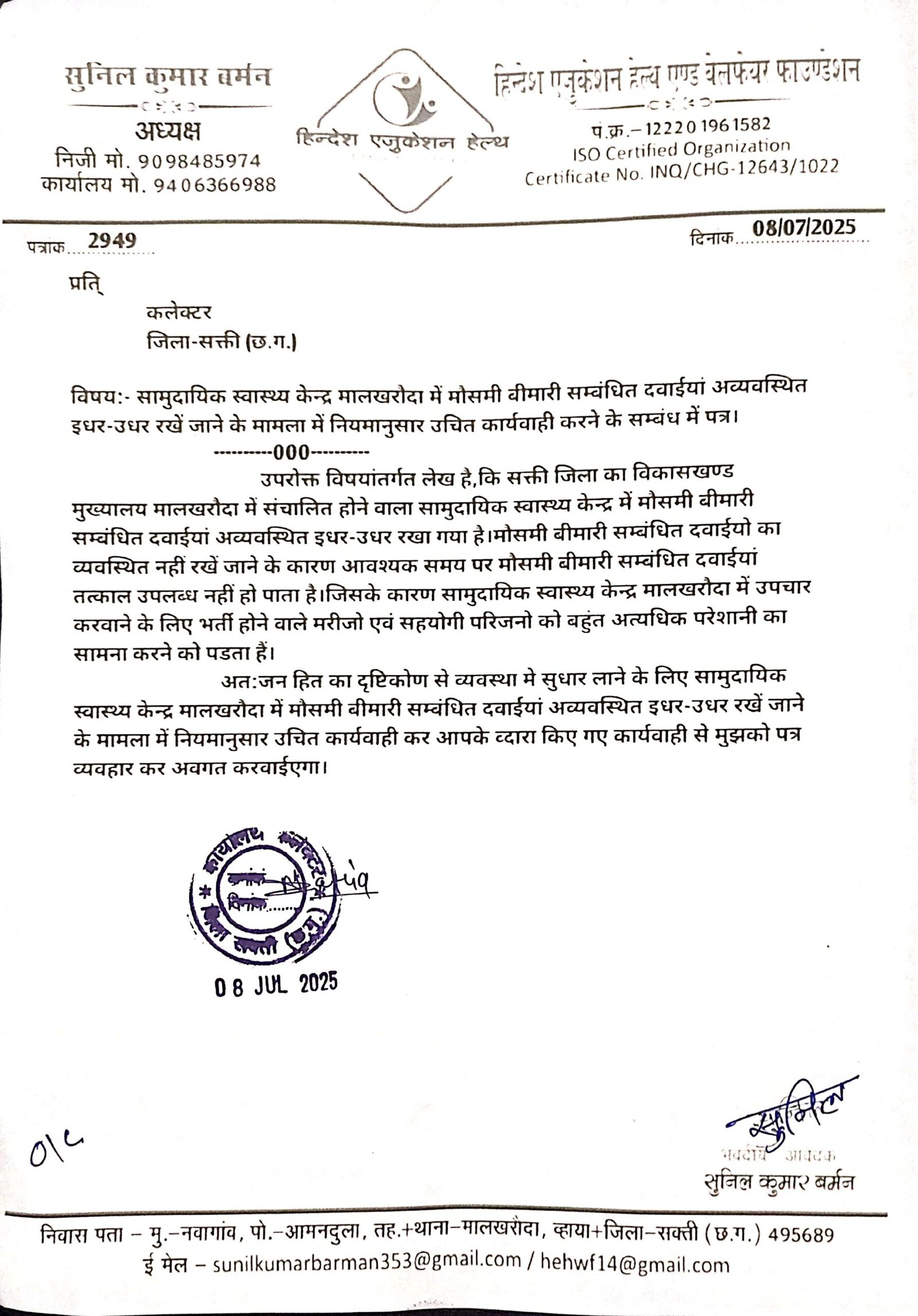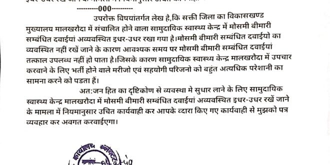 मालखरौदा(एचकेपी 24 न्यूज)।सामुदायिक स्वास्थ्य केन्द्र मालखरौदा में मौसमी बीमारी सम्बंधित दवाईयां अव्यवस्थित इधर-उधर रखें जाने से मरीजो को दवाईया विलम्ब से मिलने की मामला का संज्ञान में आने पर हिन्देश एजुकेशन हेल्थ एण्ड वेलफेयर फाउण्डेशन (रजिस्टर्ड)के अध्यक्ष सुनिल कुमार बर्मन ने जन हित का दृष्टिकोण से व्यवस्था में सुधार लाने नियमानुसार उचित कार्यवाही करने कलेक्टर को पत्र लिखा है।