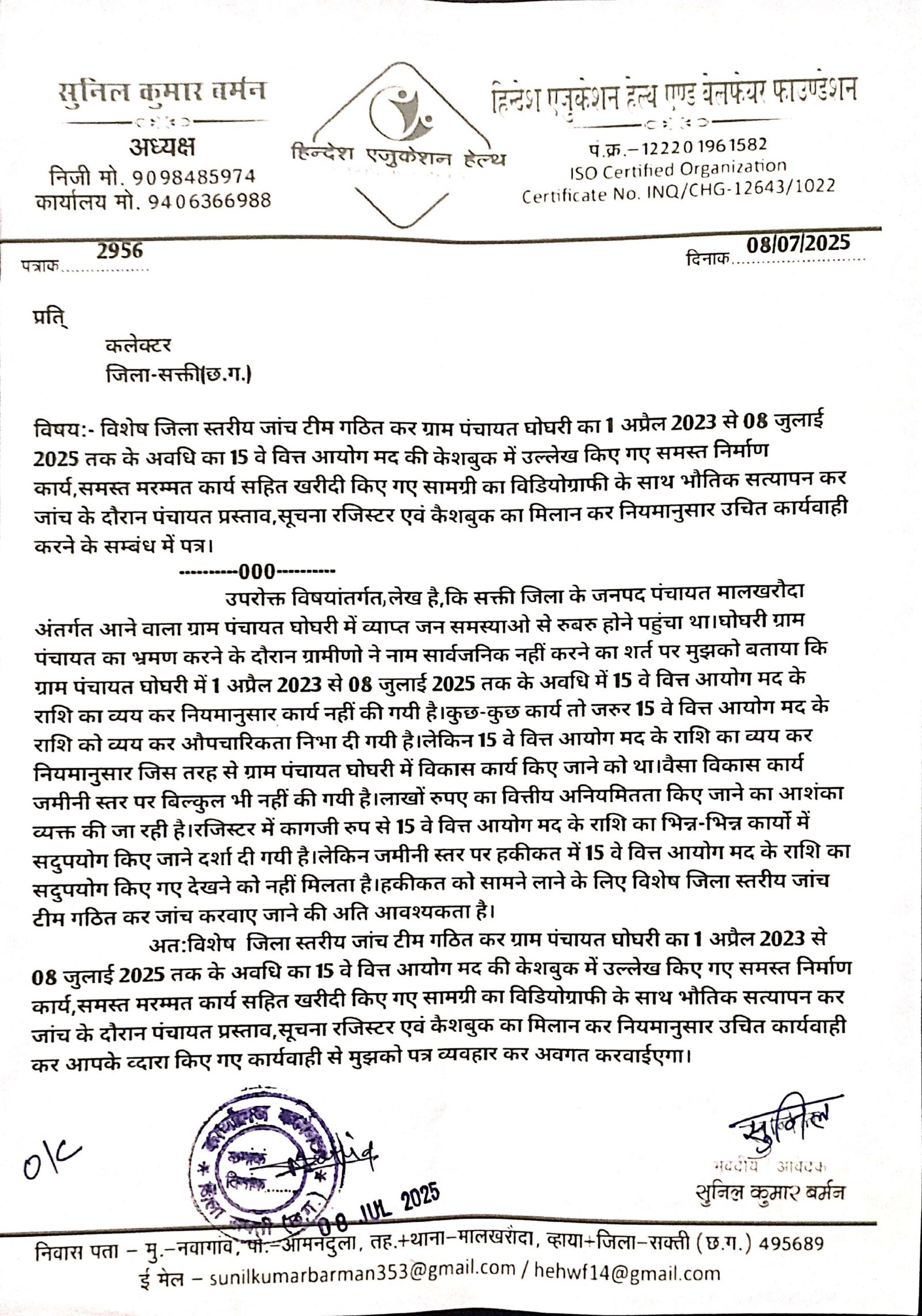 मालखरौदा(एचकेपी 24 न्यूज)।15 वे वित्त आयोग मद के राशि का गड़बड़ी किए जाने की जन शिकायत संज्ञान में आने पर हिन्देश एजुकेशन हेल्थ एण्ड वेलफेयर फाउण्डेशन (रजिस्टर्ड) के अध्यक्ष सुनिल कुमार बर्मन ने विशेष जिला स्तरीय जांच टीम गठित कर ग्राम पंचायत घोघरी का 1 अप्रैल 2023 से 08 जुलाई 2025 तक के अवधि का 15 वे वित्त आयोग मद की केशबुक में उल्लेख किए गए समस्त निर्माण कार्य,समस्त मरम्मत कार्य सहित खरीदी किए गए सामग्री का विडियोग्राफी के साथ भौतिक सत्यापन कर जांच के दौरान पंचायत प्रस्ताव,सूचना रजिस्टर एवं कैशबुक का मिलान कर नियमानुसार उचित कार्यवाही करने कलेक्टर को पत्र लिखा है।