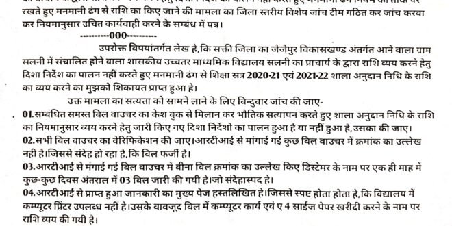 जैजैपुर(एचकेपी 24 न्यूज)।शिक्षा सत्र 2020-21 एवं 21-22 का शाला अनुदान निधि के राशि के शाउमावि सलनी का प्राचार्य ने तय दिशा निर्देशो का पालन नहीं करते हुए मनमानी ढंग से व्यय कर वित्तीय अनियमितता किए जाने की शिकायत प्राप्त होने पर आरटीआई से मांगी गई जानकारी में कम्प्यूटराईज्ड पत्र तैयार करने के बजाय हस्तलिखित पत्र बनाने से कम्प्यूटर कार्य के नाम पर व्यय किए गए राशि,ए 4 साईज पेपर खरीदी करने बिल तैयार करवाए जाने,सेव बूंदी नाश्ता खरीदी करने के नाम पर बिल तैयार करवाए जाने एवं तीन बार डिस्टेंपर के नाम पर एक ही माह में बीना क्रमांक का रसीद से राशि भुगतान किए जाने से घोटाला होने की आशंका बढ़ने पर हिन्देश एजुकेशन हेल्थ एण्ड वेलफेयर फाउण्डेशन के अध्यक्ष सुनिल कुमार बर्मन ने कलेक्टर को जिला स्तरीय विशेष जांच टीम गठित कर भौतिक सत्यापन करवा कर नियमानुसार उचित करने के लिए पत्र लिखा है।