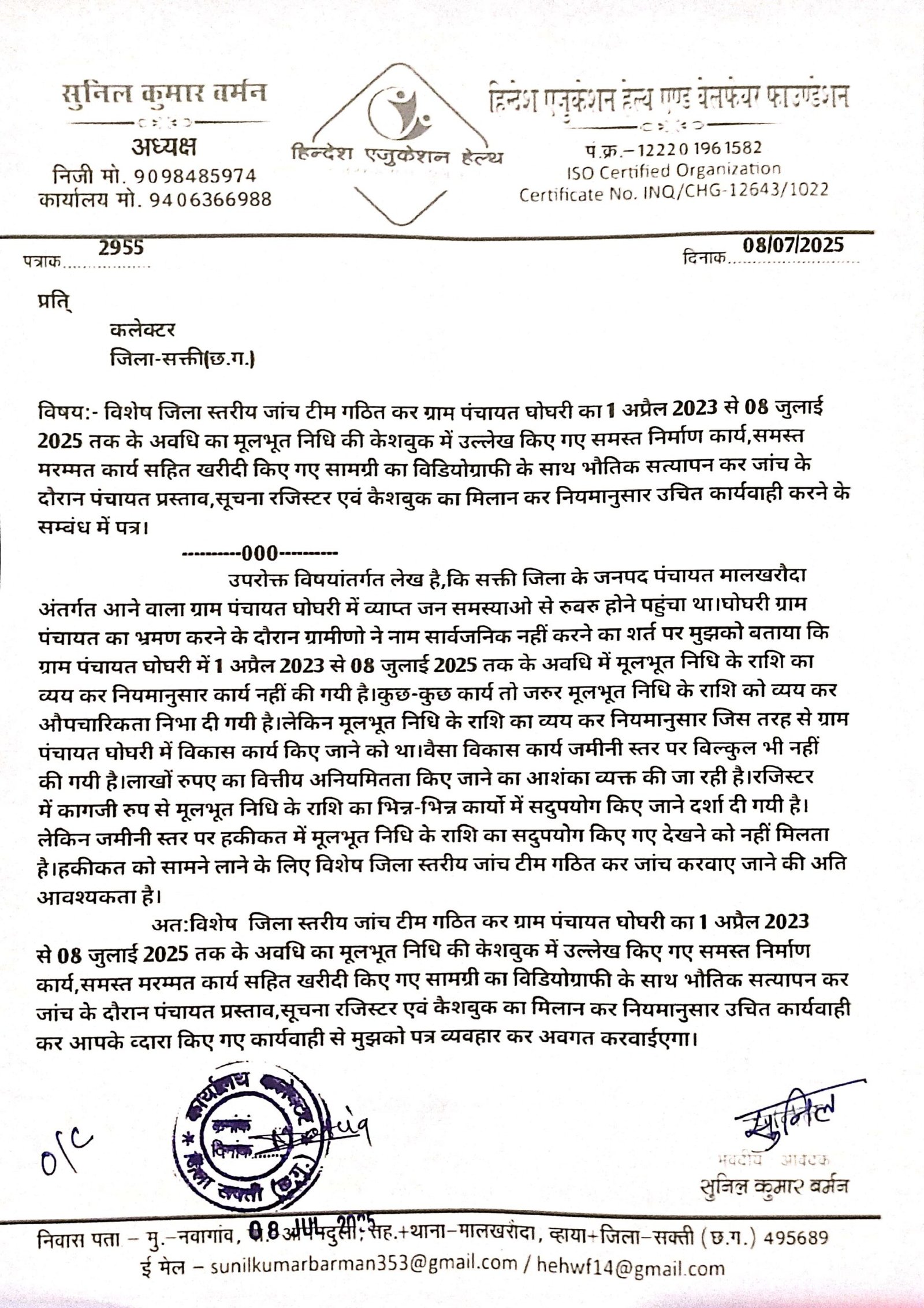 मालखरौदा(एचकेपी 24 न्यूज)।मूलभूत निधि के राशि का गड़बड़ी किए जाने की जन शिकायत संज्ञान में आने पर हिन्देश एजुकेशन हेल्थ एण्ड वेलफेयर फाउण्डेशन (रजिस्टर्ड) के अध्यक्ष सुनिल कुमार बर्मन ने विशेष जिला स्तरीय जांच टीम गठित कर ग्राम पंचायत घोघरी का 1 अप्रैल 2023 से 08 जुलाई 2025 तक के अवधि का मूलभूत निधि की केशबुक में उल्लेख किए गए समस्त निर्माण कार्य,समस्त मरम्मत कार्य सहित खरीदी किए गए सामग्री का विडियोग्राफी के साथ भौतिक सत्यापन कर जांच के दौरान पंचायत प्रस्ताव,सूचना रजिस्टर एवं कैशबुक का मिलान कर नियमानुसार उचित कार्यवाही करने कलेक्टर को पत्र लिखा है।